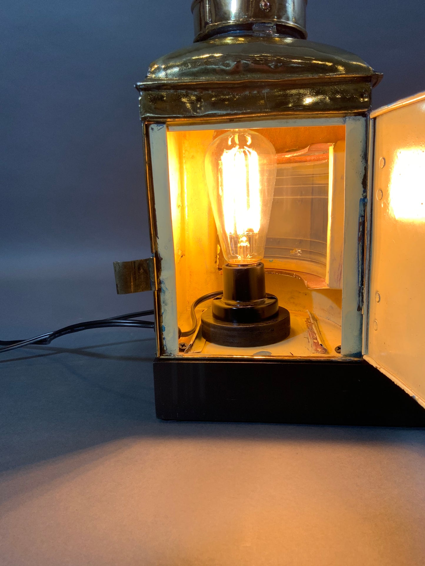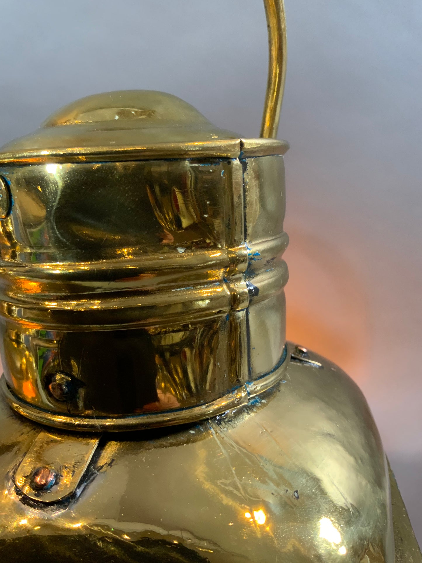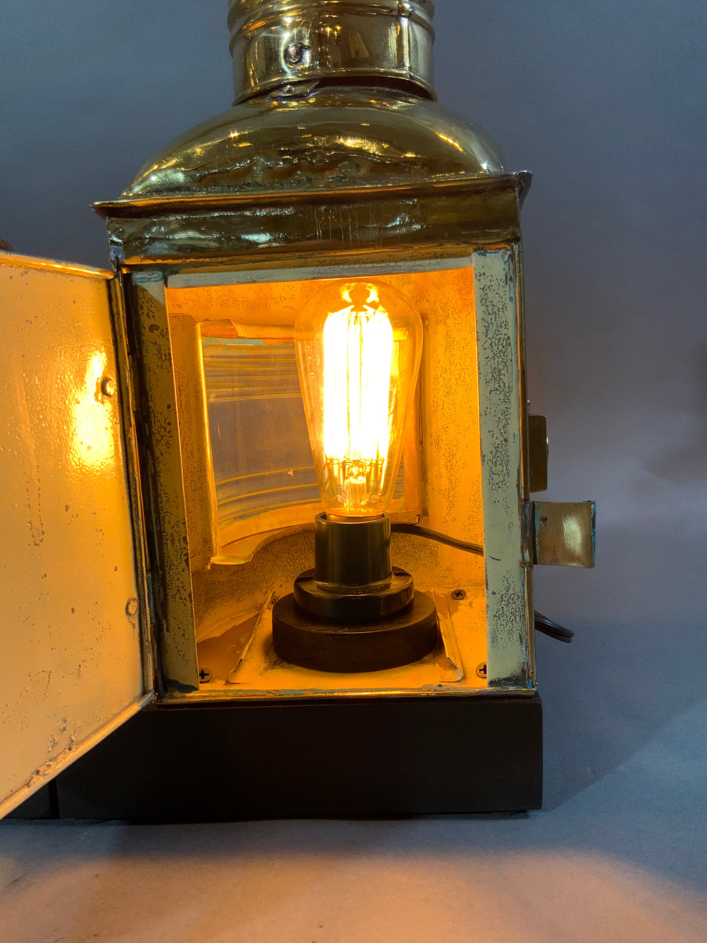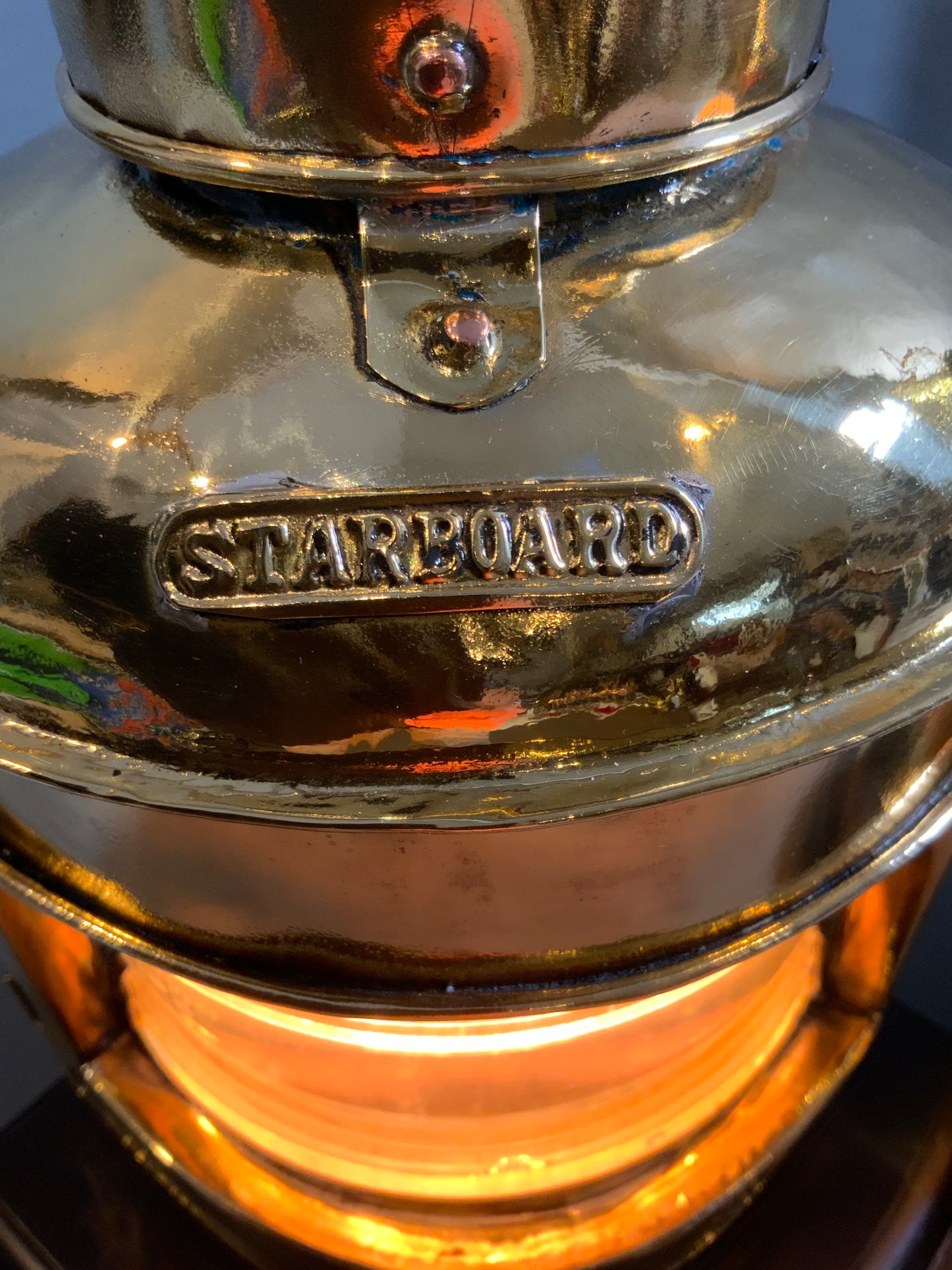 Highly polished and lacquered solid brass ships lantern with clear glass lenses. Lacking colored red and green filters. Mounted to thick mahogany bases. Wire with new sockets and cords.