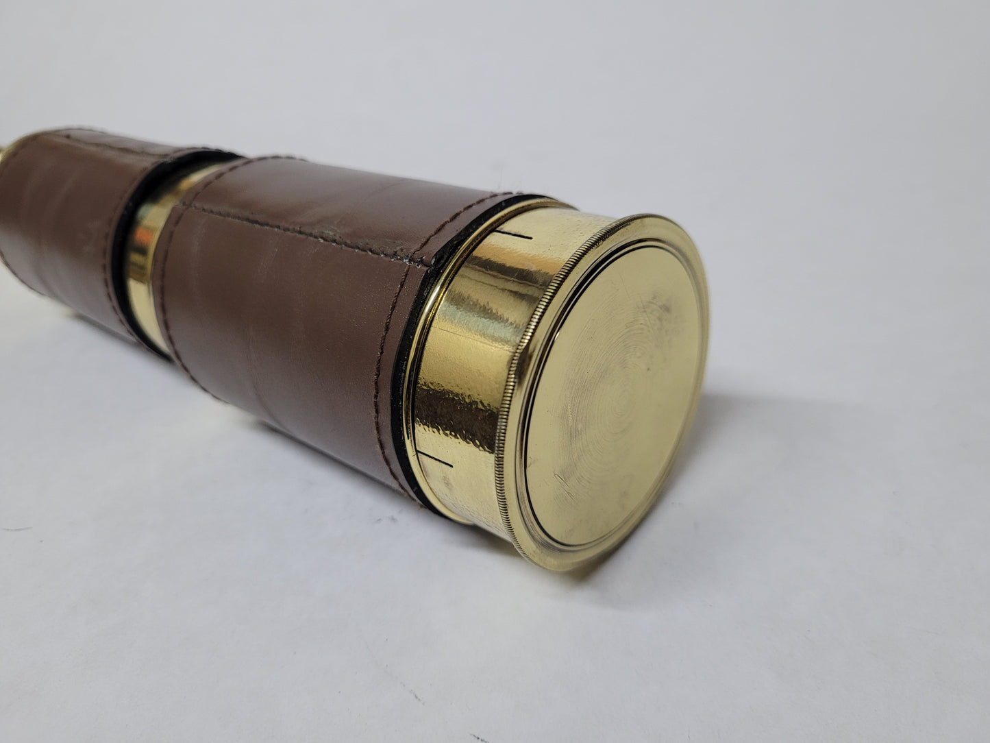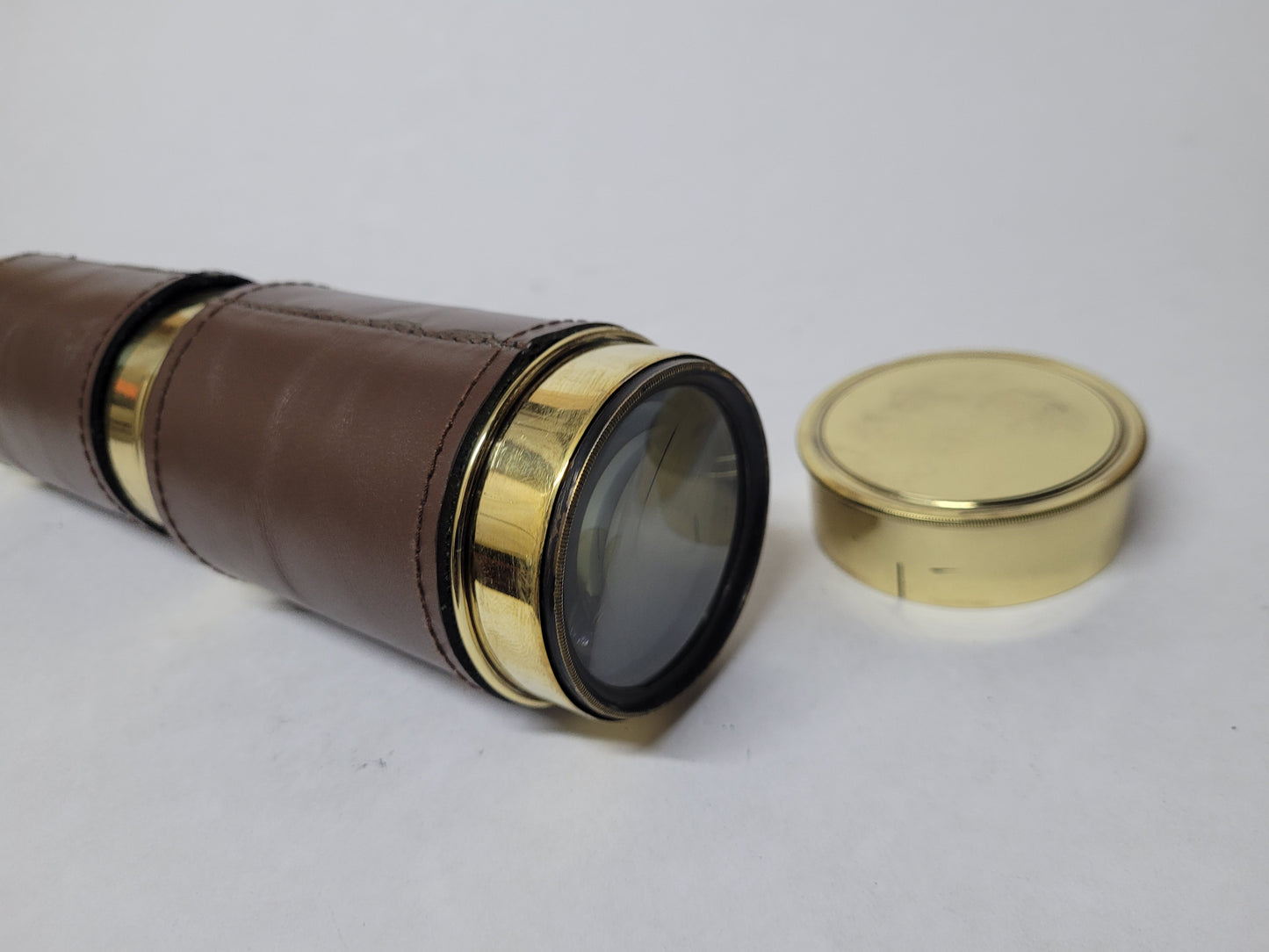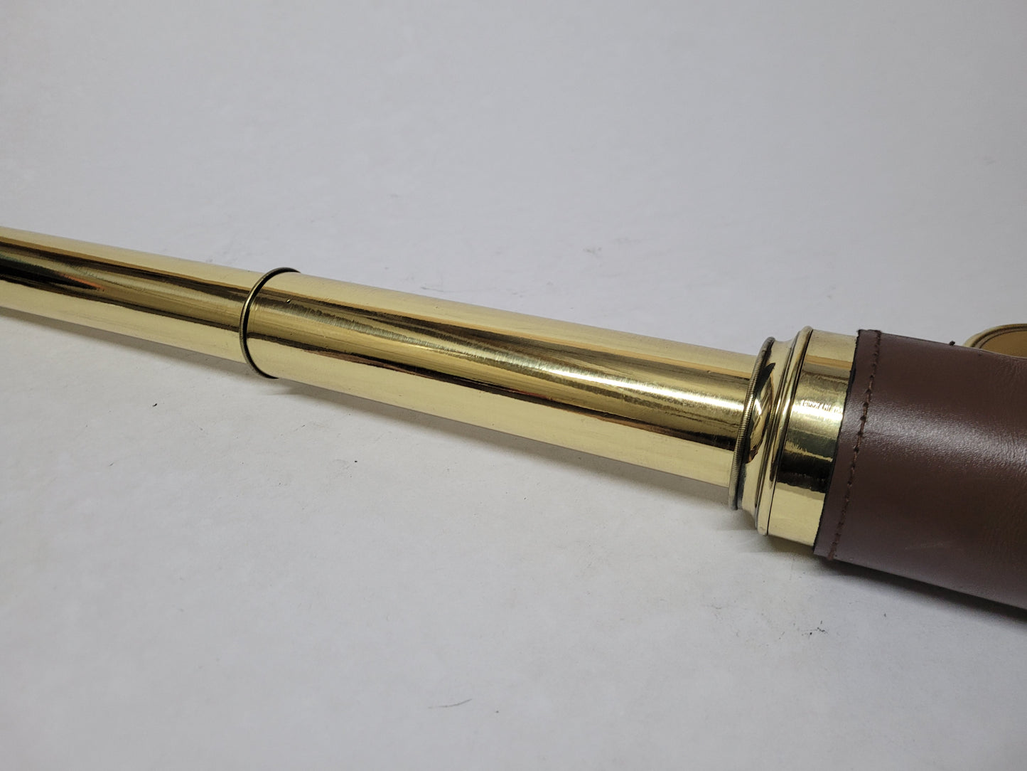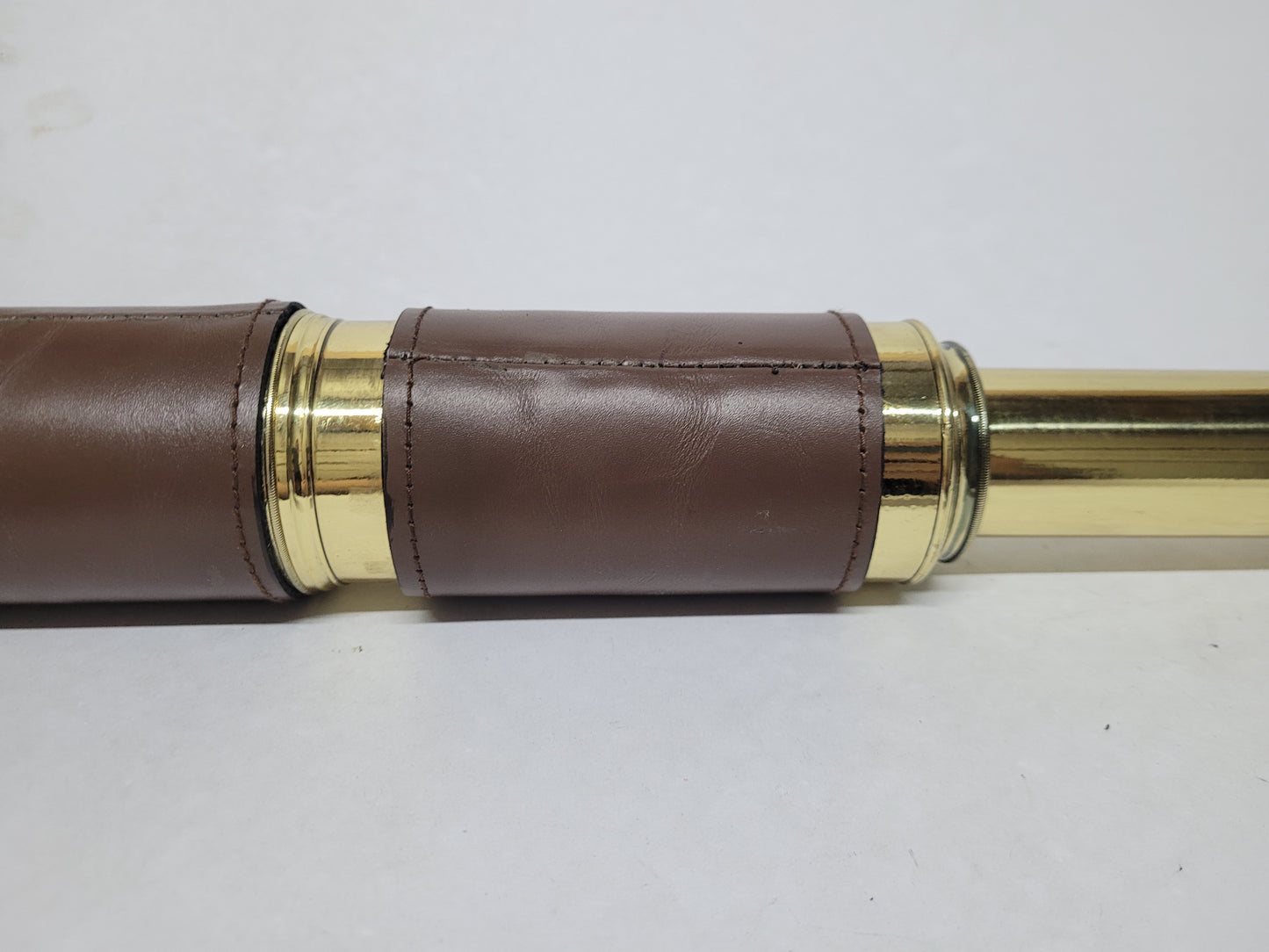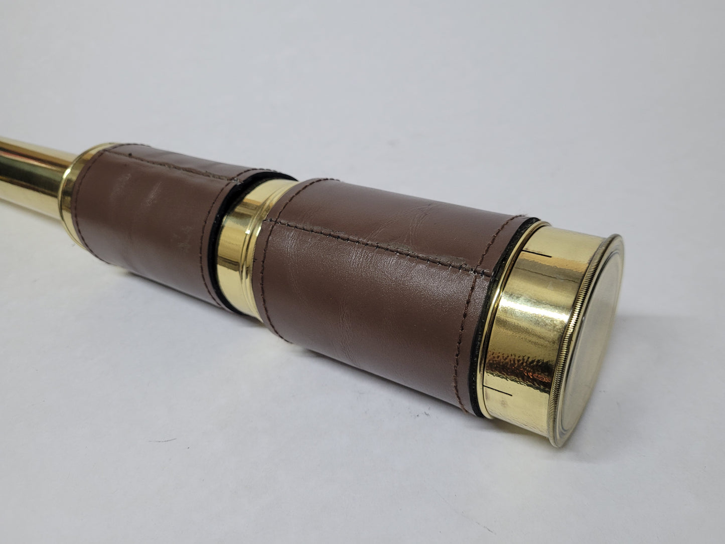 Ships spyglass telescope appropriate for use on a yacht, ship, or anywhere with a view. This has been meticulously polished and lacquered. We just restored a great collection of these. This fine instrument has a triple draw barrel of solid brass that is recovered is soft brown leather. The focal tube has a sliding lens cover. Also fitted with lens cap. English made. Circa 1935.