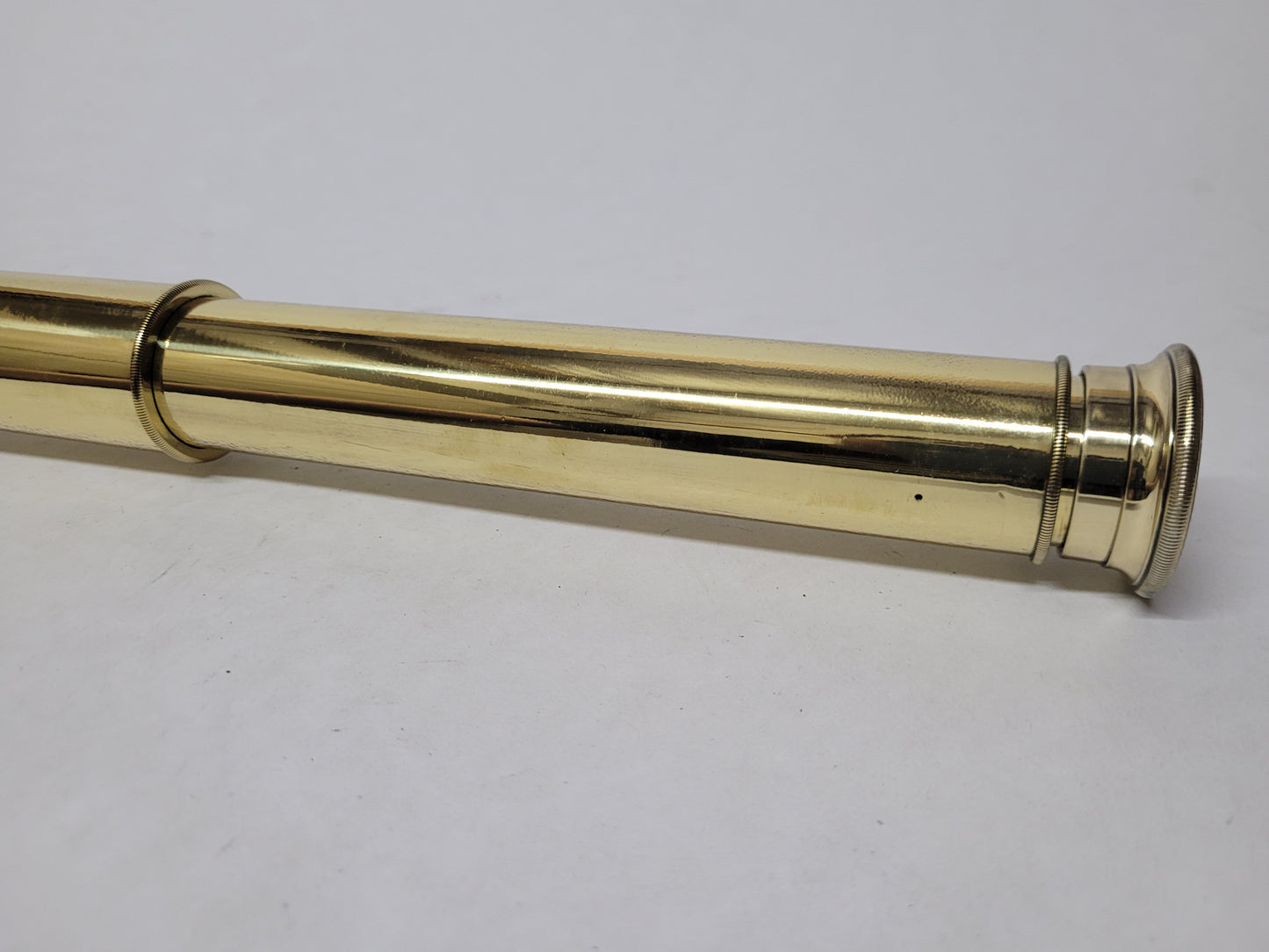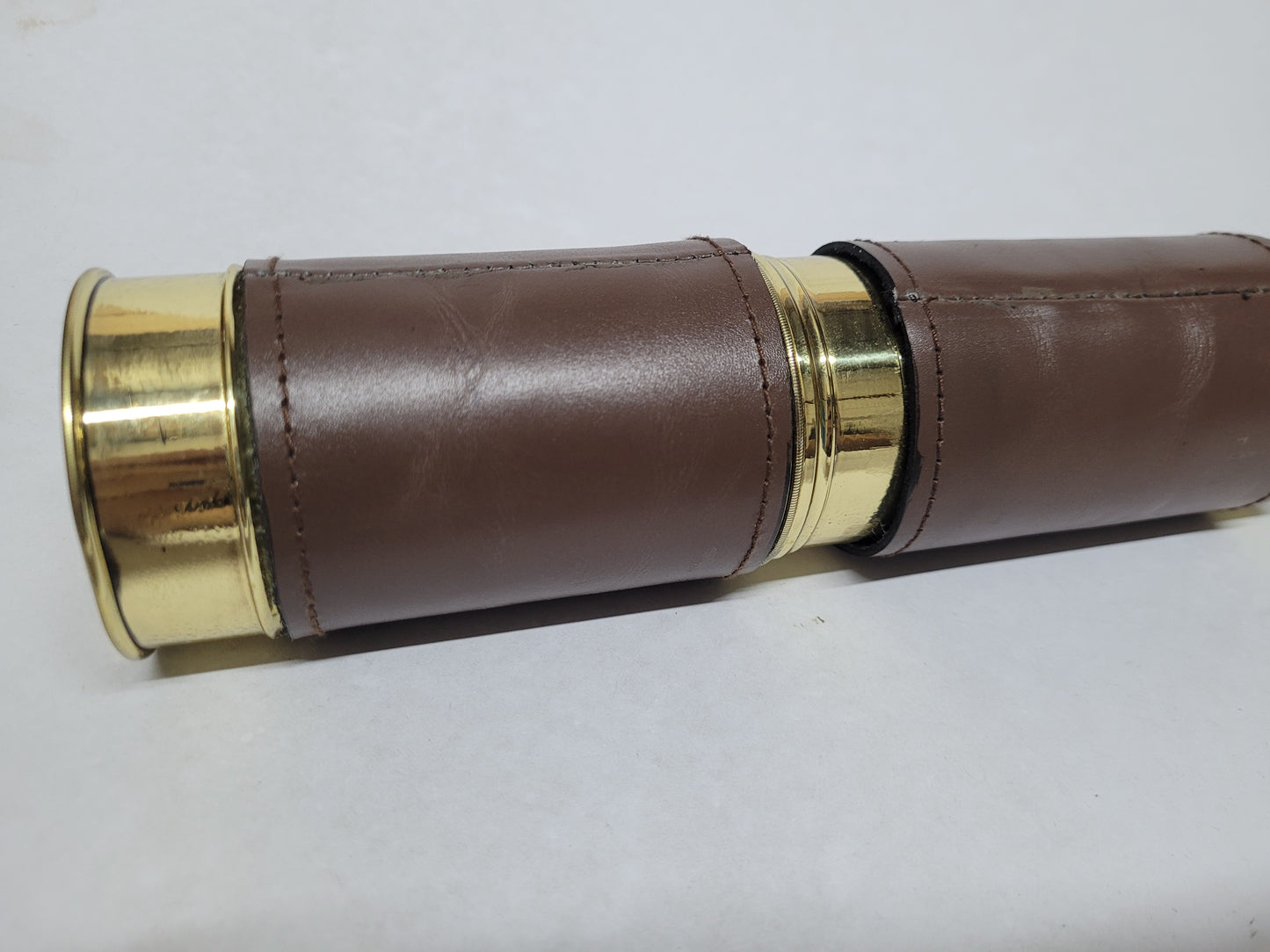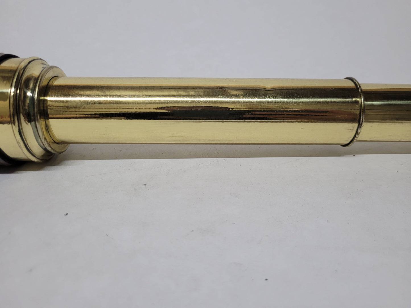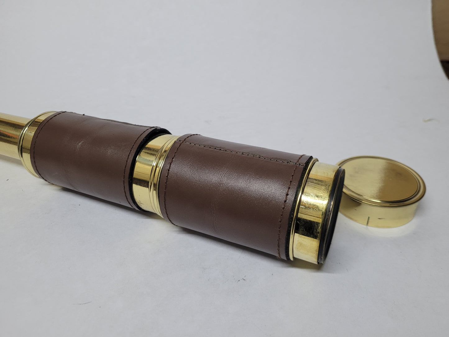 Ships spyglass telescope appropriate for use on a yacht, ship, or anywhere with a view. This has been meticulously polished and lacquered. We just restored a great collection of these. This fine instrument has a triple draw barrel of solid brass that is recovered is soft brown leather. The focal tube has a sliding lens cover. Also fitted with lens cap. English made. Circa 1935.