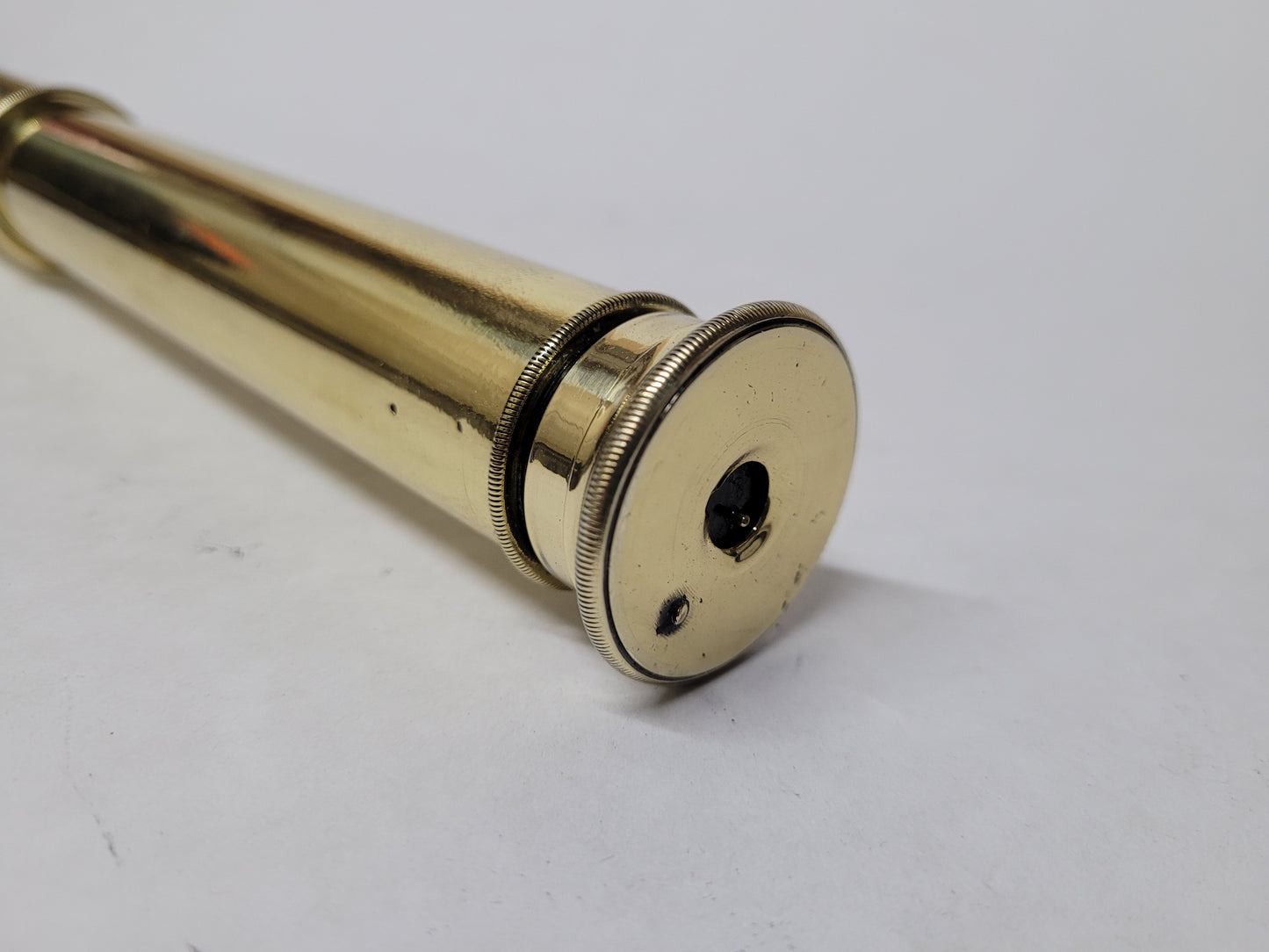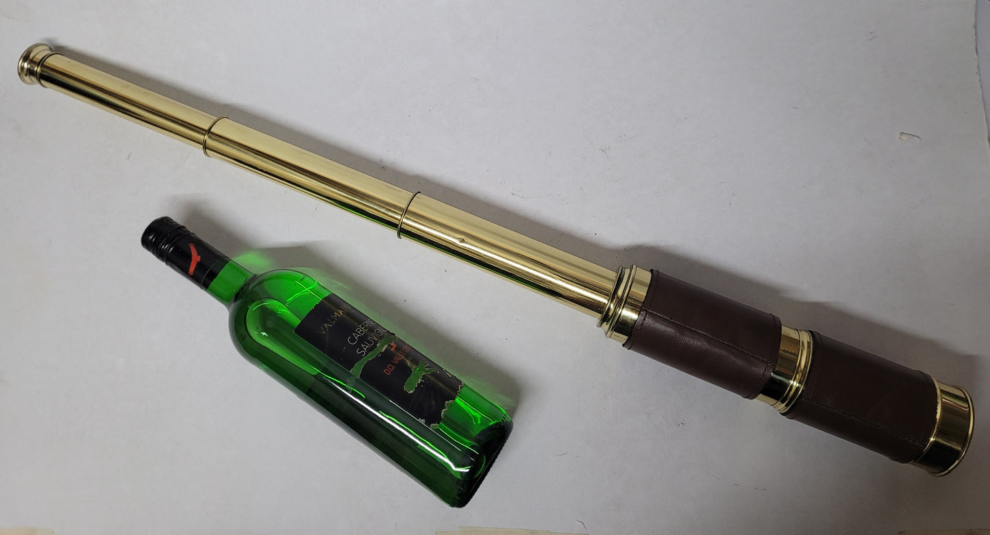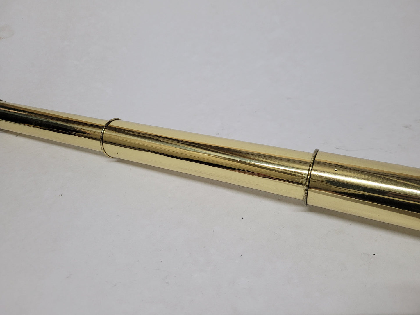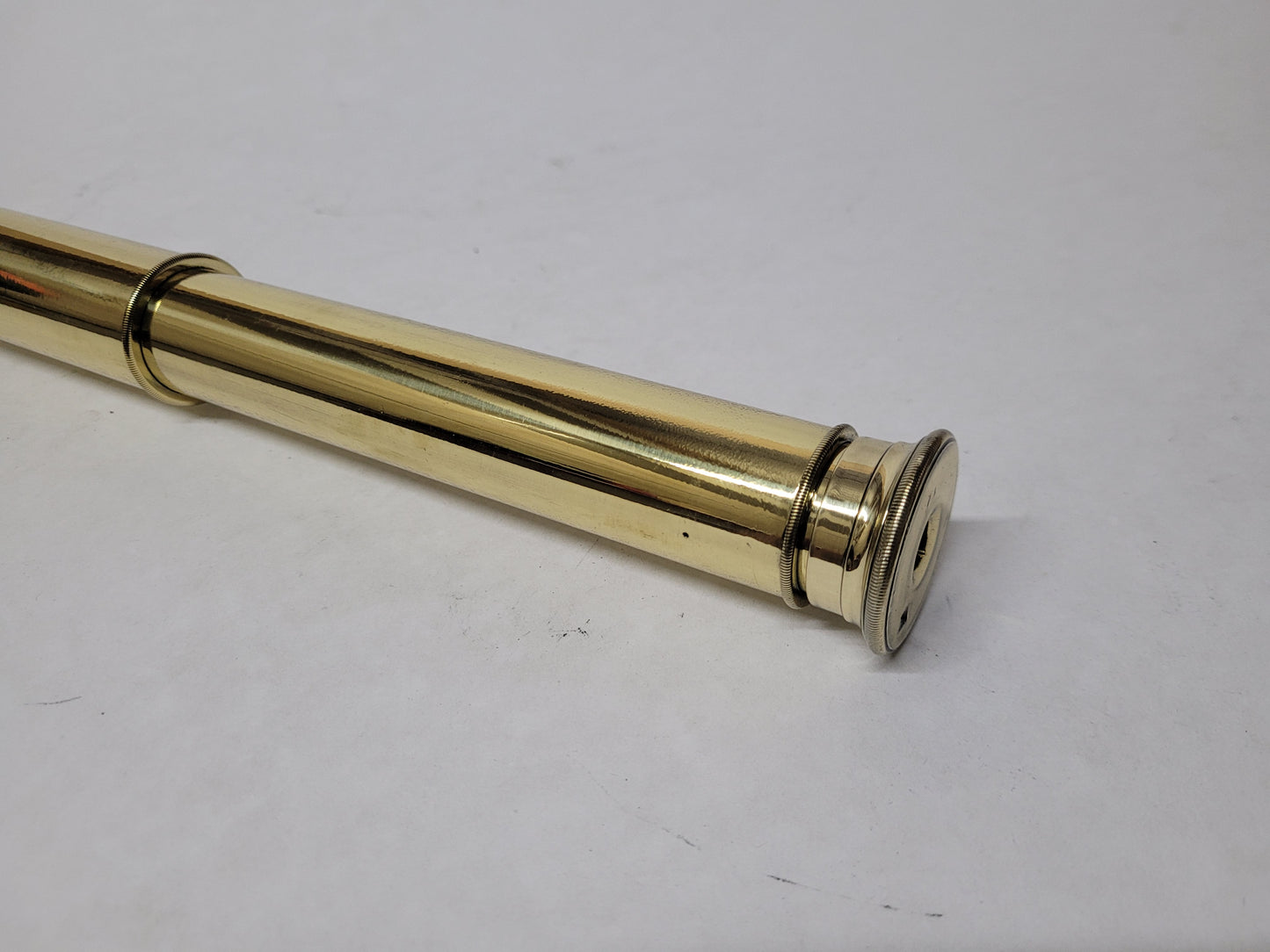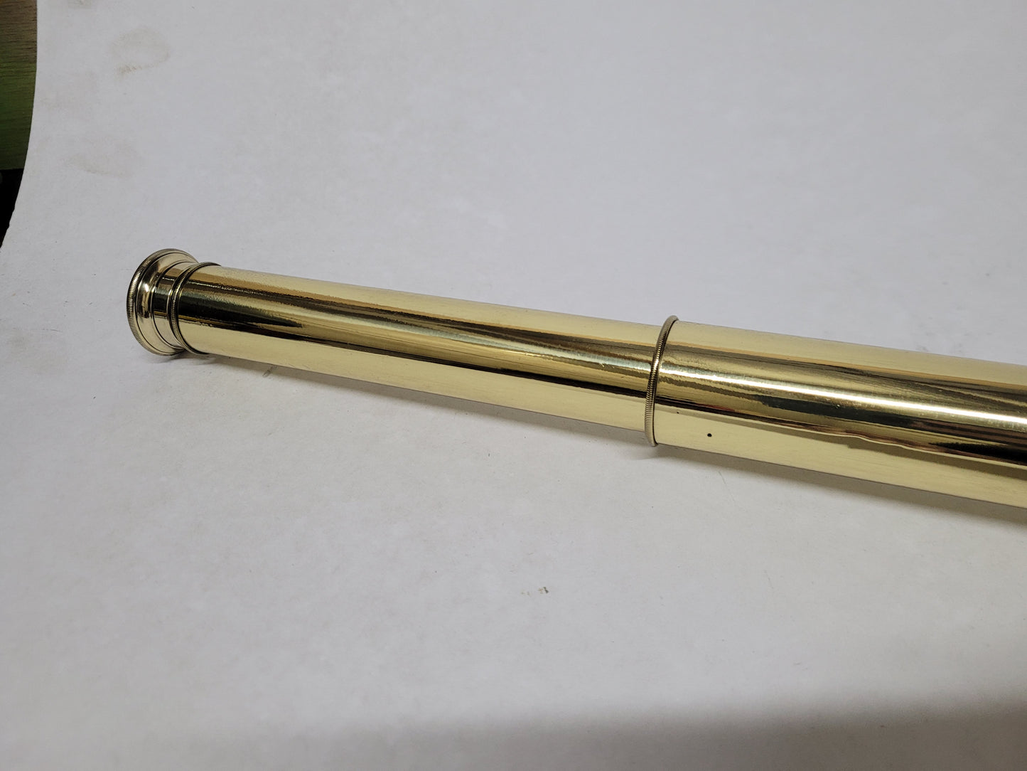 Ships spyglass telescope appropriate for use on a yacht, ship, or anywhere with a view. This has been meticulously polished and lacquered. We just restored a great collection of these. This fine instrument has a triple draw barrel of solid brass that is recovered is soft brown leather. The focal tube has a sliding lens cover. Also fitted with lens cap. English made. Circa 1935.