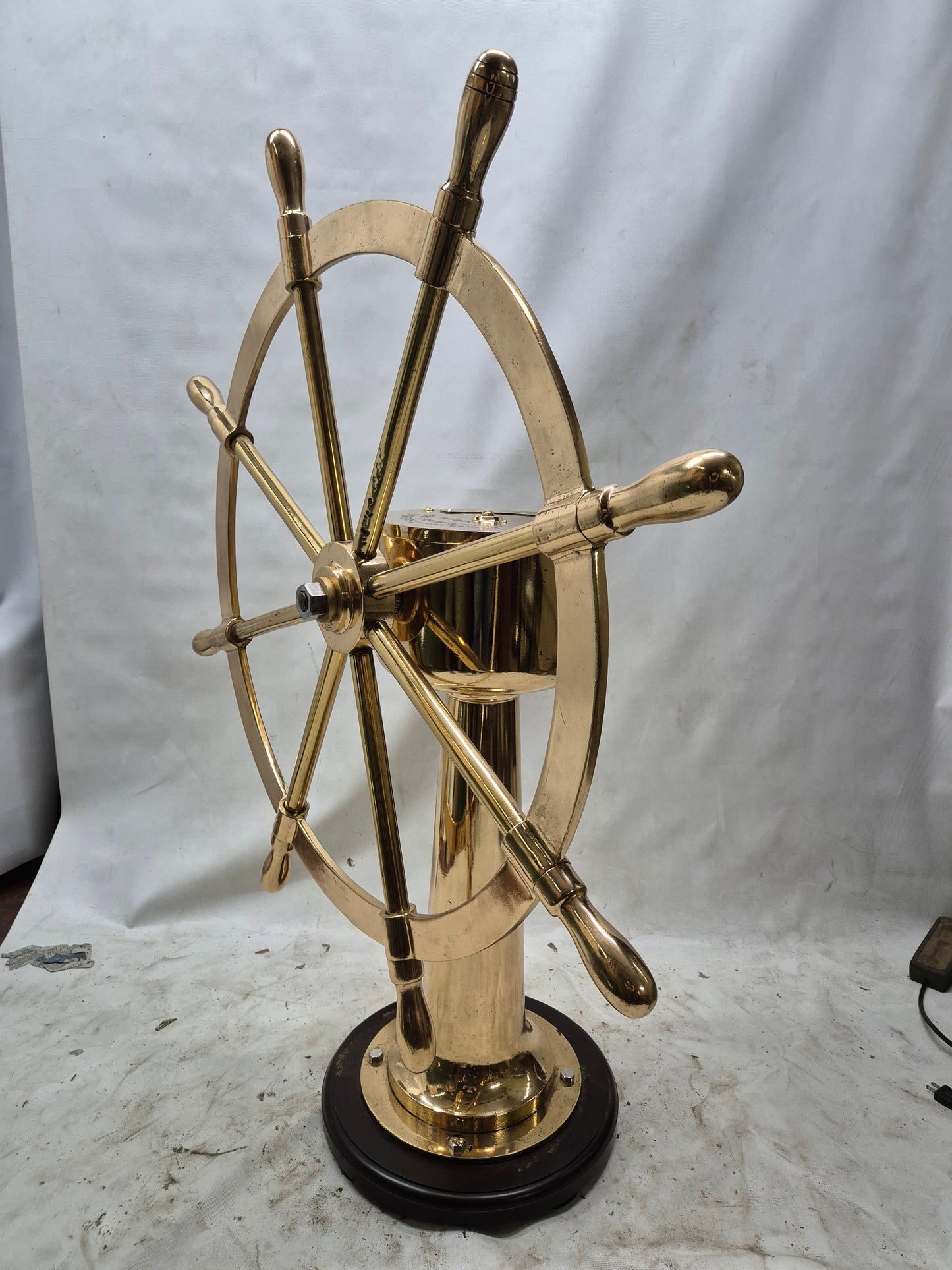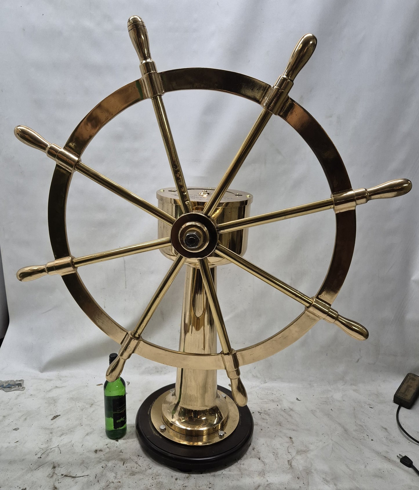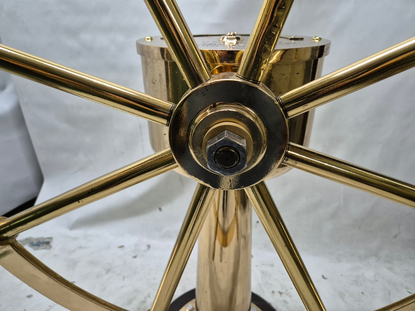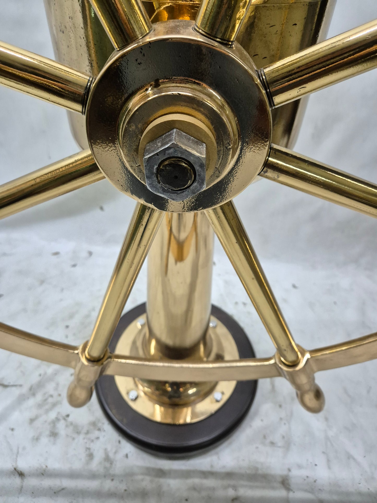 Meticulously polished and lacquered, the wheel radiates brilliance while ensuring enduring protection. It is firmly mounted on a thick, varnished wooden base, offering both stability and aesthetic appeal. This remarkable piece is an ideal acquisition for maritime collectors or as a captivating decorative centerpiece, celebrating the heritage of nautical engineering.