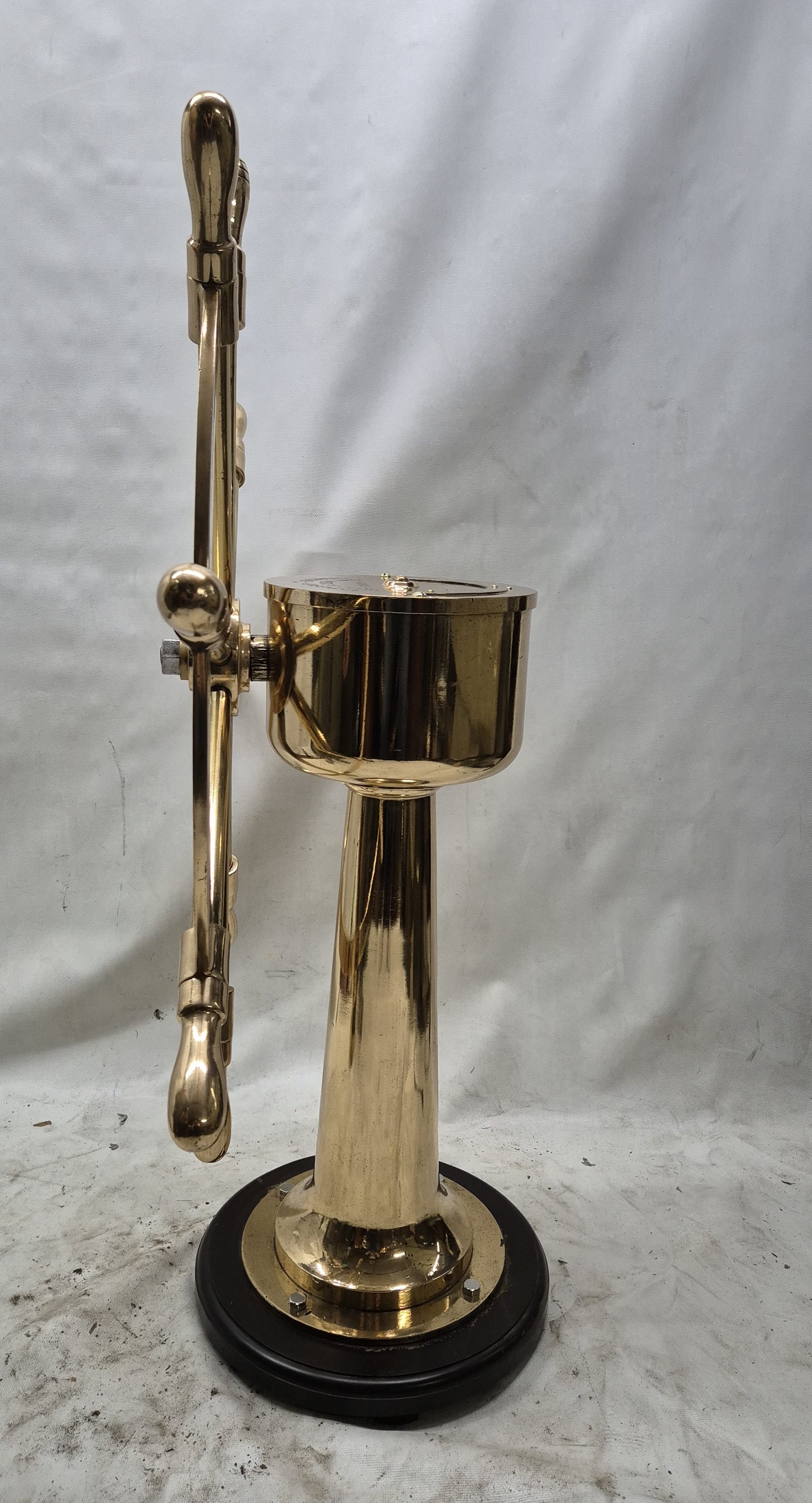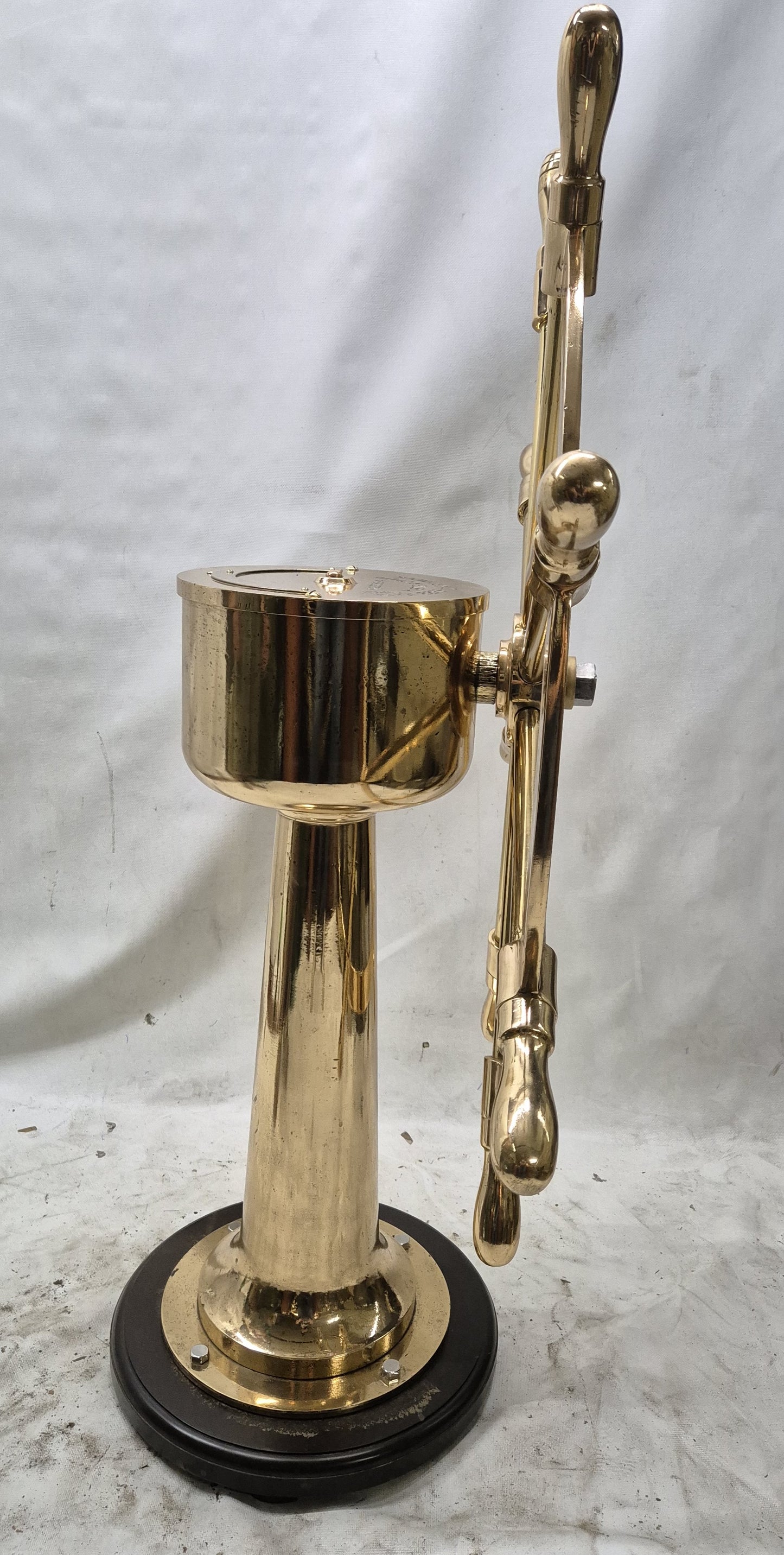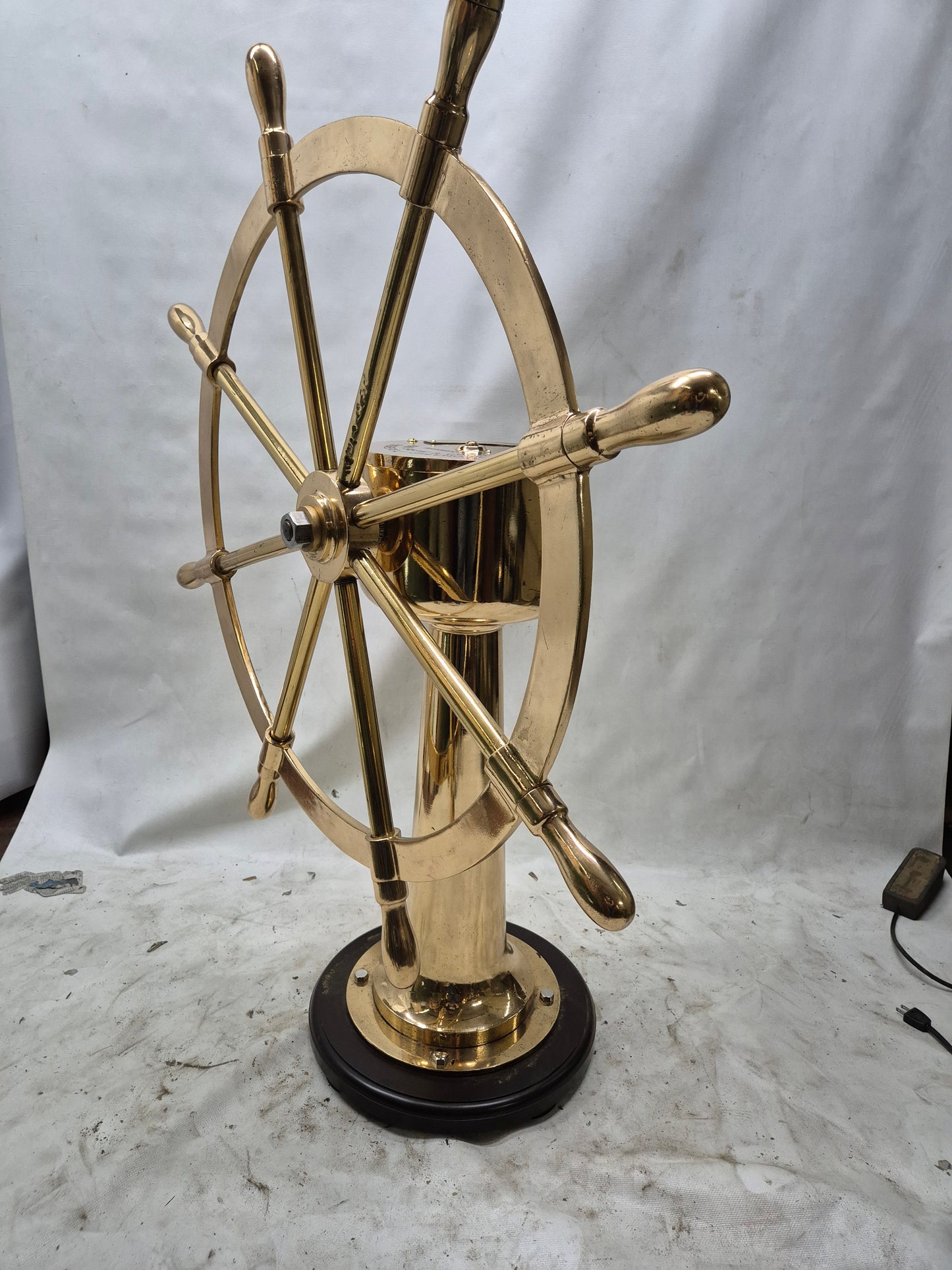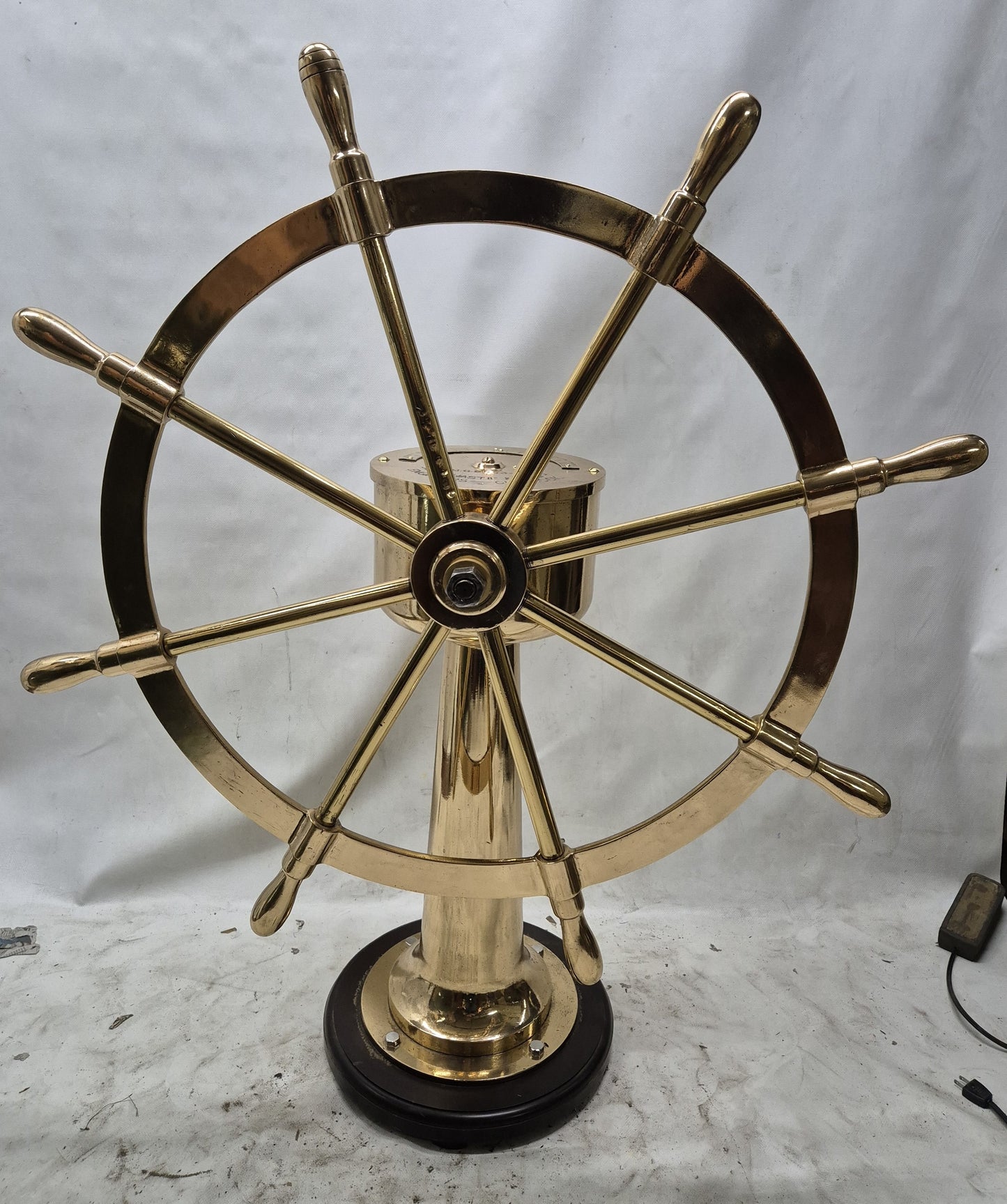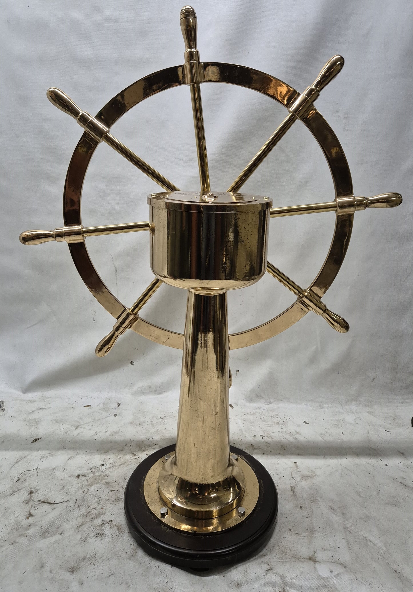 Meticulously polished and lacquered, the wheel radiates brilliance while ensuring enduring protection. It is firmly mounted on a thick, varnished wooden base, offering both stability and aesthetic appeal. This remarkable piece is an ideal acquisition for maritime collectors or as a captivating decorative centerpiece, celebrating the heritage of nautical engineering.