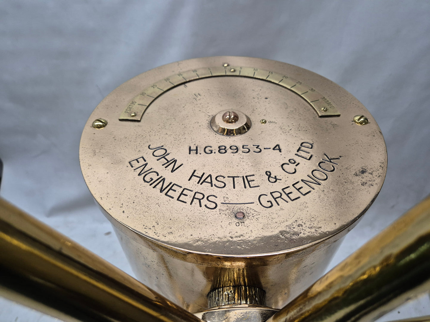 This distinguished eight-spoke ship’s wheel, masterfully crafted from solid brass, is mounted on a robust pedestal, exuding timeless maritime elegance. The pedestal head is engraved with “John Hastie & Co. Ltd., Engineers Greenock” and marked with the code H.G.8953-4, highlighting its authentic craftsmanship and historical significance.