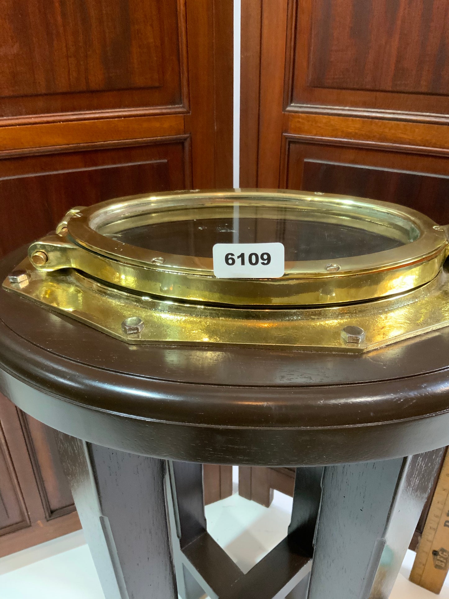 Solid brass boat porthole that has been meticulously polished and lacquered, then mounted to a custom mahogany table stand. Oval glass. Weight is 17 pounds. Height is 24 inches and width 15 by 11. Price $1295.