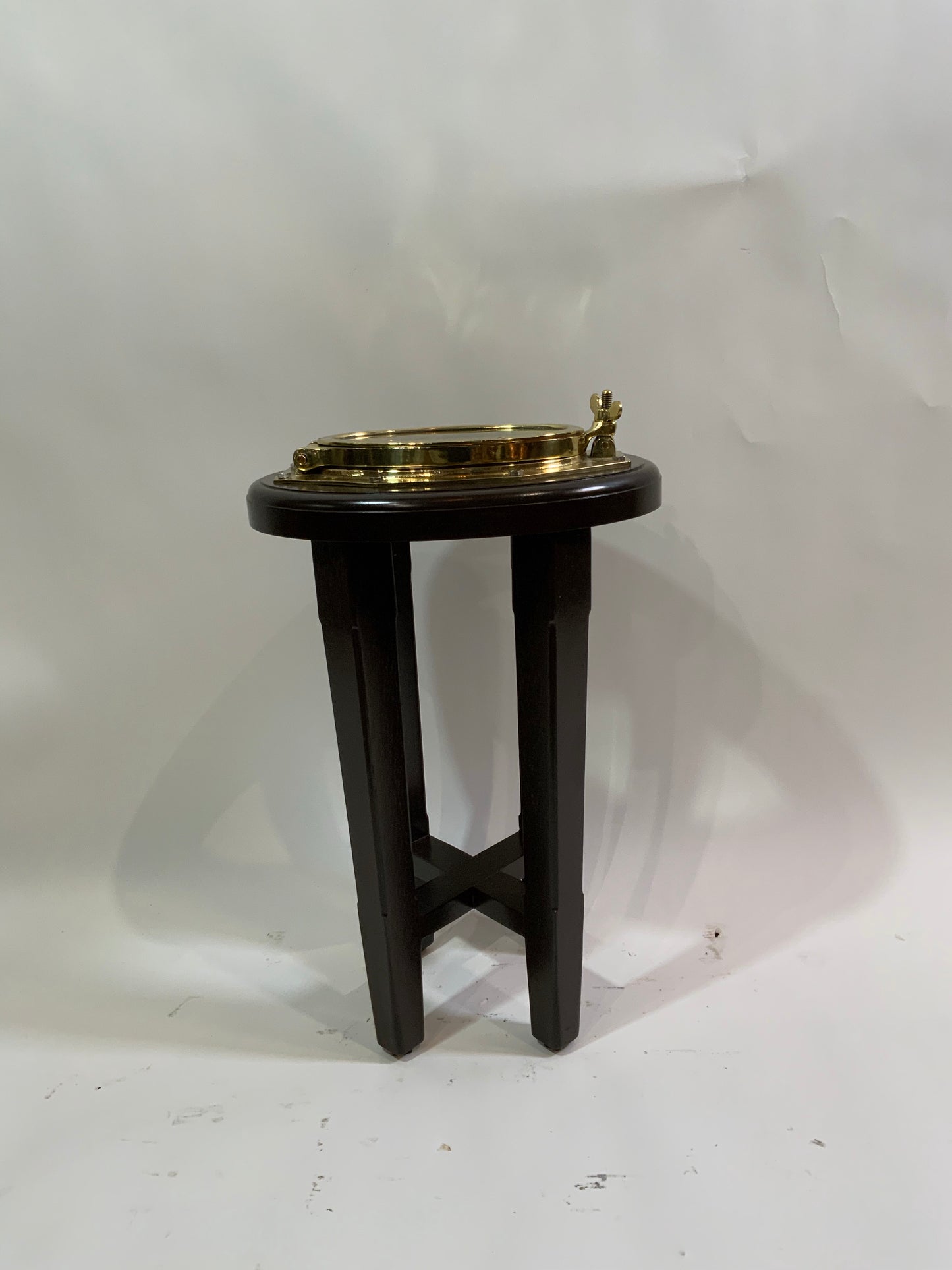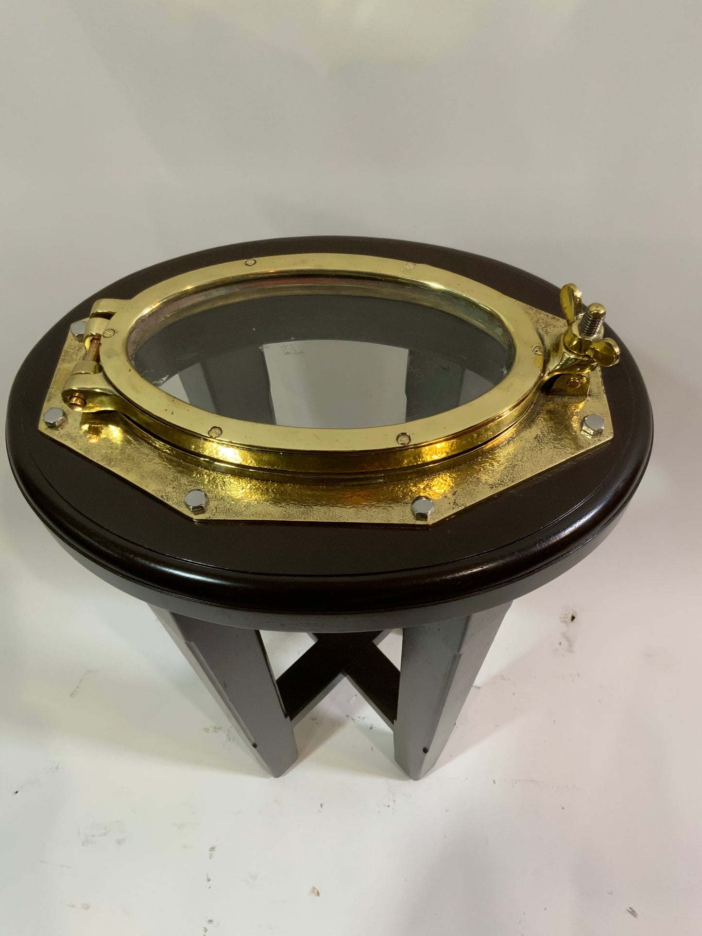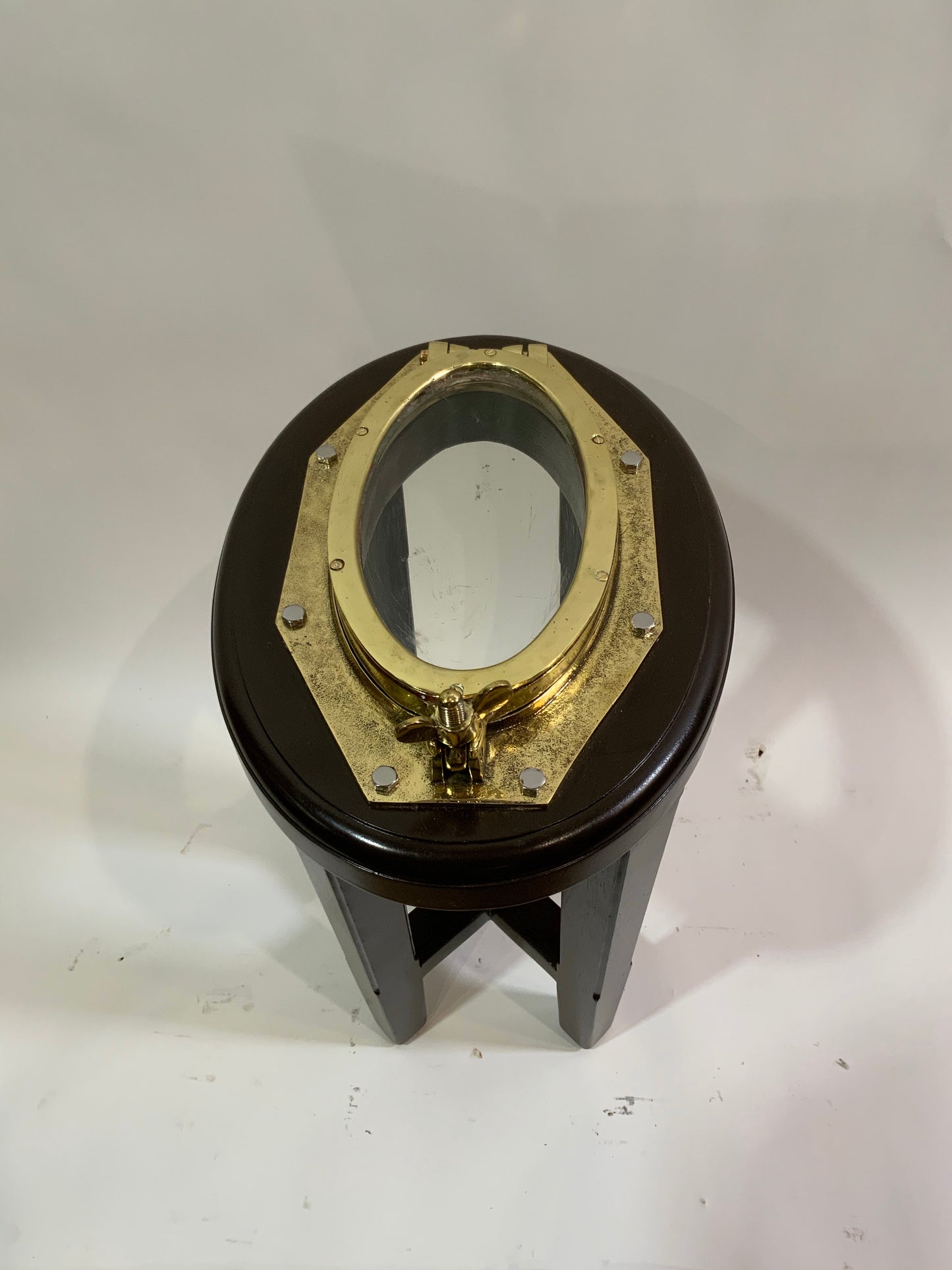 Solid Brass Ships Porthole Mounted To A Mahogany Table Base