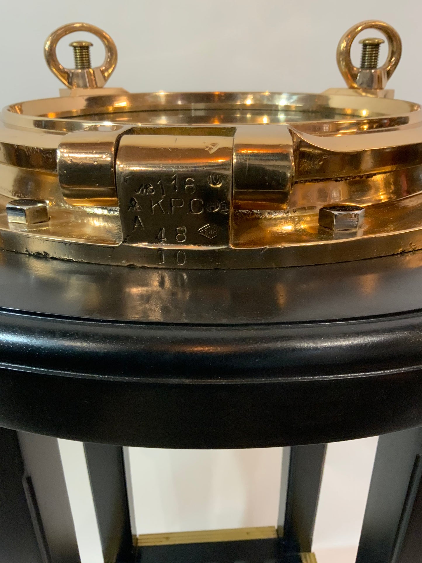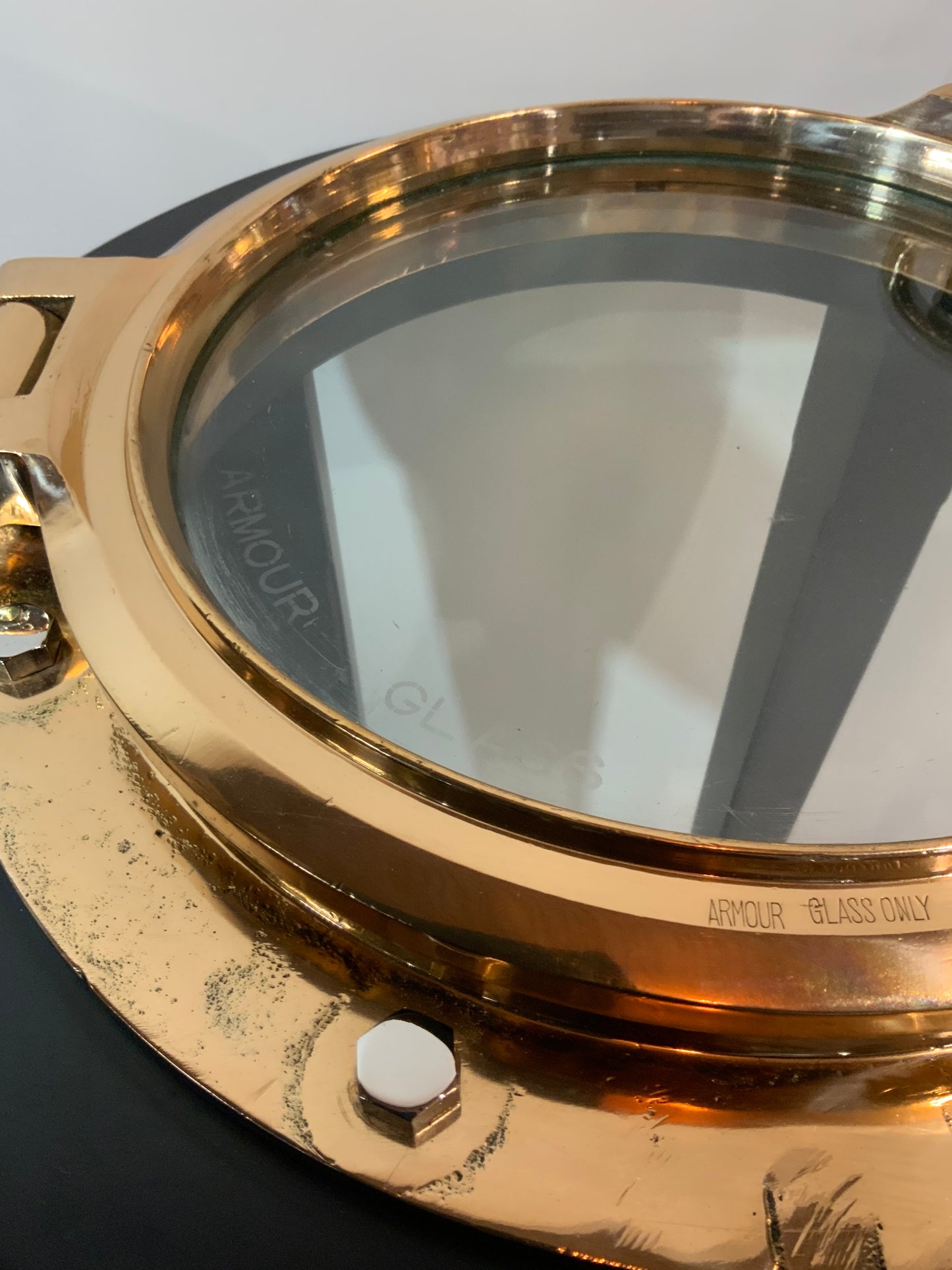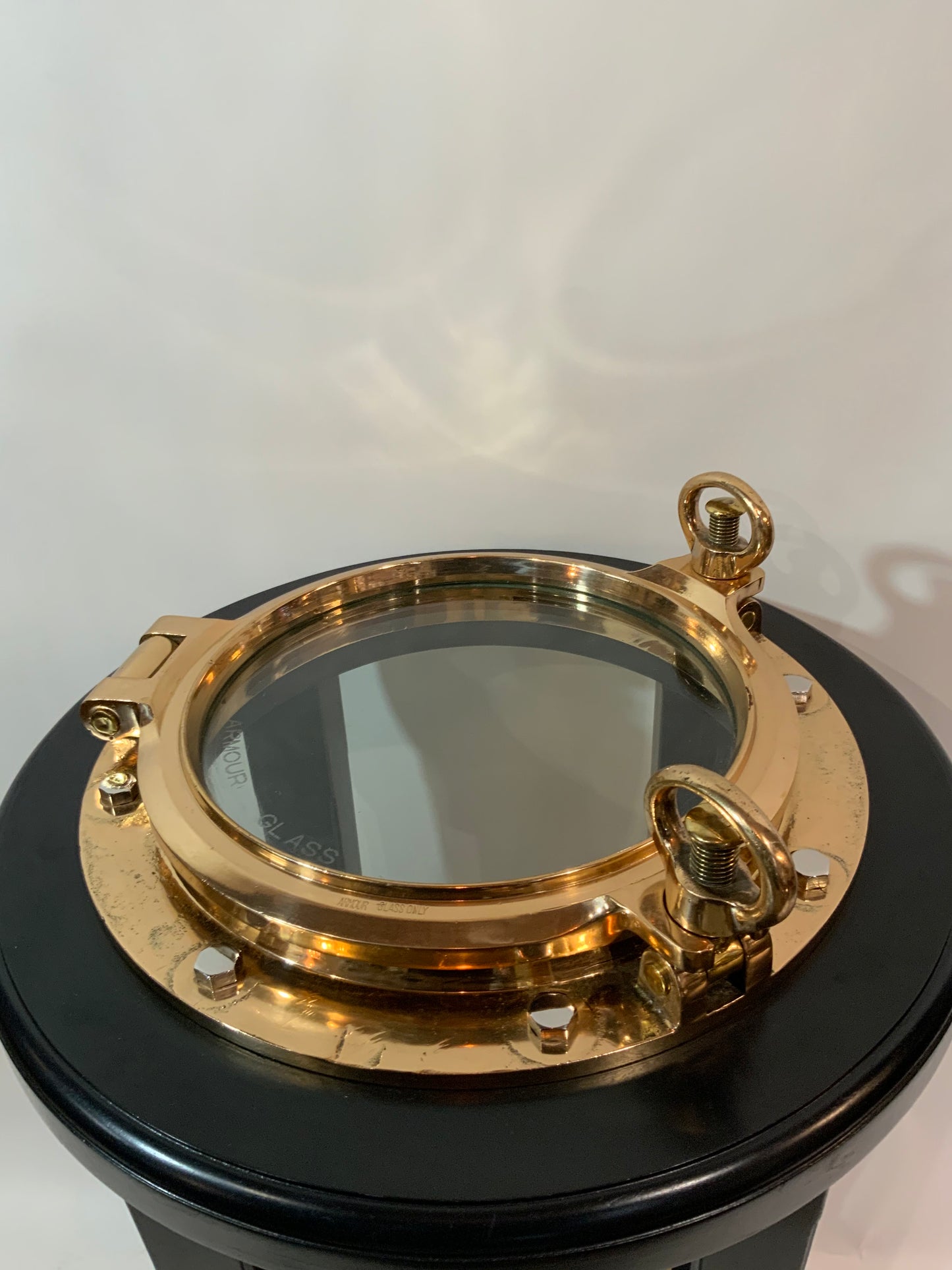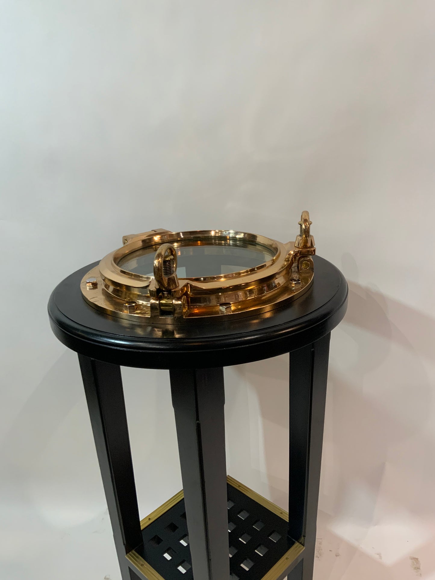 Solid brass ships porthole fitted to a bar height cocktail table stand. Highly polished and lacquered ships porthole has hinged door and two dog bolts. Stand has a ships grating shelf. Rich finish. Weight is 56 pounds. Dimensions are 40 tall by 22 diameter. Price $2495.