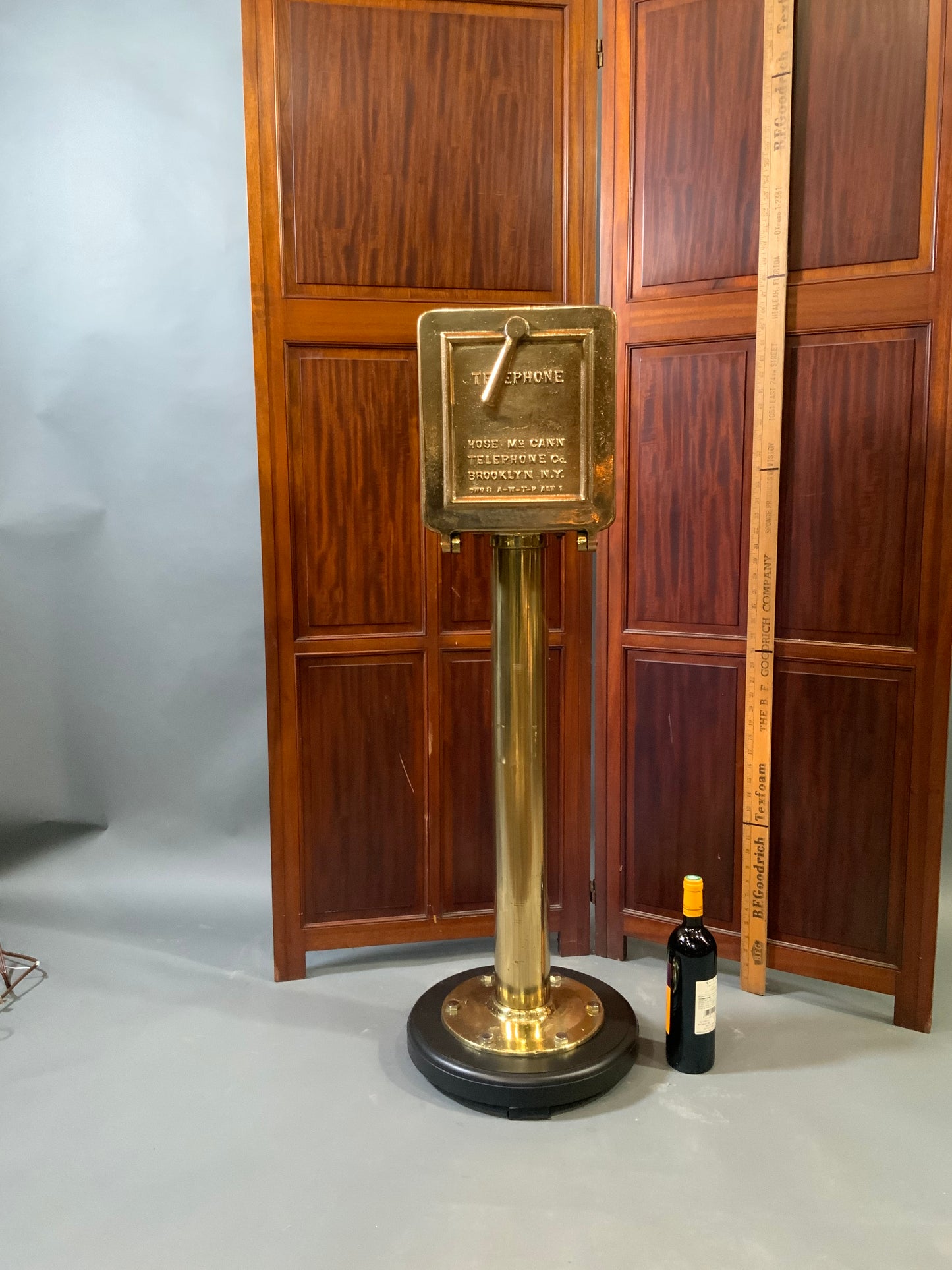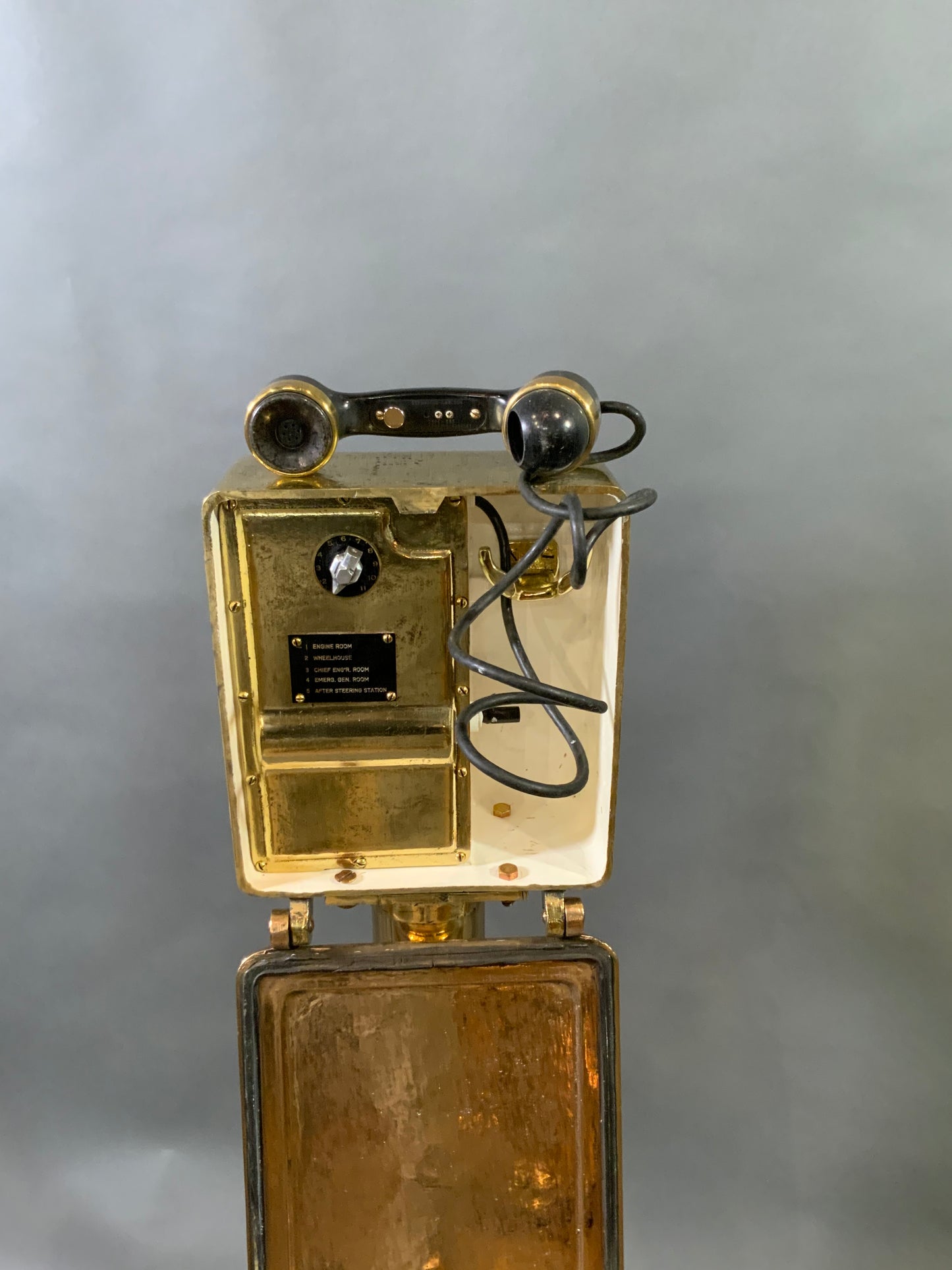 Solid brass ships telephone on pedestals. Phone is fitted inside an incredibly strong solid brass box that is highly polished and lacquered. Weight is 88 pounds. Dimensions 46 tall by 12 wide by 8 deep. $3295