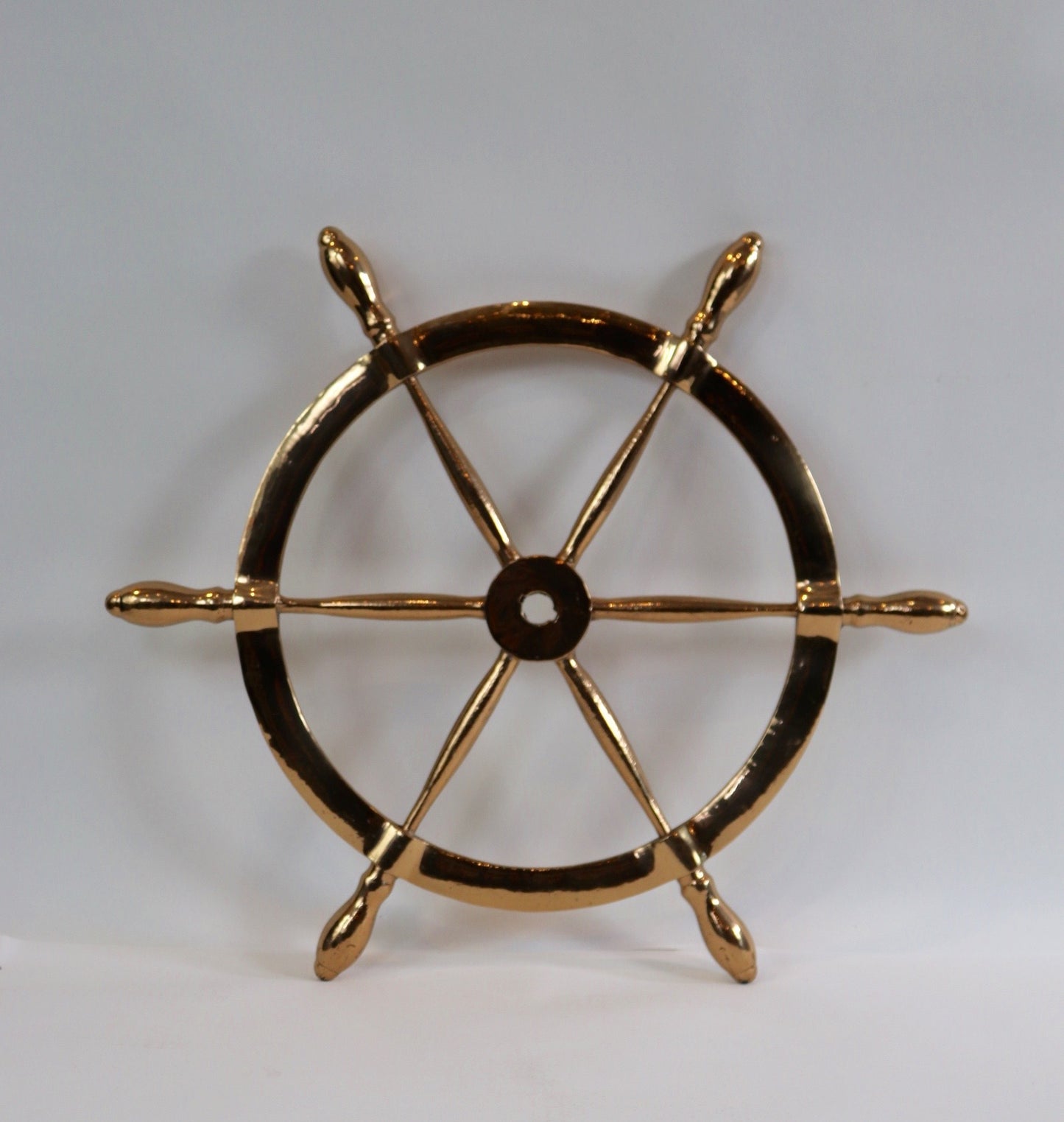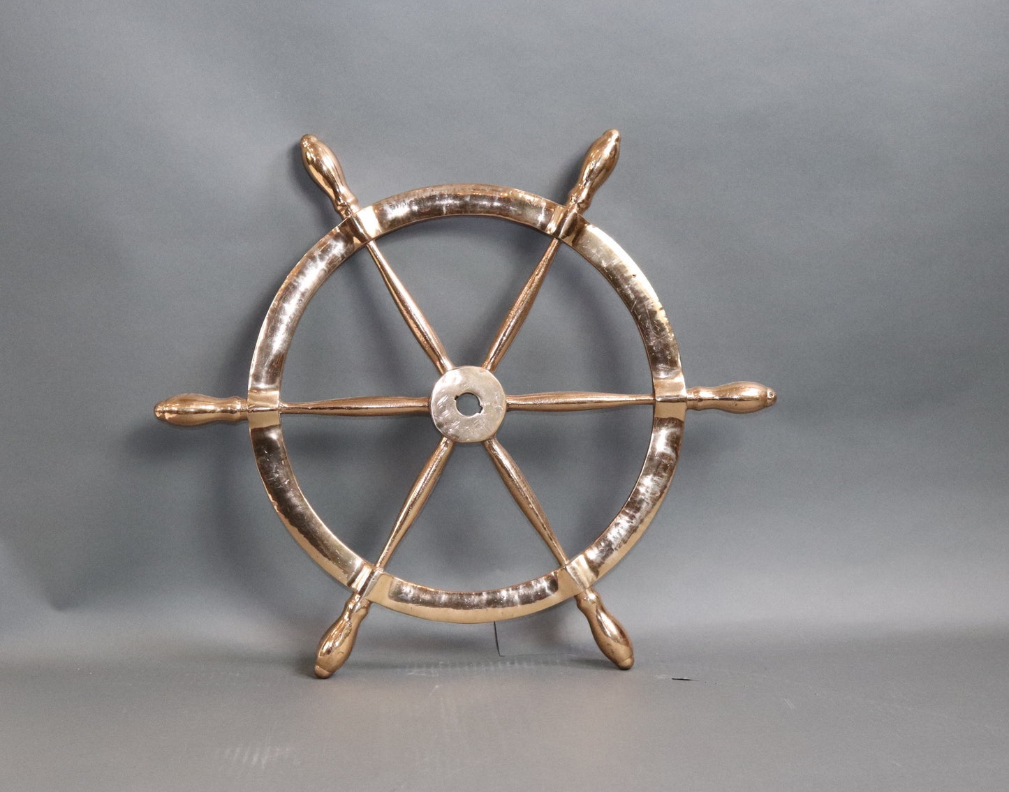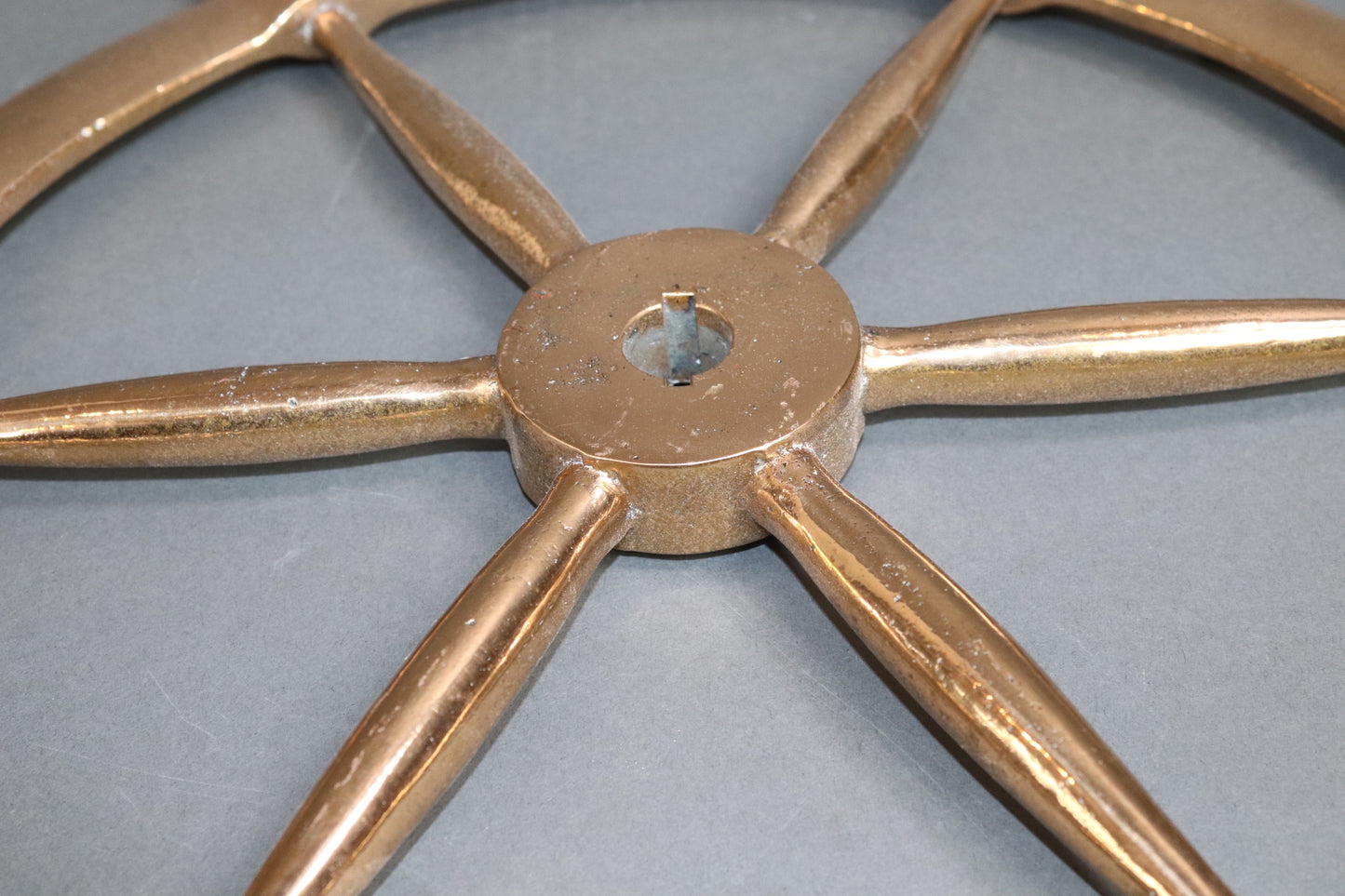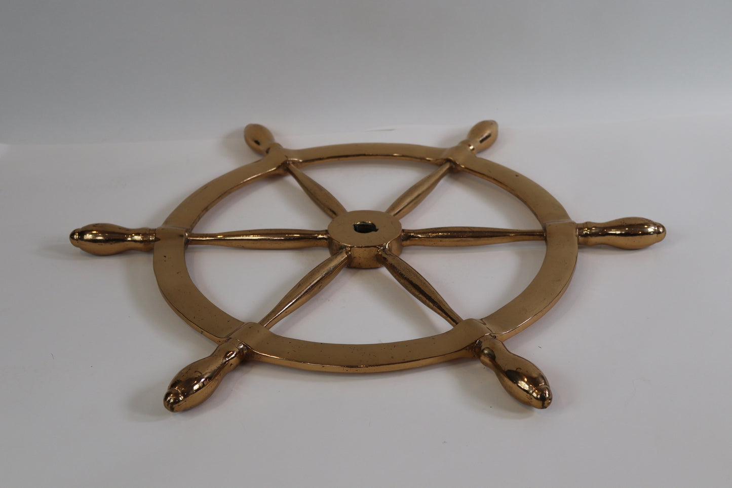 Highly polished and lacquered yacht or ships wheel with a highly polished and lacquered finish. The hub is slotted with two keyholes. Weight is 19 pounds.