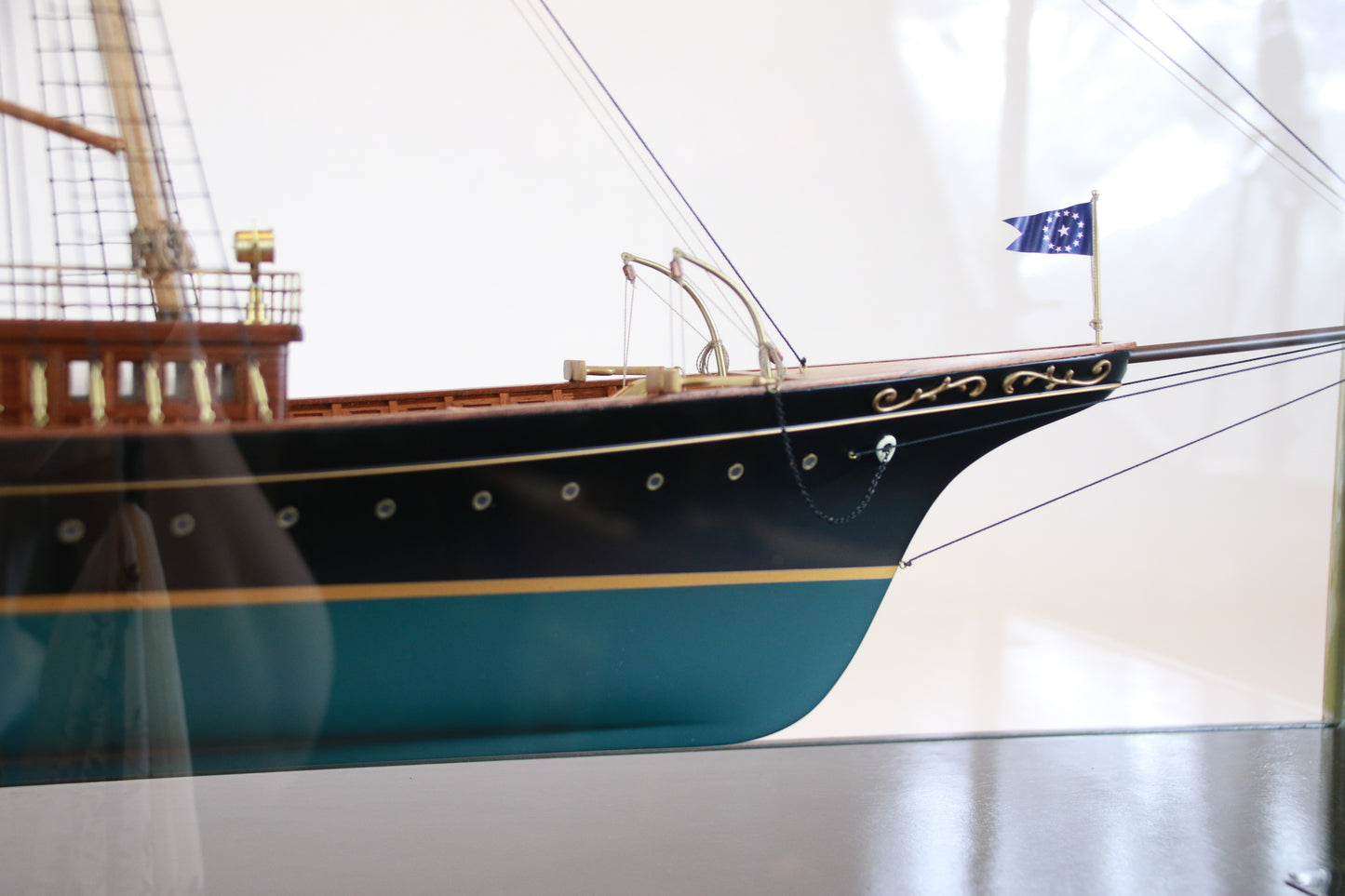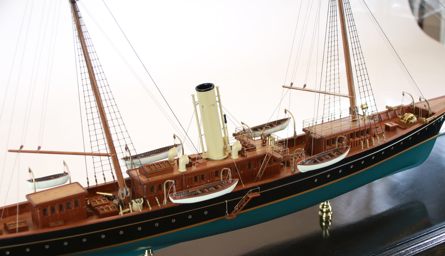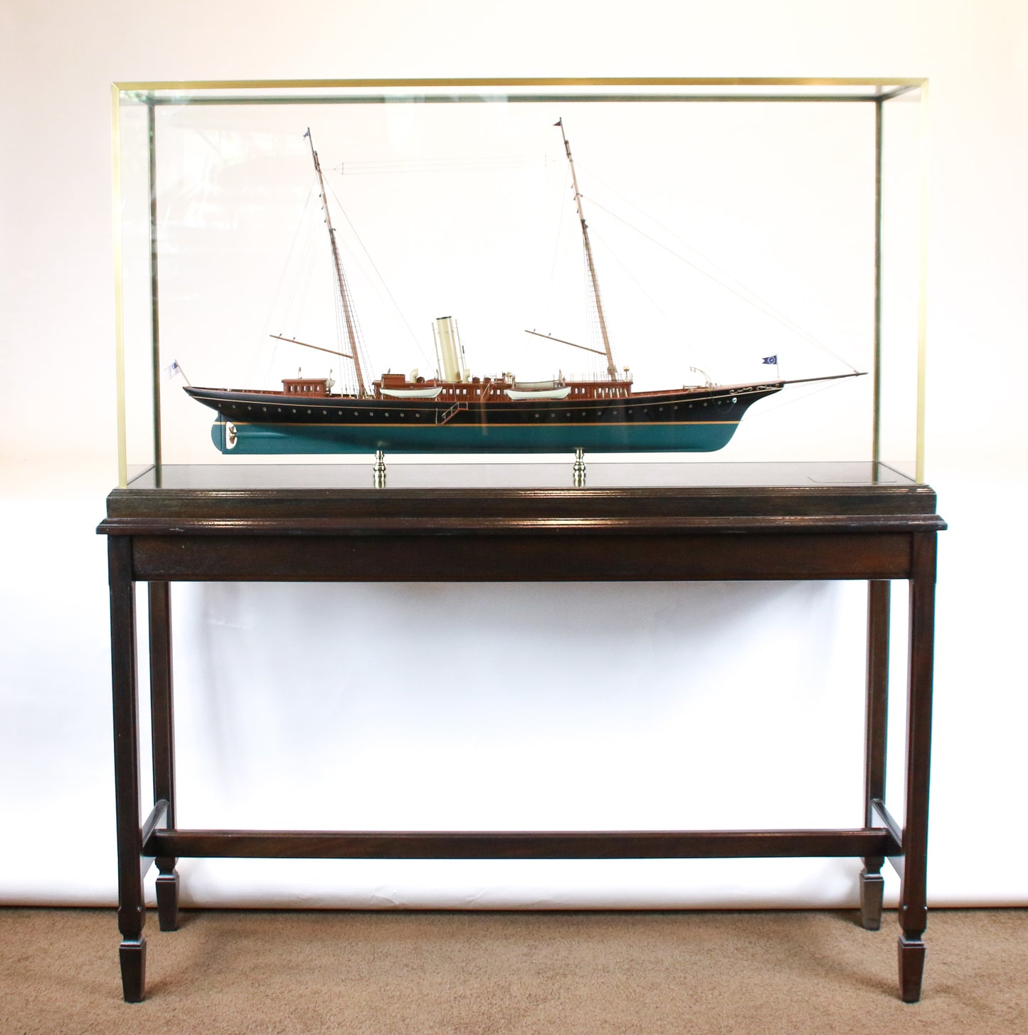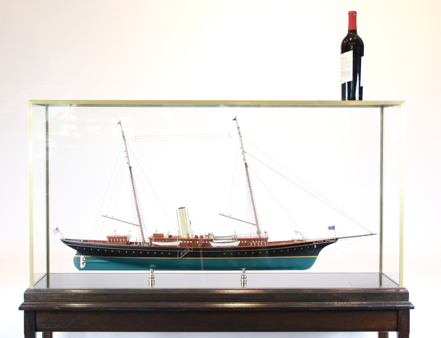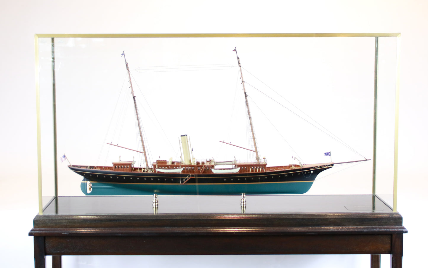 Private steam yacht of J. Pierpont Morgan, Corsair in brass and glass display case with custom wooden table stand. Many fine details include capstan, helm, binnacle, winch, funnel, lifeboats, portholes, cabins, doors etc. Morgan commissioned three yachts that he christened Corsair, with this one operating under his ownership from 1890 to 1898. It was sold to the United States Navy for $225,000 and converted for use as a patrol boat in the Spanish-American War and sailed under the name U.S.S. Gloucester. Measures: 51 x 14 x 67 with case and table (height of case without table is 27").