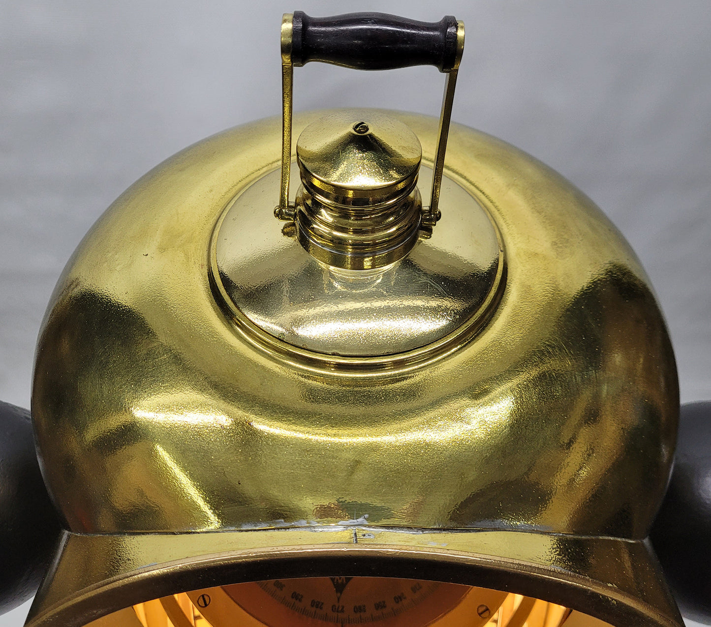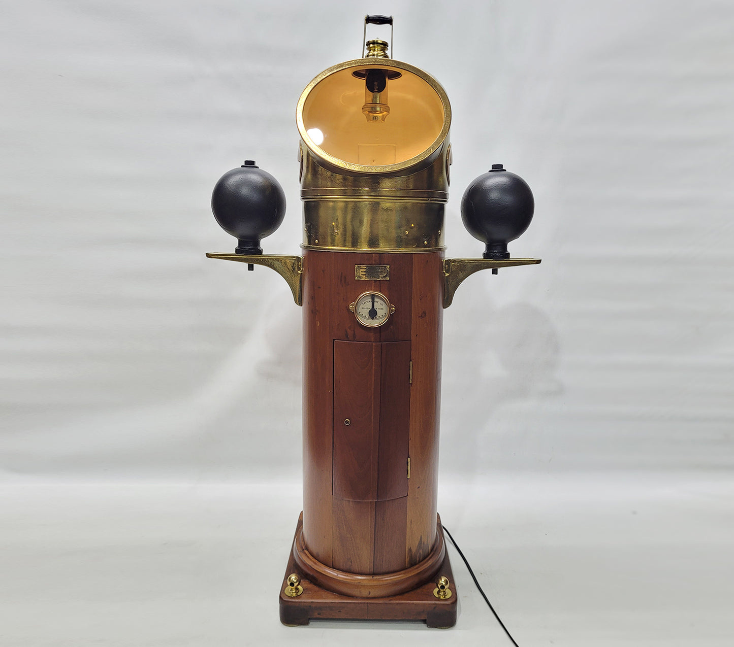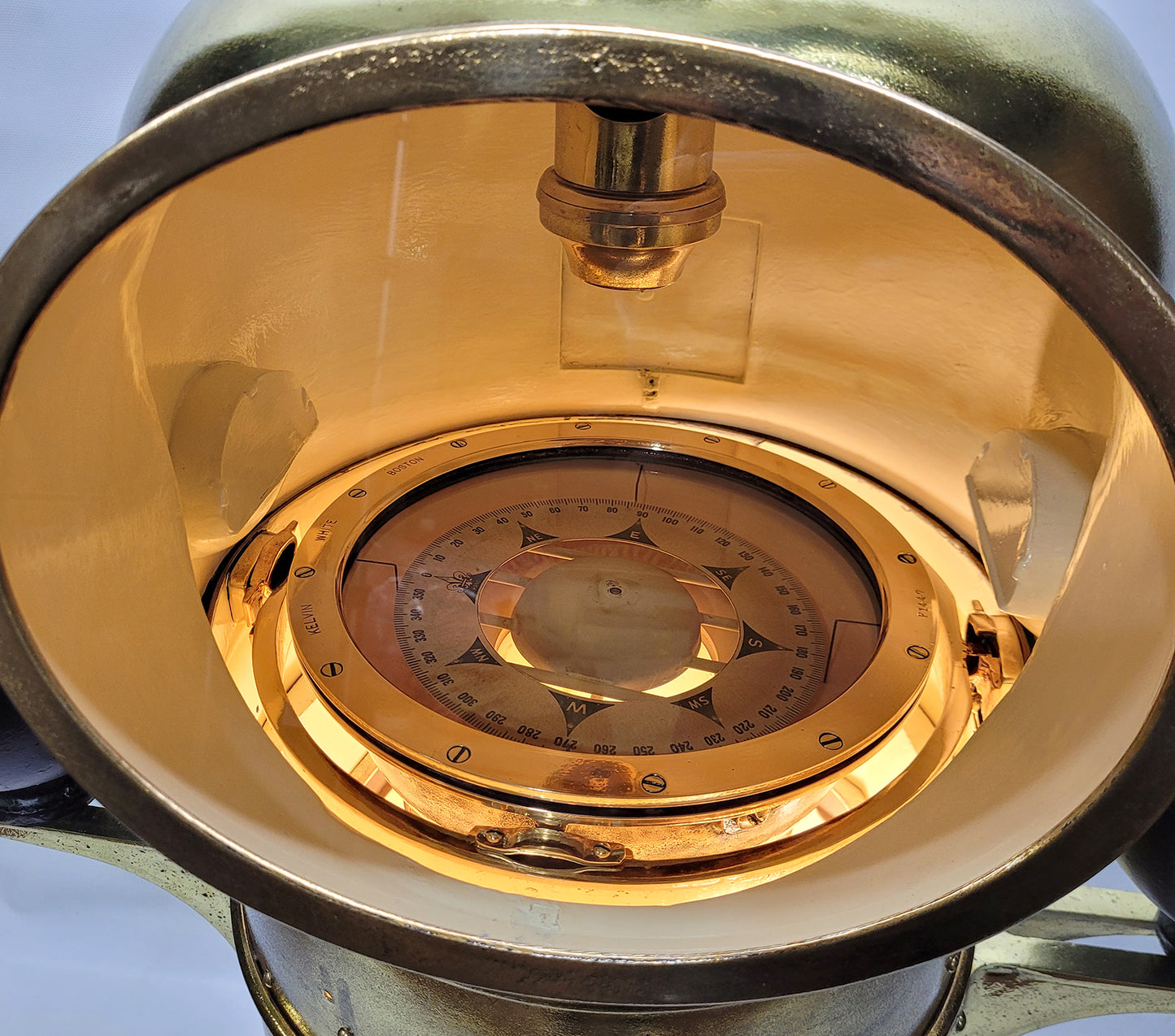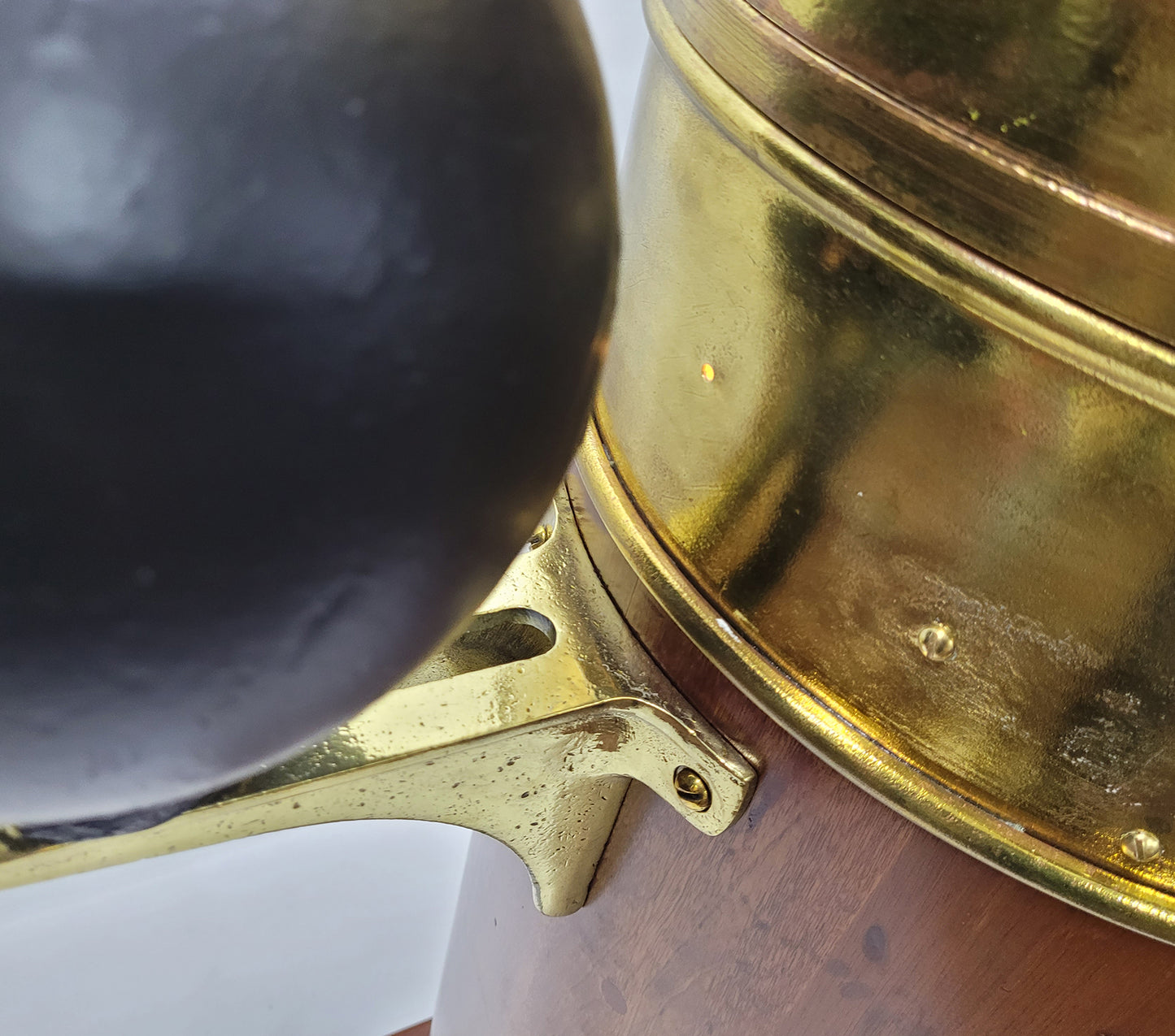 Five brasses have been meticulously polished and lacquered. Warm Lighting has been installed inside. A lantern housing is fitted to the hood. Brass bolts and washers are fitted to the base. Iron compensating balls are mounted to the brass brackets.