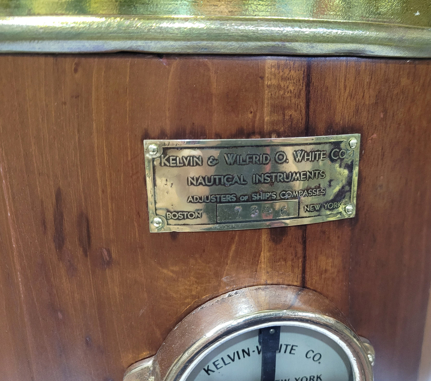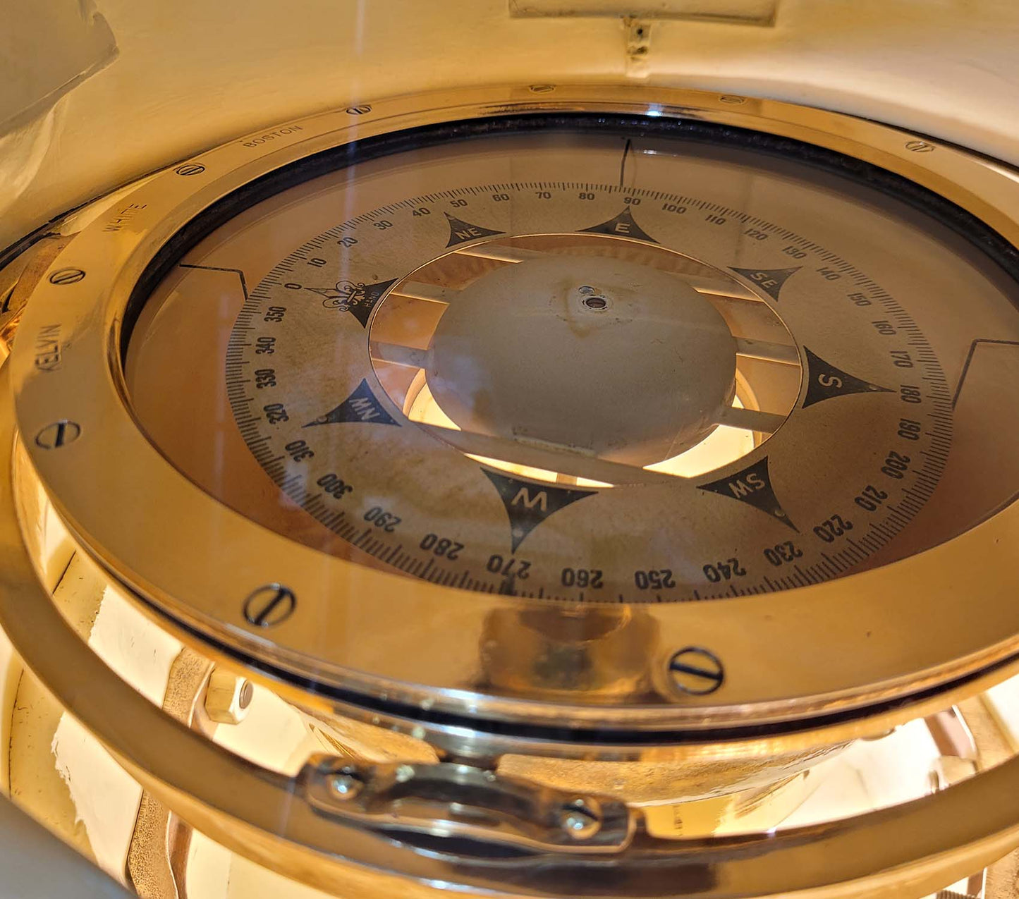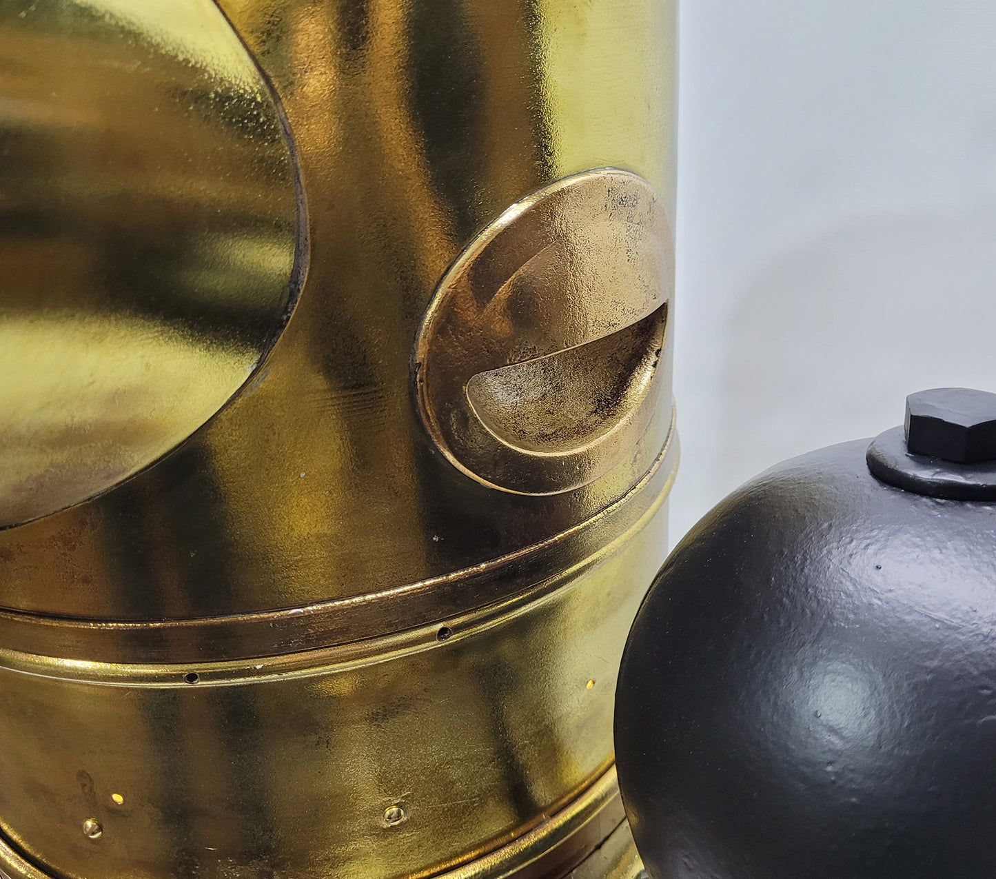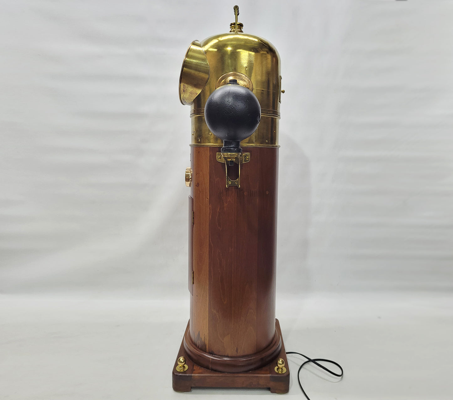 Five brasses have been meticulously polished and lacquered. Warm Lighting has been installed inside. A lantern housing is fitted to the hood. Brass bolts and washers are fitted to the base. Iron compensating balls are mounted to the brass brackets.