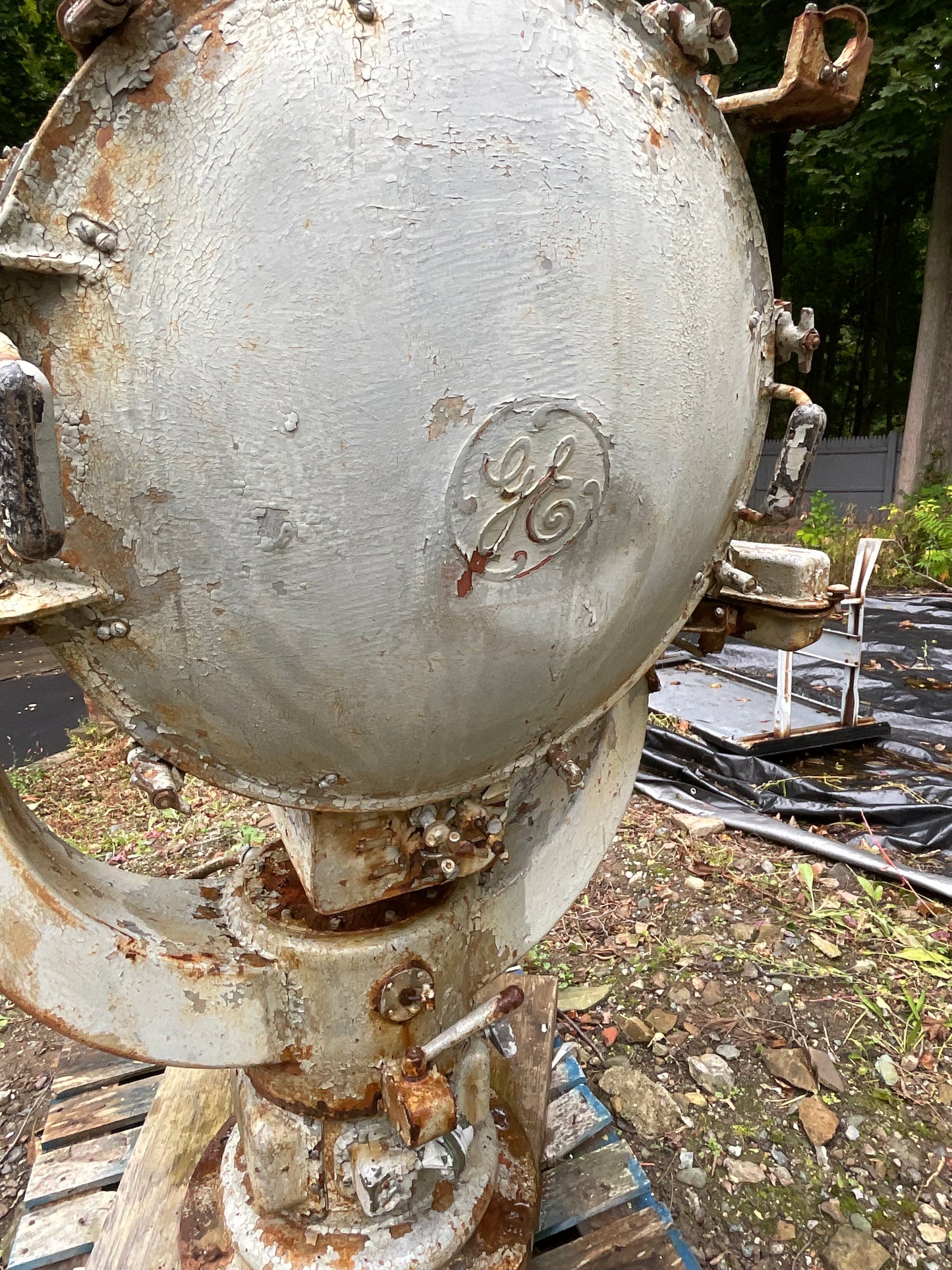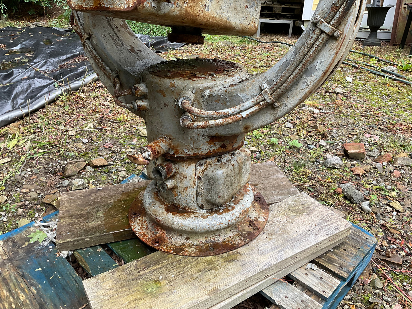 Six foot United States Navy searchlight from a warship. Incredible marine light with huge head with shutter mechanism. Mouted to a very sturdy yoke and stand. Glass lenses are included but not in photograph. We can help loading with our fork lift. Weigh about 1000 pounds. 75" H x 29" W x 37" Diameter.