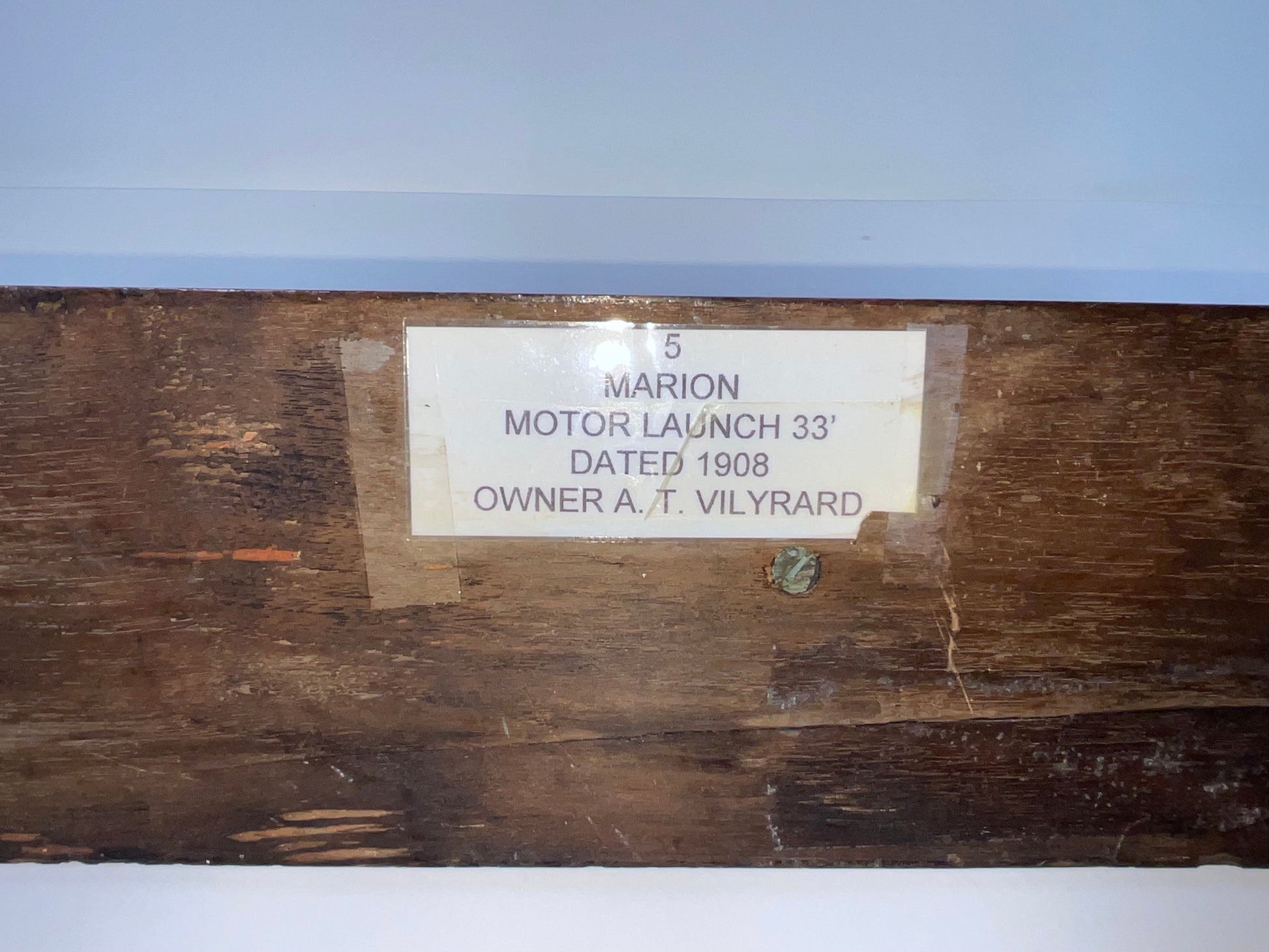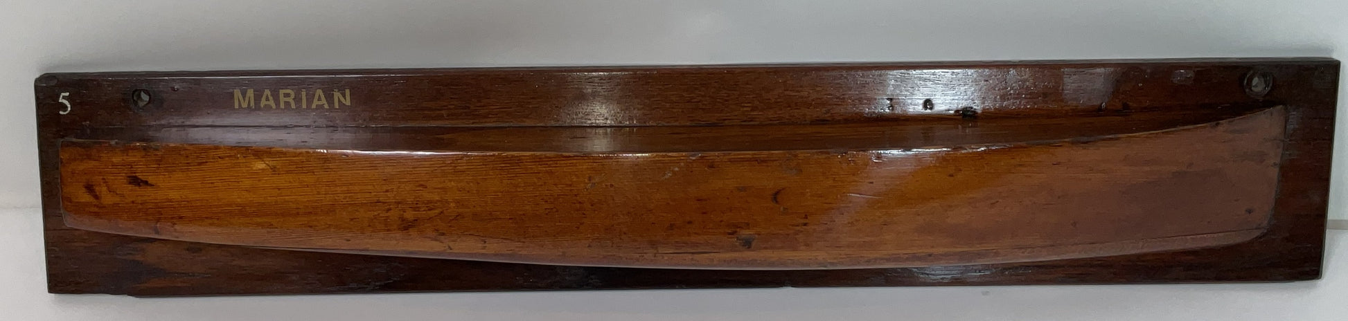 Antique carved half-hull model of a motor yacht with backboard. Note on back reads: “Motor Launch Marion, 33; dated 1908, owner A.T. Vilyard.”