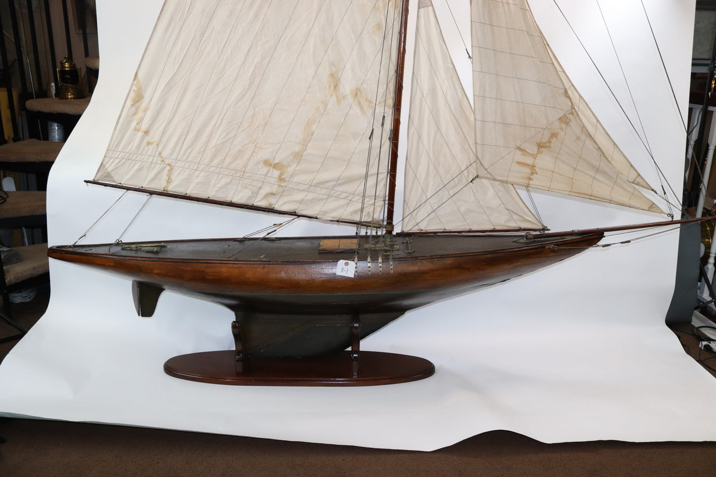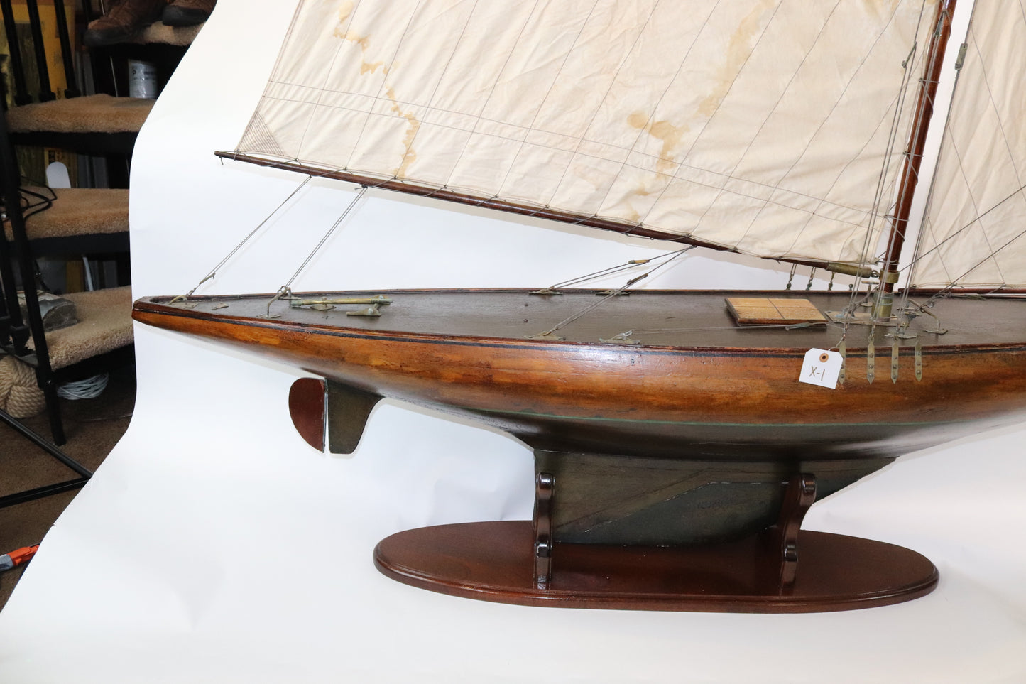 Vintage K class pond yacht with sleek hull, heavy lead keel,brass fittings and a full suit of linen sails. Model weighs 69 pounds