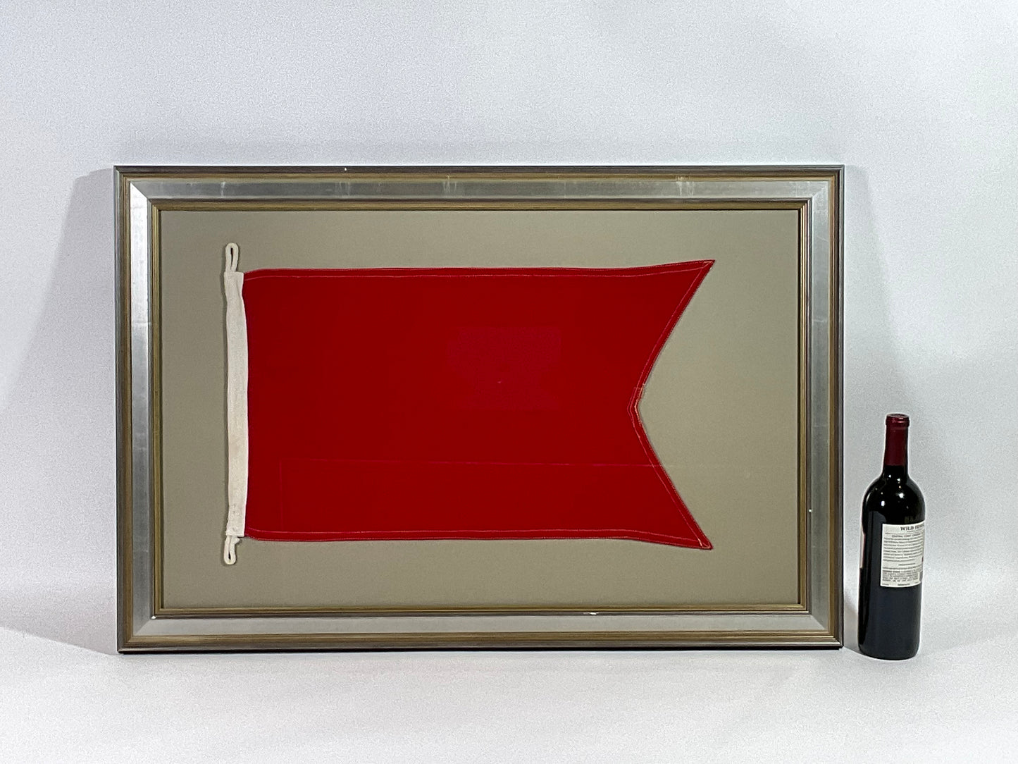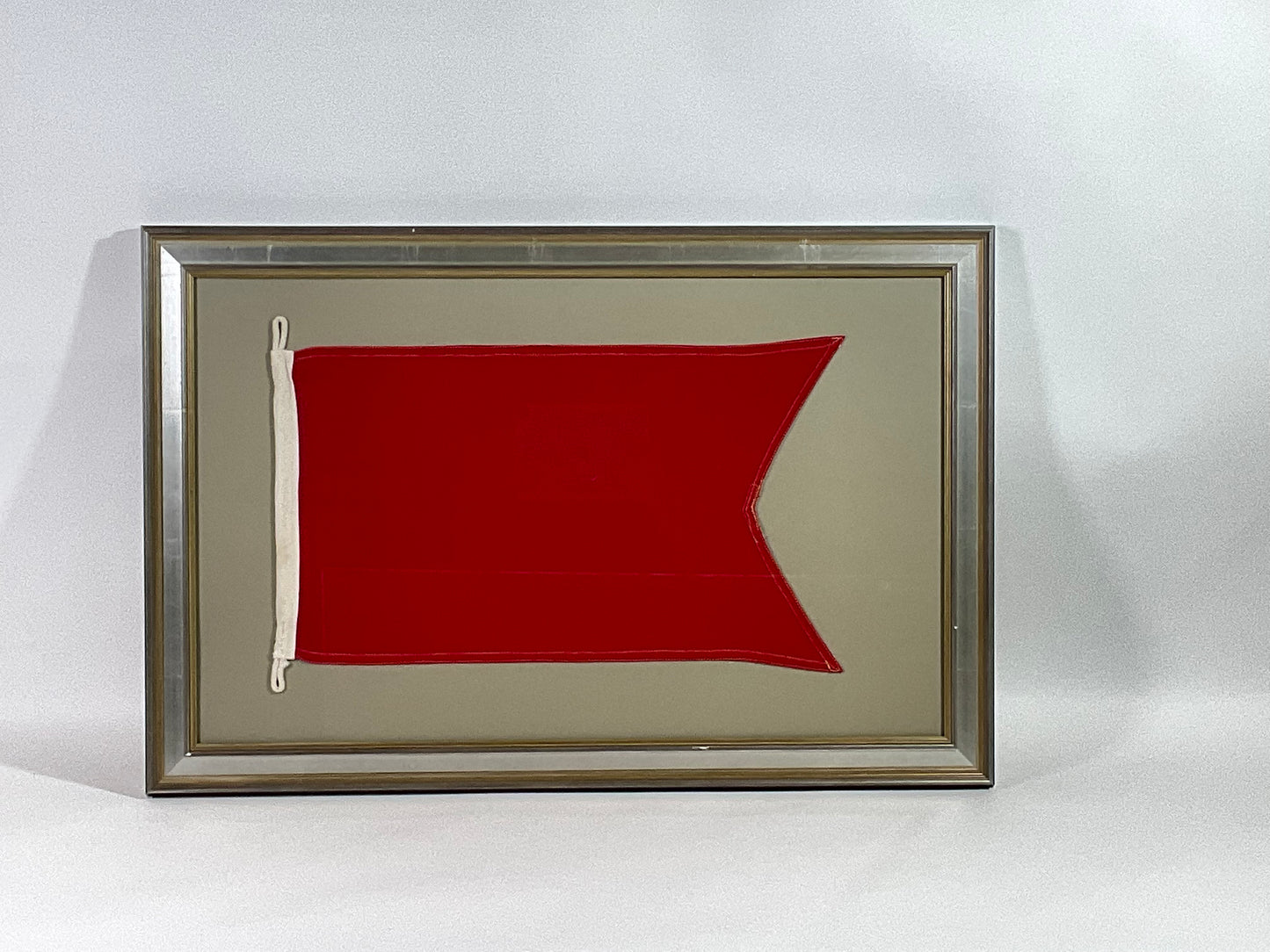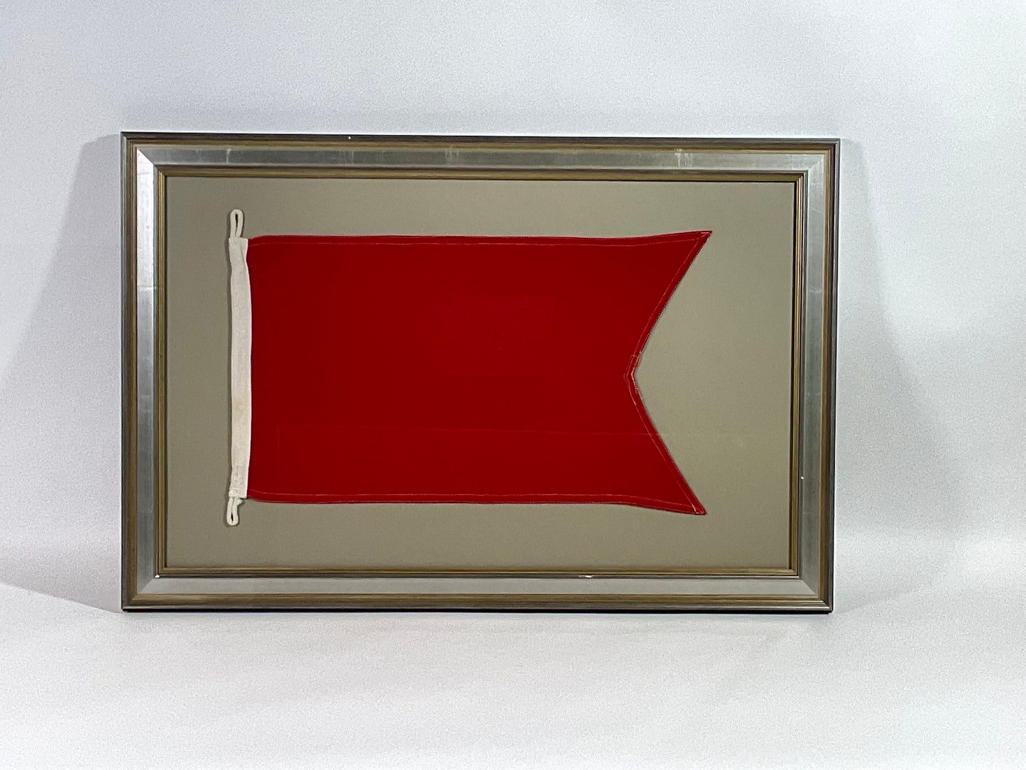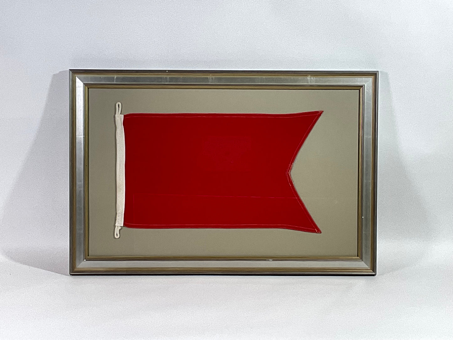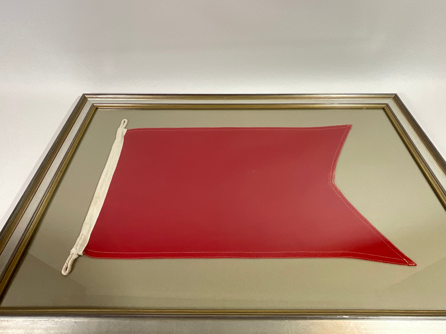 Framed maritime signal flag representing the letter “B” in the international code of signals. This authentic and ocean used pennant is made of an individual panel of red. Fitted to a heavy canvas hoist band with rigging tabs. This nautical relic is mounted into a custom frame.