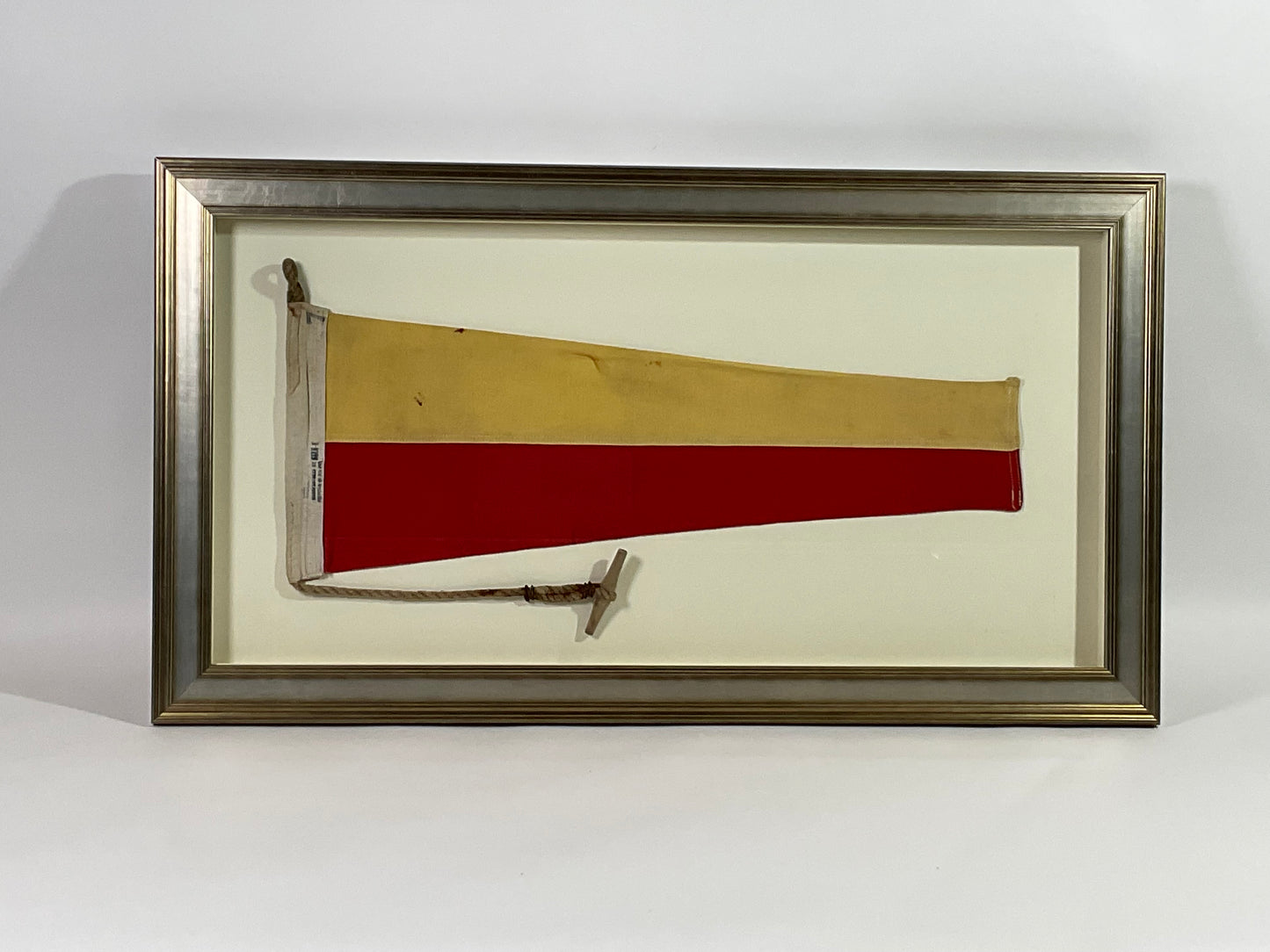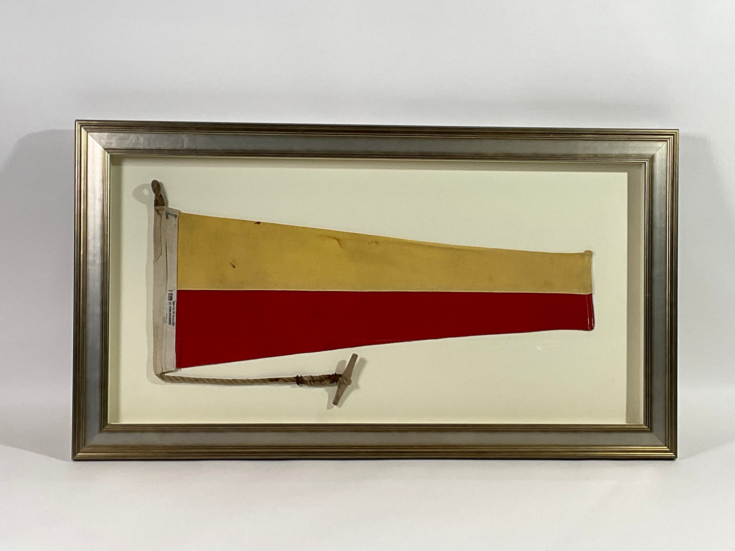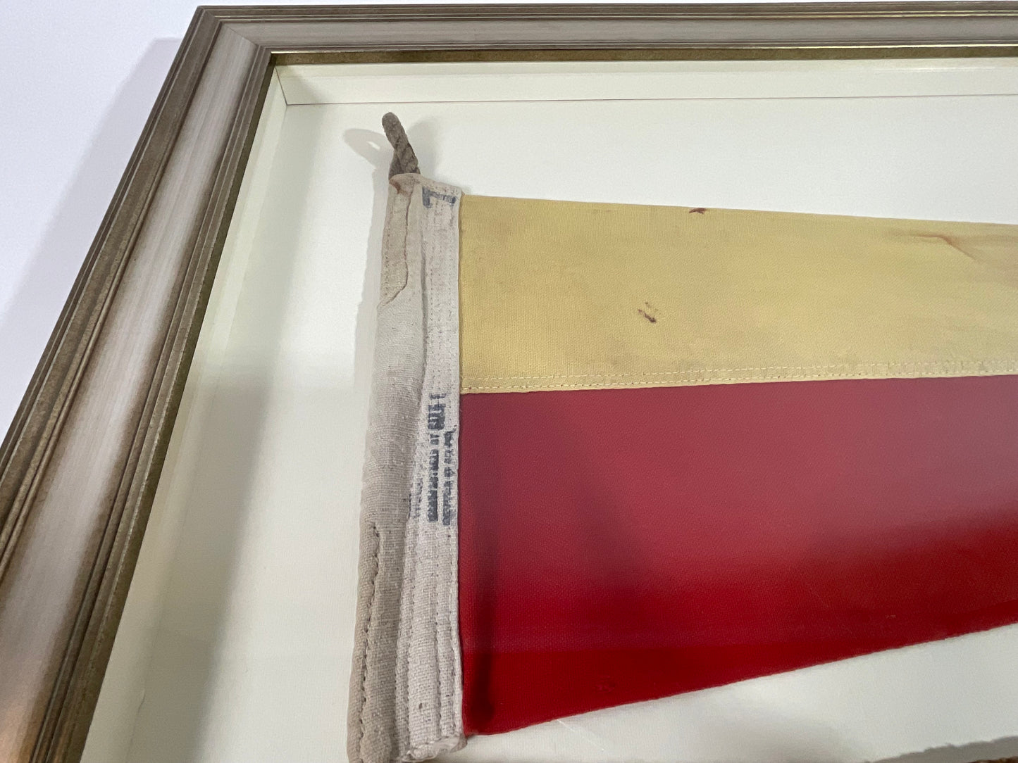 Framed maritime signal flag representing the number “7”, “SEVEN” in the international code of signals. This authentic and ocean used pennant is made of individual panels of yellow and red. Fitted to a heavy canvas hoist band with original rope and wood toggle. This nautical relic is mounted into a custom shadowbox frame to accommodate the rope and toggle. Weathered condition.