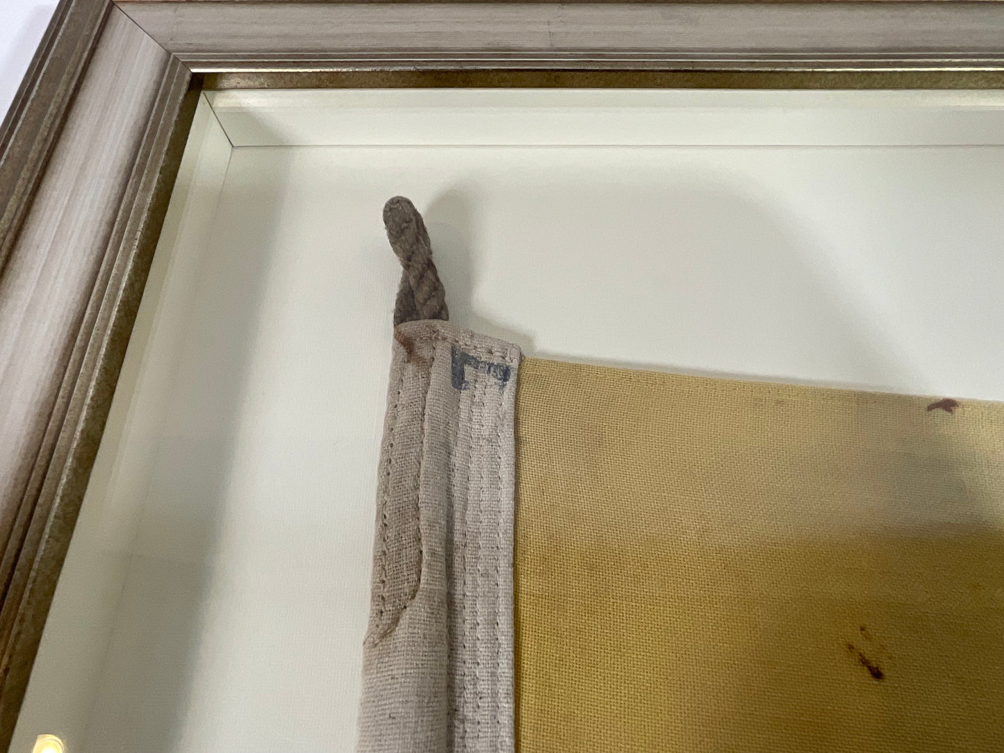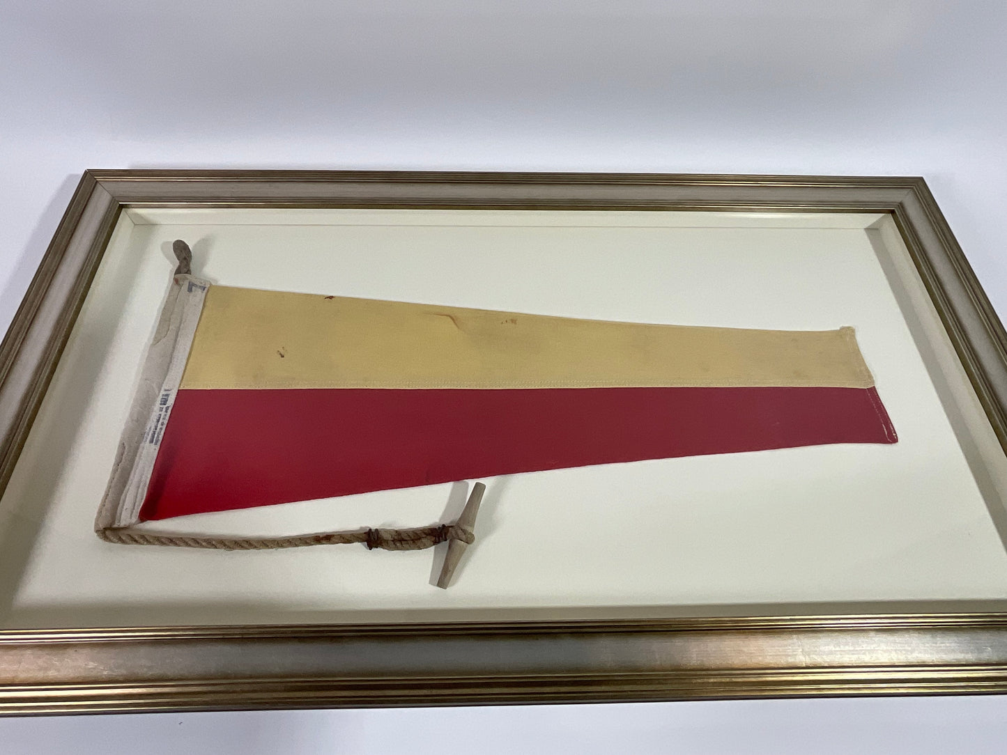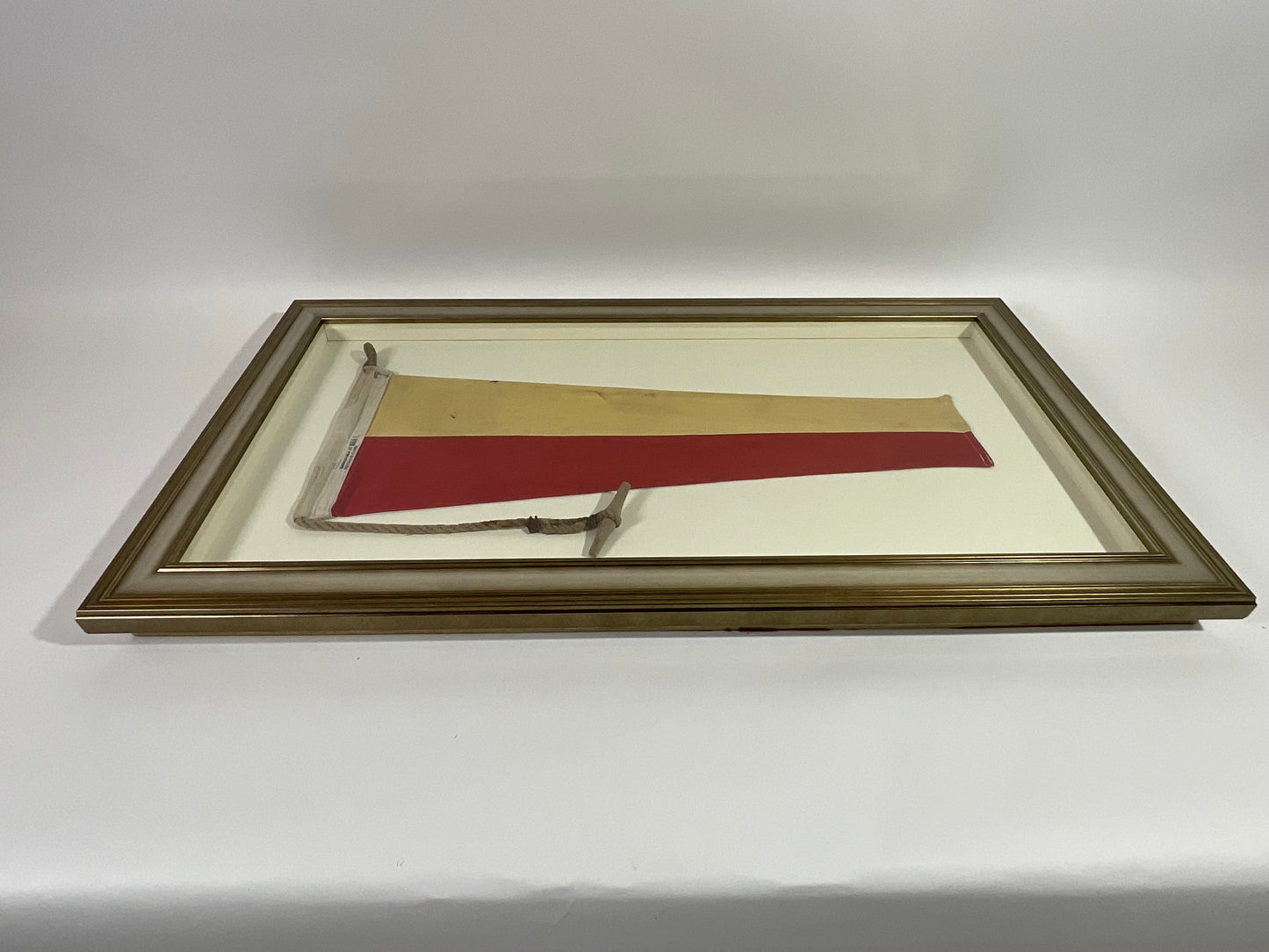 Framed maritime signal flag representing the number “7”, “SEVEN” in the international code of signals. This authentic and ocean used pennant is made of individual panels of yellow and red. Fitted to a heavy canvas hoist band with original rope and wood toggle. This nautical relic is mounted into a custom shadowbox frame to accommodate the rope and toggle. Weathered condition.
