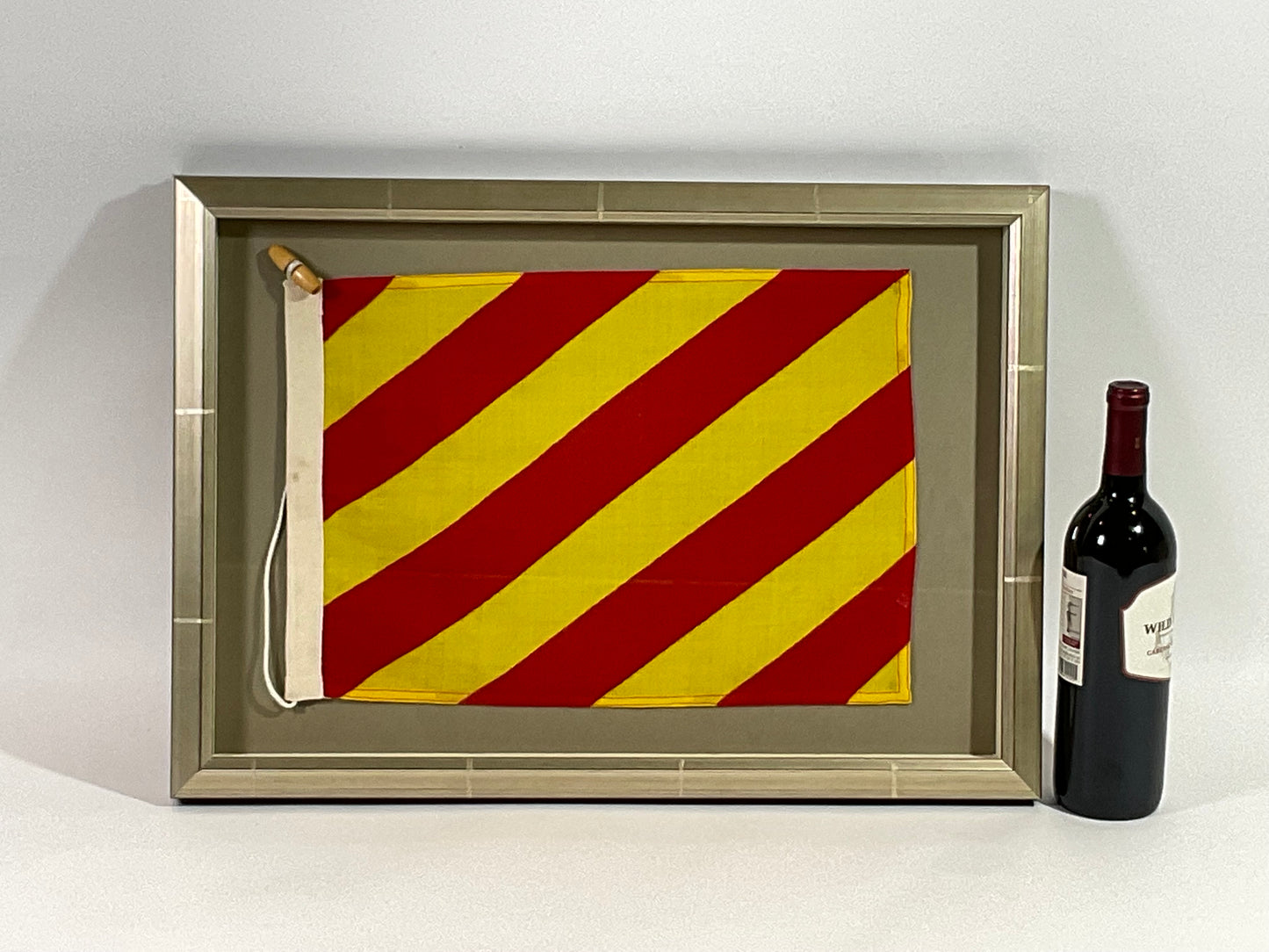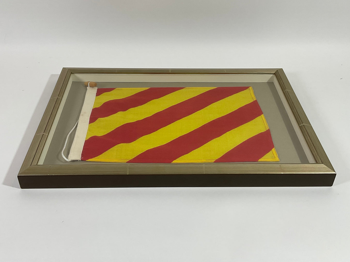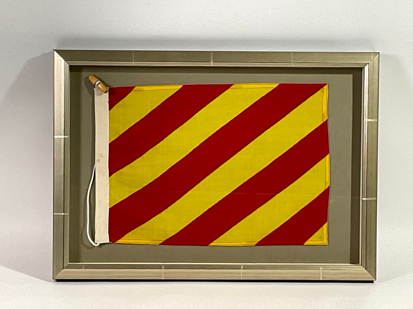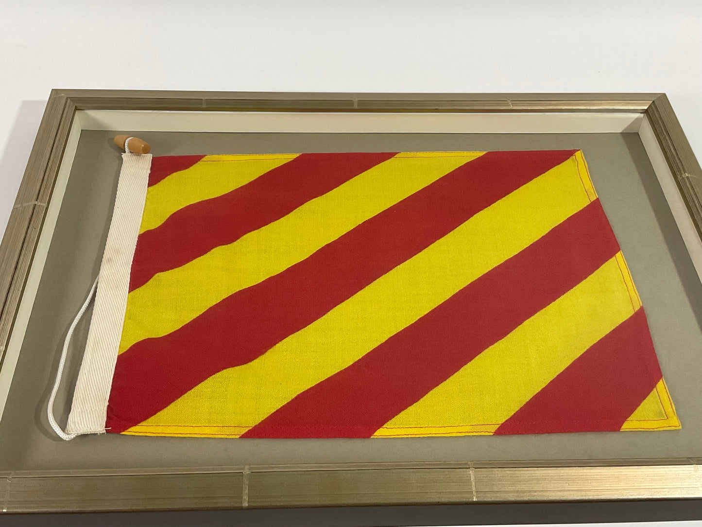 Framed maritime signal flag representing the letter “Y”, “YANKEE” in the international code of signals. This authentic pennant has yellow and red stripes and is fitted to a heavy canvas hoist band with original cord and wood toggle. This nautical relic is mounted into a custom shadowbox frame to accommodate the rope and toggle.