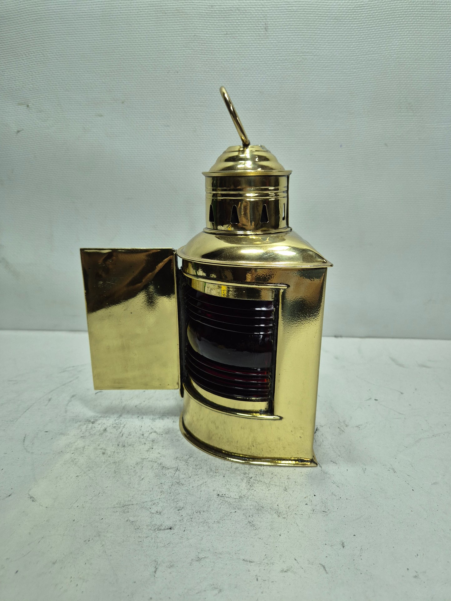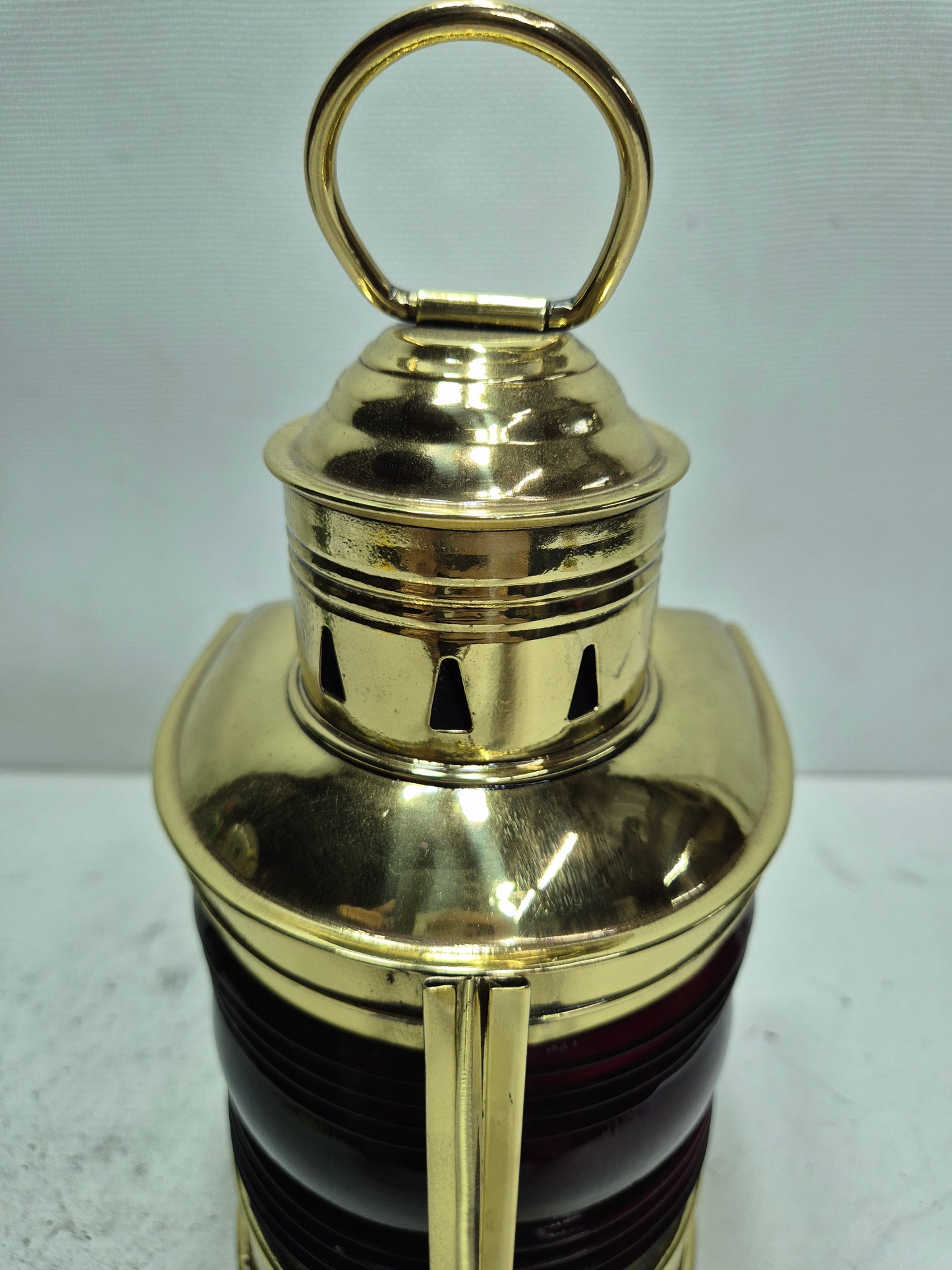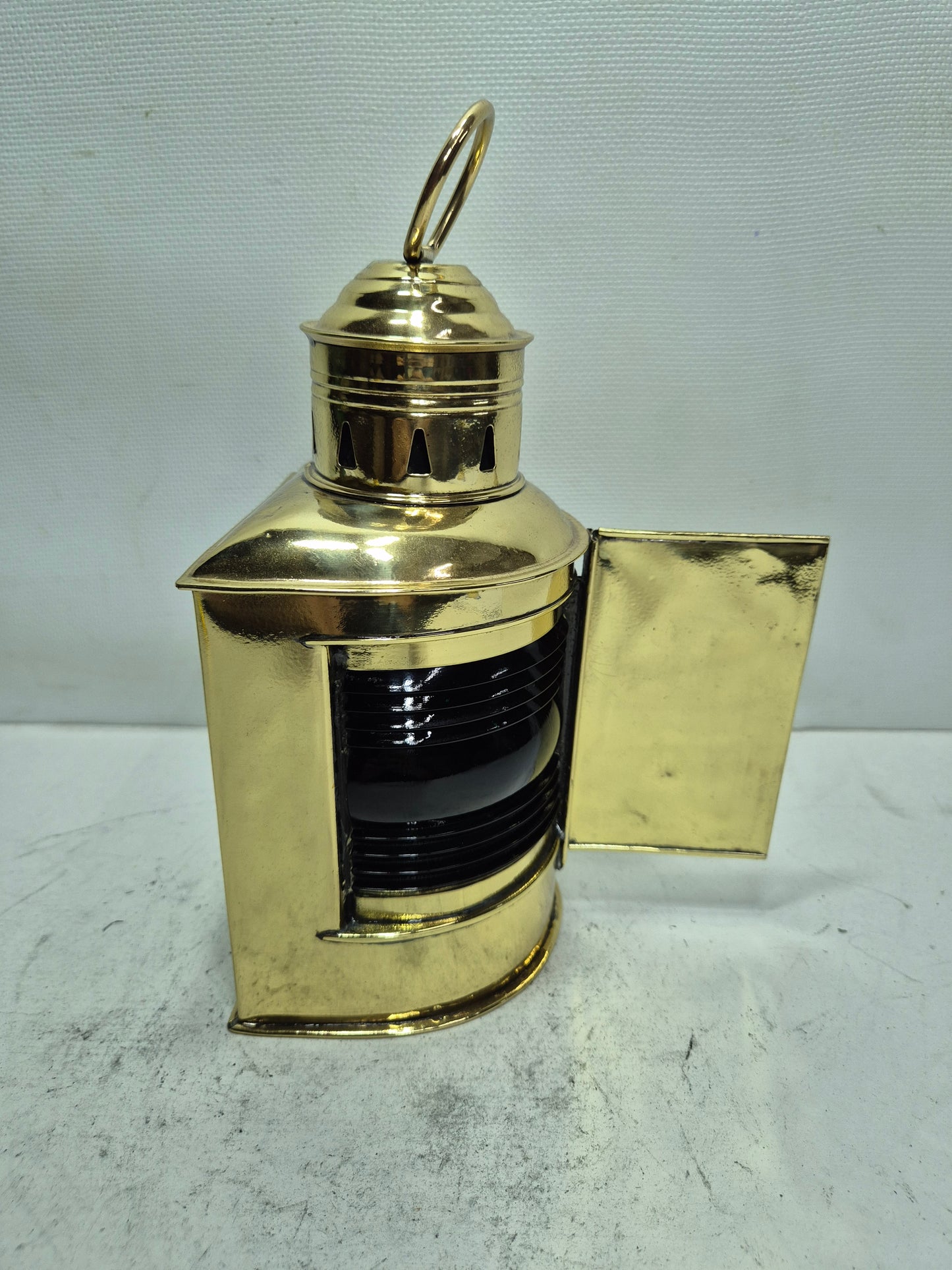 Highly polished and lacquered yacht lantern with red and green Fresnel glass lenses. The lantern is fitted with a center vane. Vented turret top with a carry ring. No burner. Awesome restoration of a choice lantern. 10"H x 4"W x 9"D (including centervain).