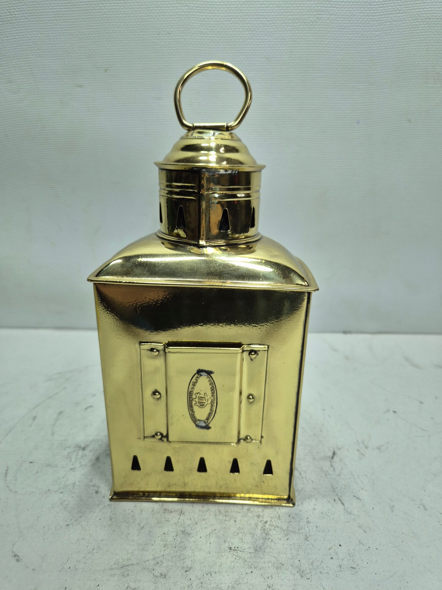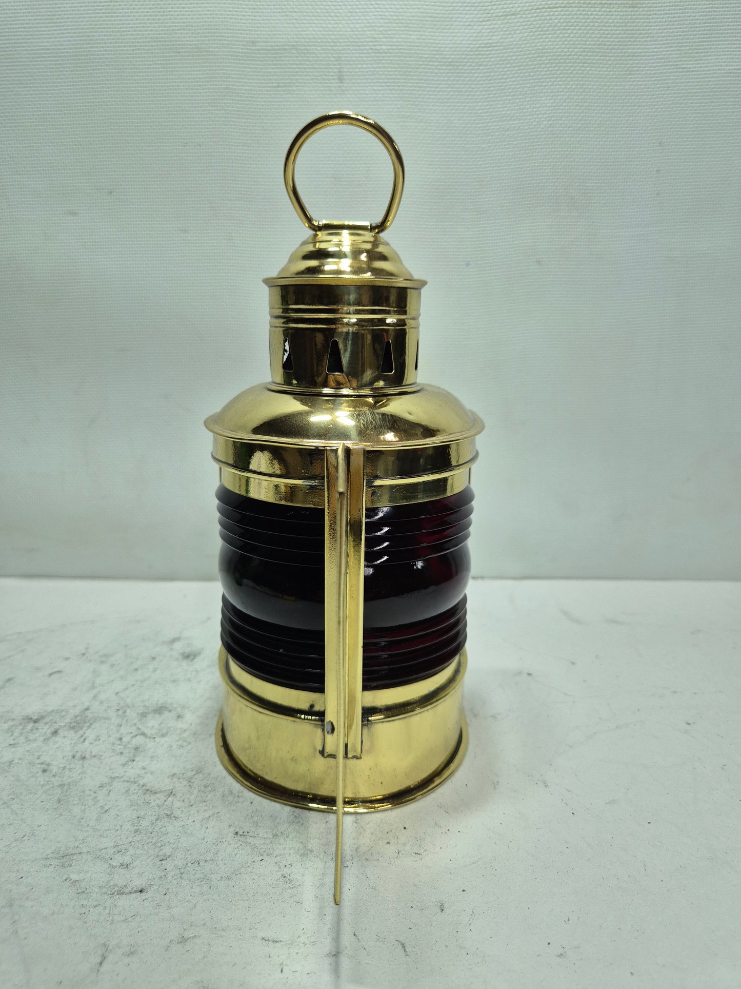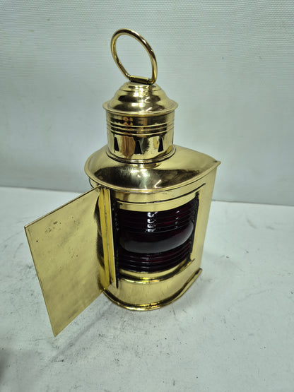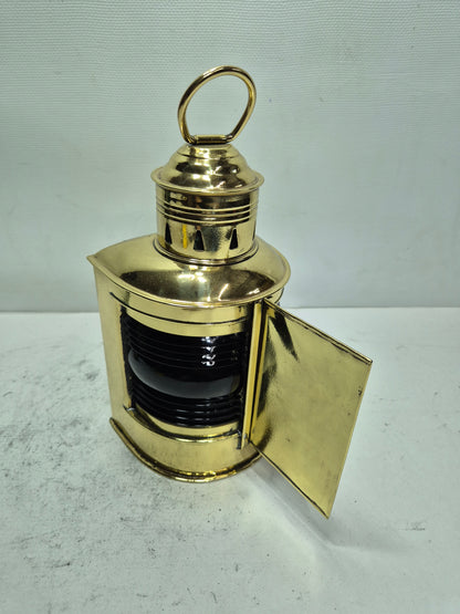 Highly polished and lacquered yacht lantern with red and green Fresnel glass lenses. The lantern is fitted with a center vane. Vented turret top with a carry ring. No burner. Awesome restoration of a choice lantern. 10"H x 4"W x 9"D (including centervain).