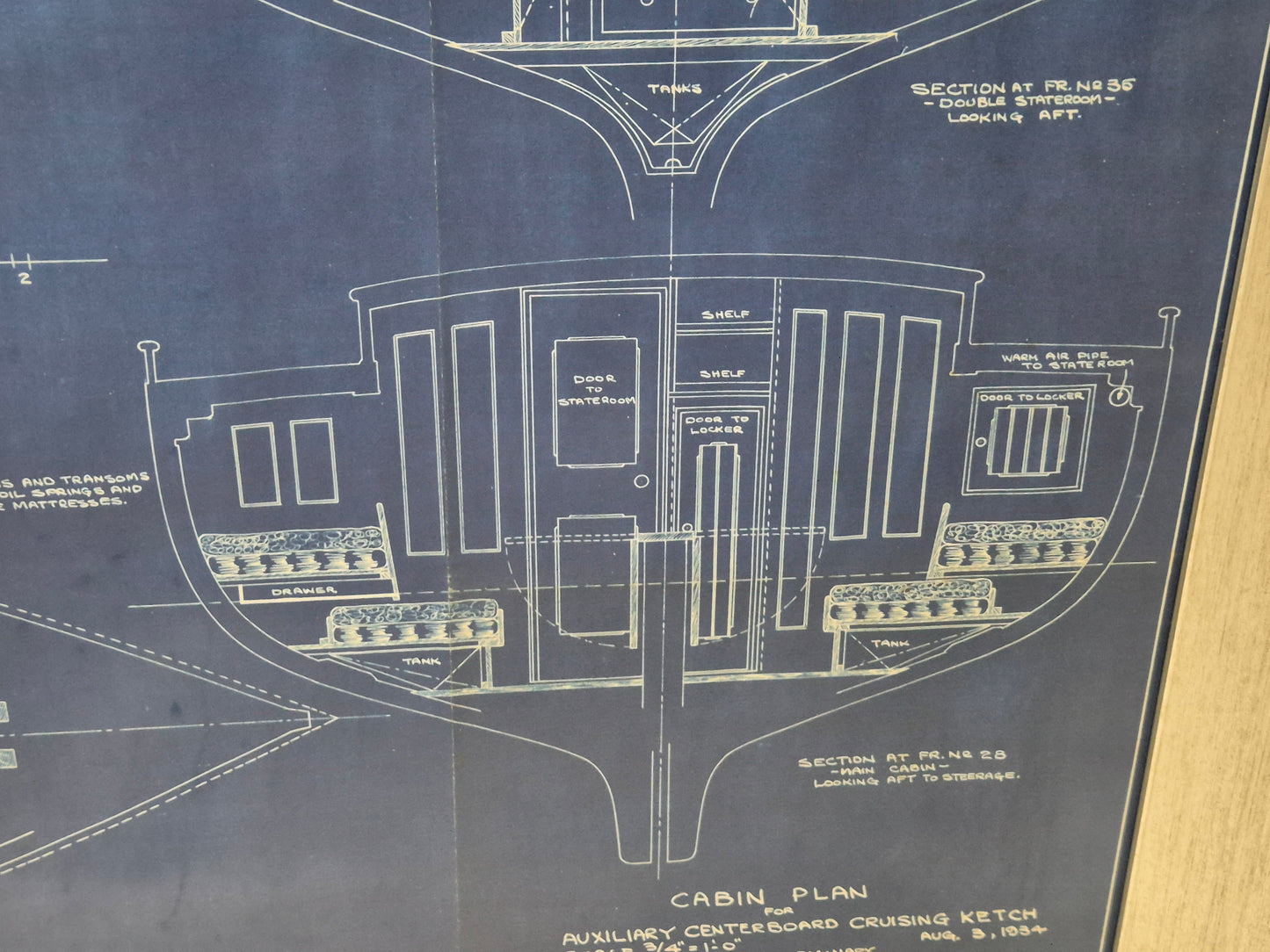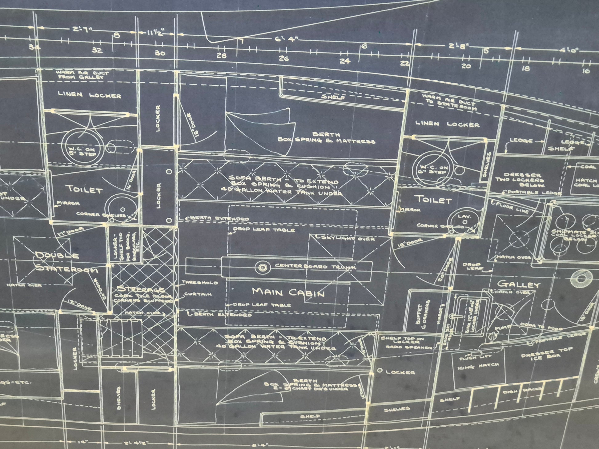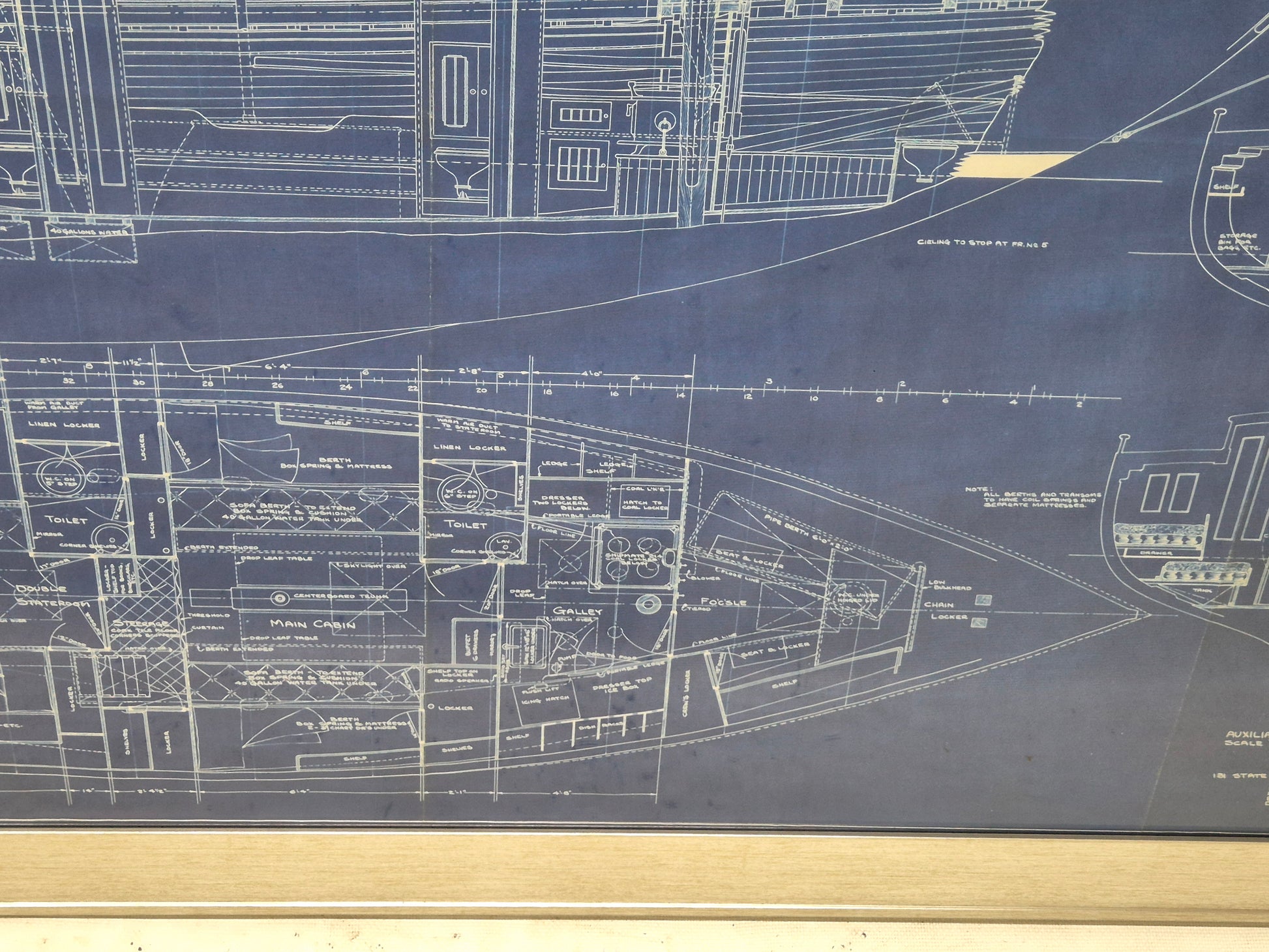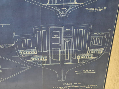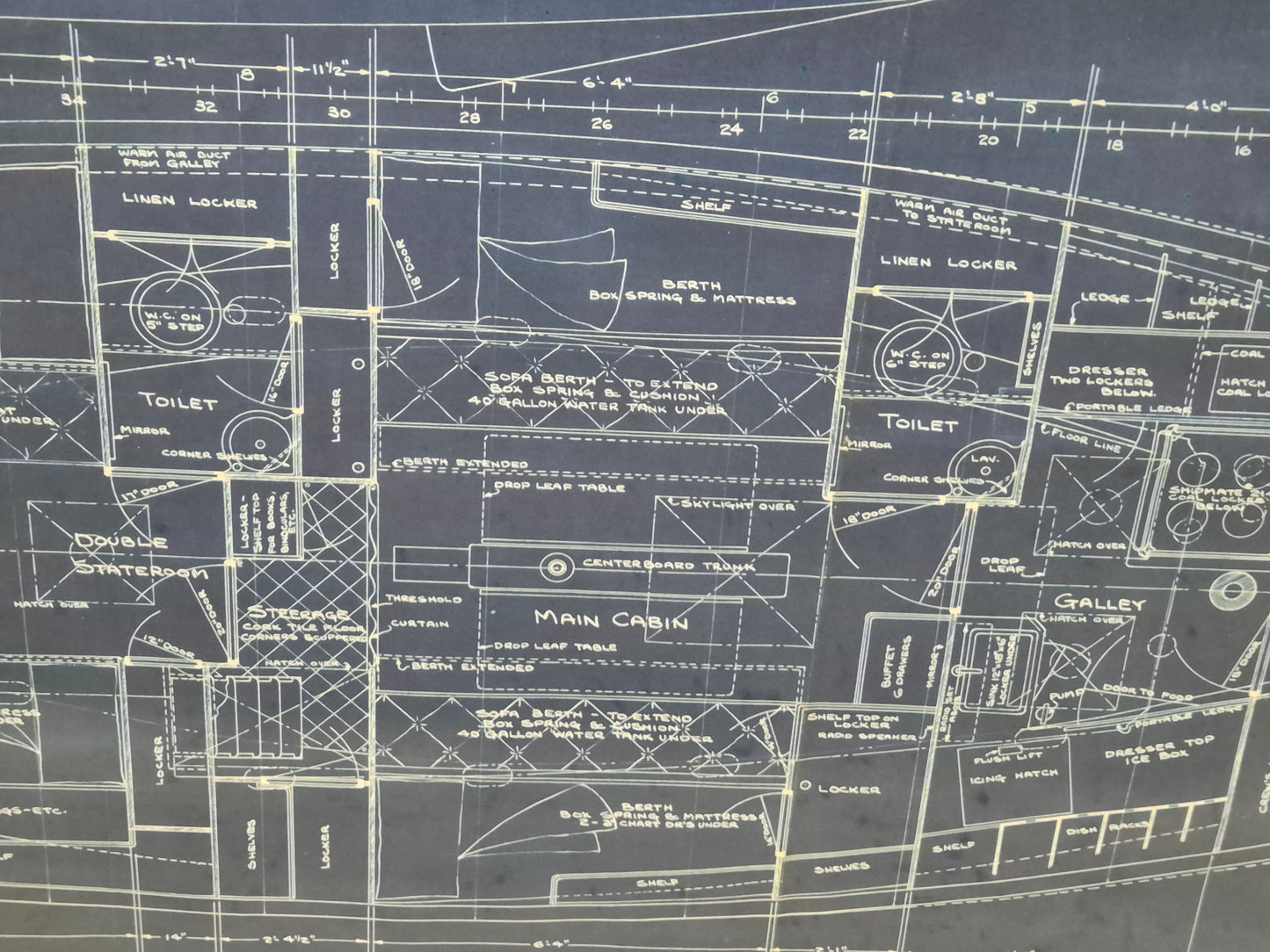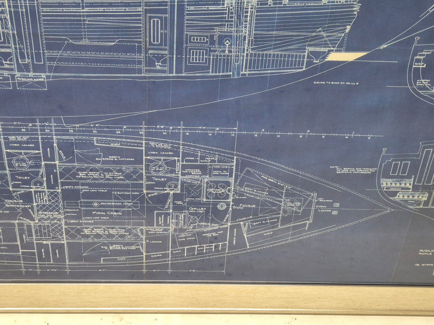 First-class piece of maritime art is this original blueprint of a sailing yacht. The legend panel reads "Cabin plan for Auxiliary" centerboard cruising ketch, scale 3/4 inch equals one foot. August 3, 1934. Made by W.F. McNary. LOA 50'5 3/4", LWL 36'4", Beam Extreme 13'3", Draft of hull 5'2 1/2". This is one of the absolute best blueprints in our spectacular offerings. It has cabins, bunks, stateroom, galley, shelves, linen closets, so many details in a big scale. So much to study and admire.