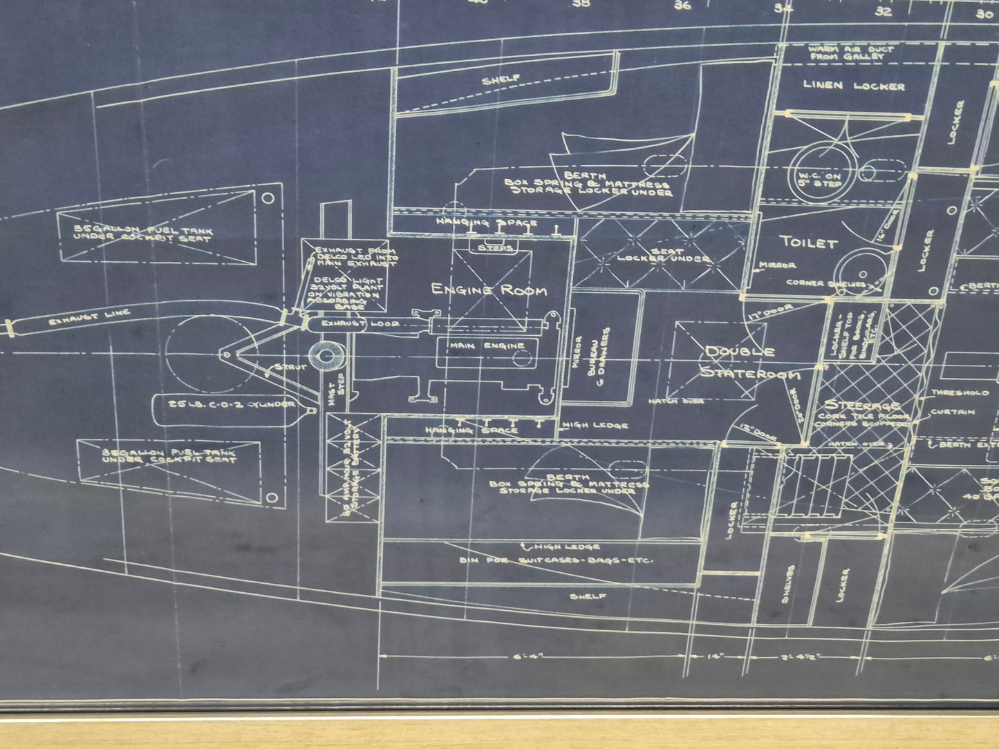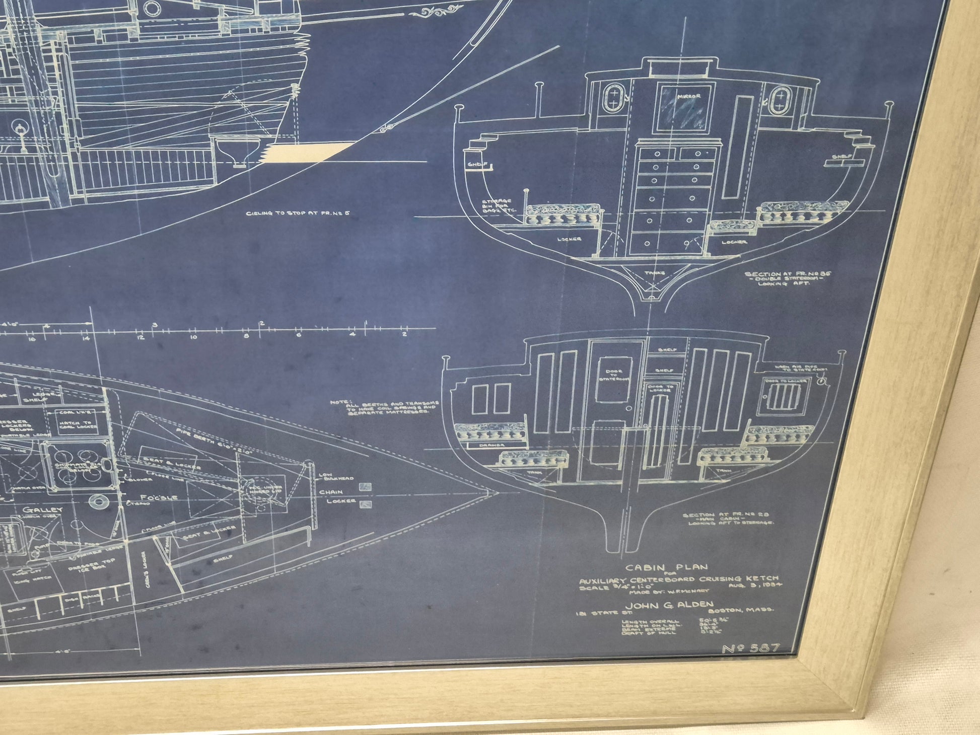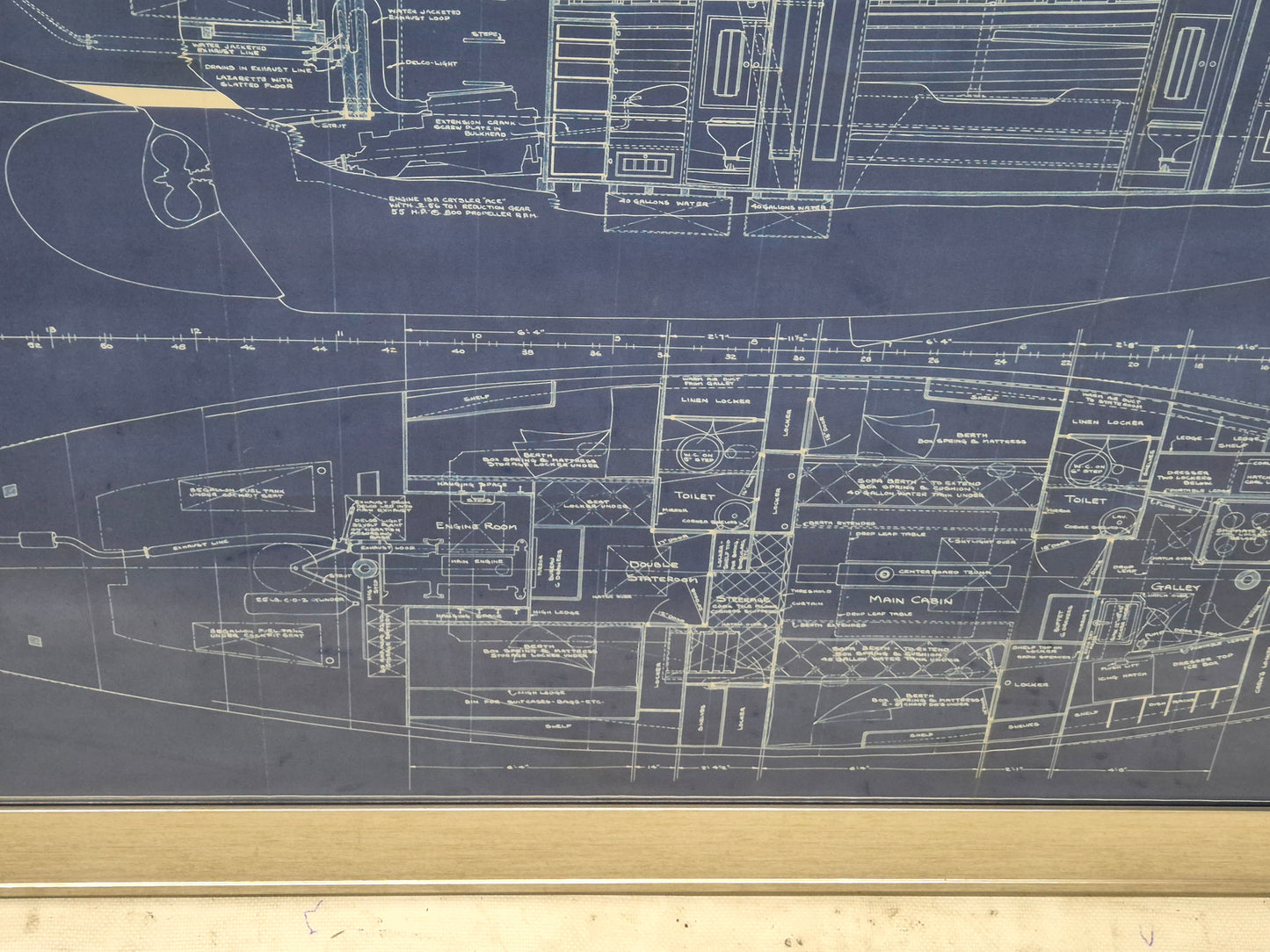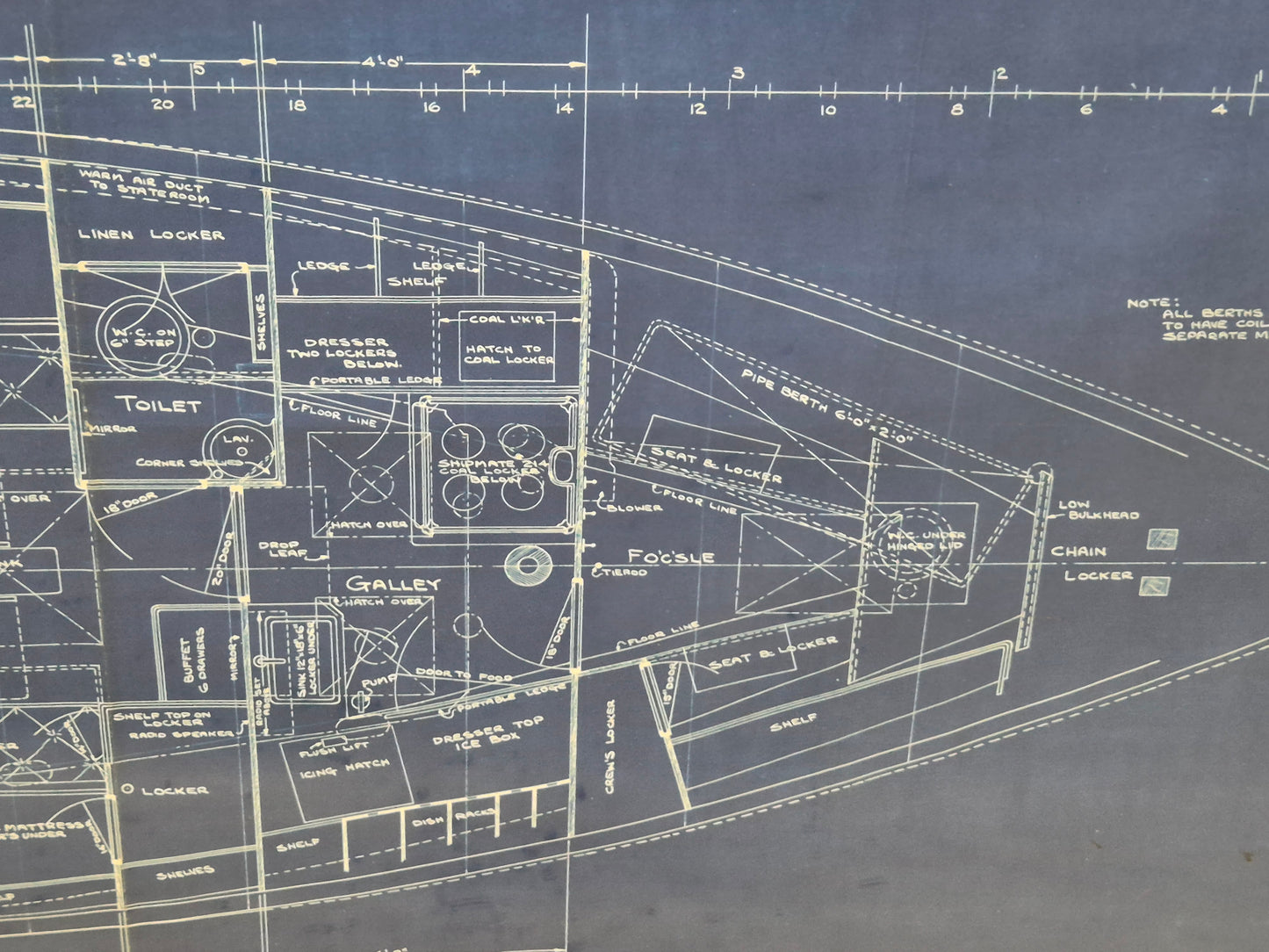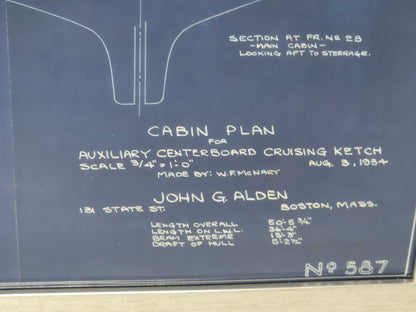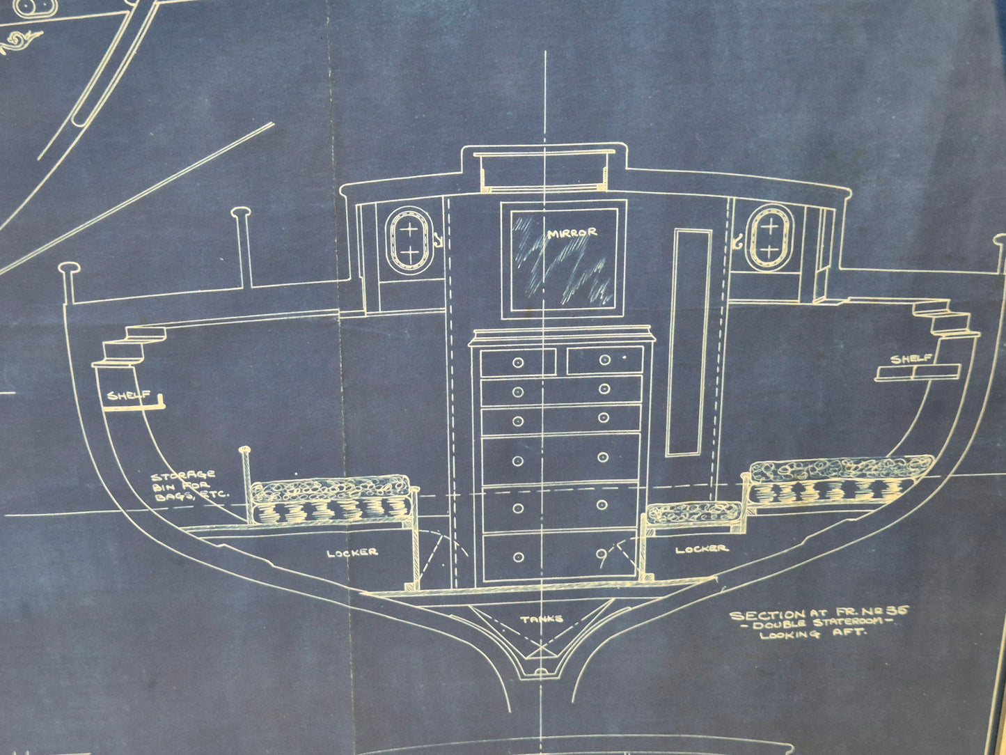First-class piece of maritime art is this original blueprint of a sailing yacht. The legend panel reads "Cabin plan for Auxiliary" centerboard cruising ketch, scale 3/4 inch equals one foot. August 3, 1934. Made by W.F. McNary. LOA 50'5 3/4", LWL 36'4", Beam Extreme 13'3", Draft of hull 5'2 1/2". This is one of the absolute best blueprints in our spectacular offerings. It has cabins, bunks, stateroom, galley, shelves, linen closets, so many details in a big scale. So much to study and admire.