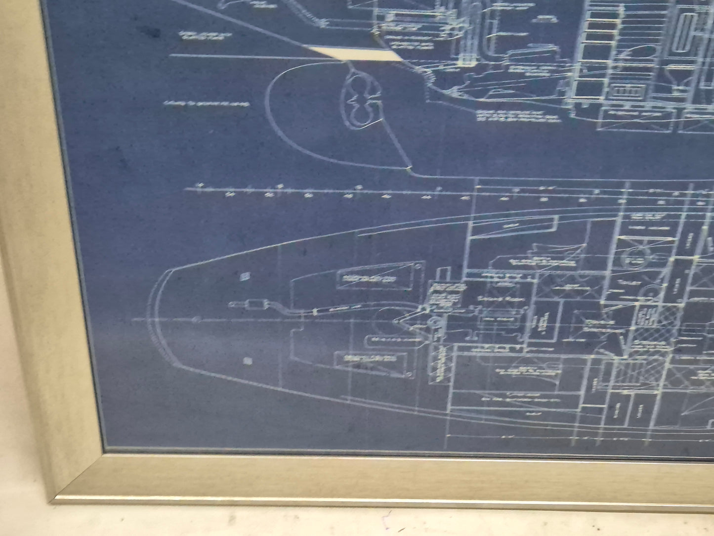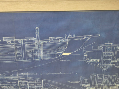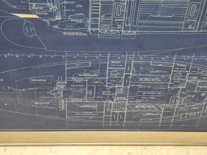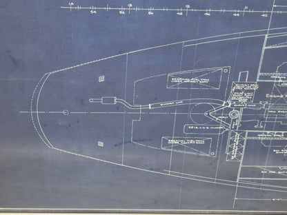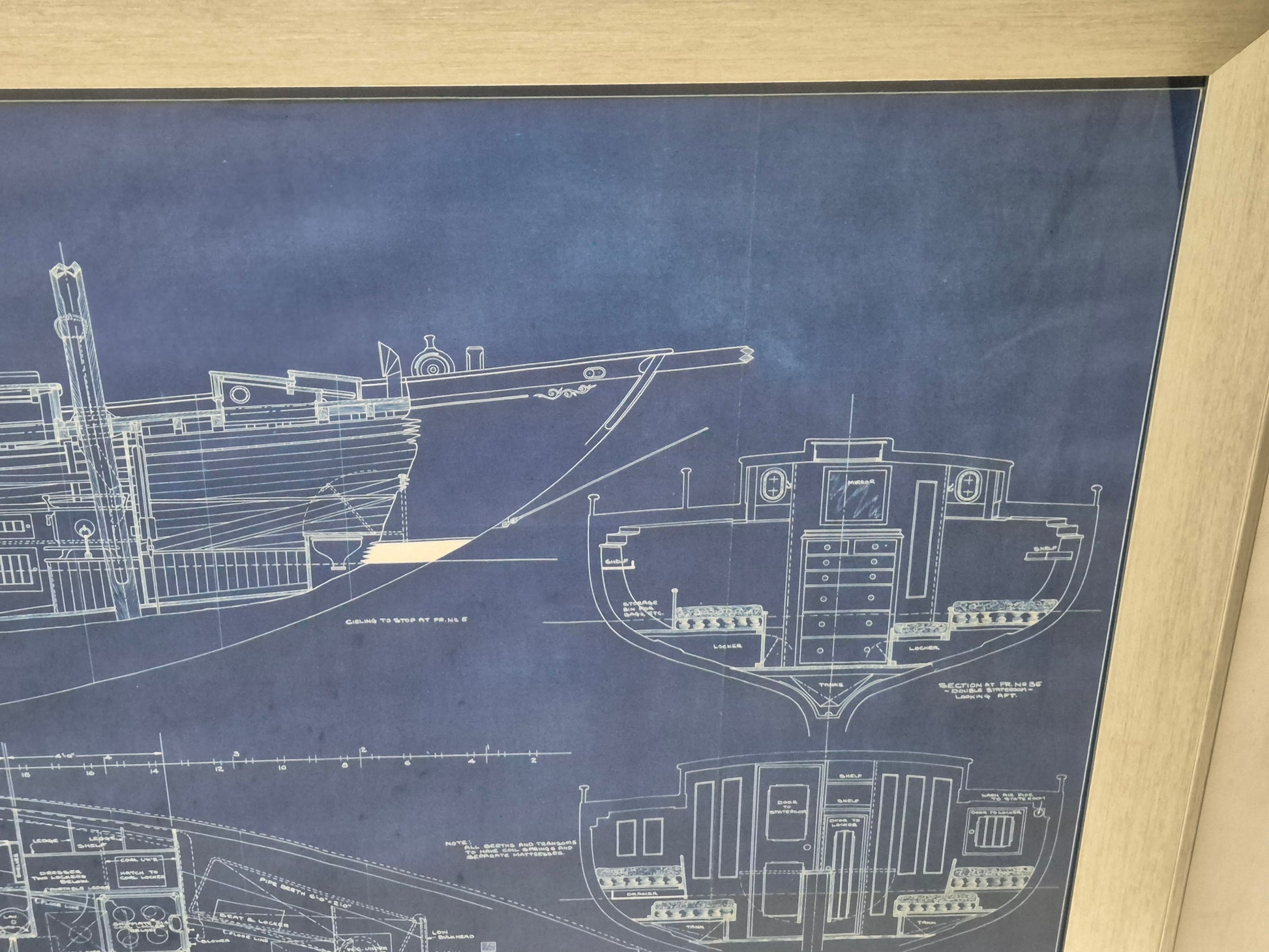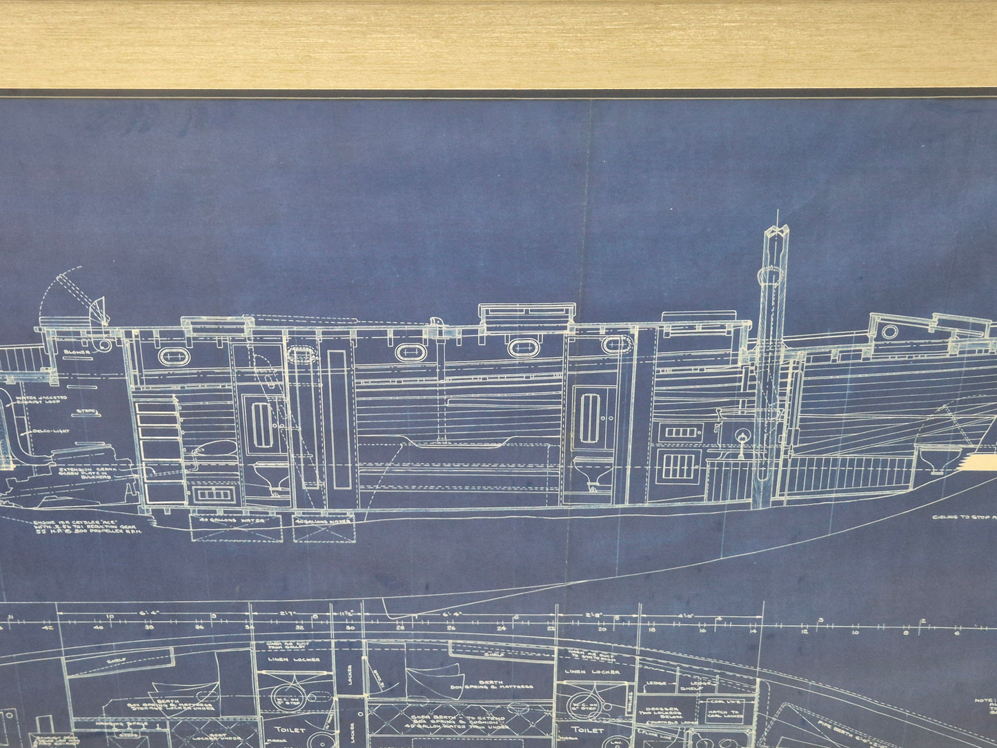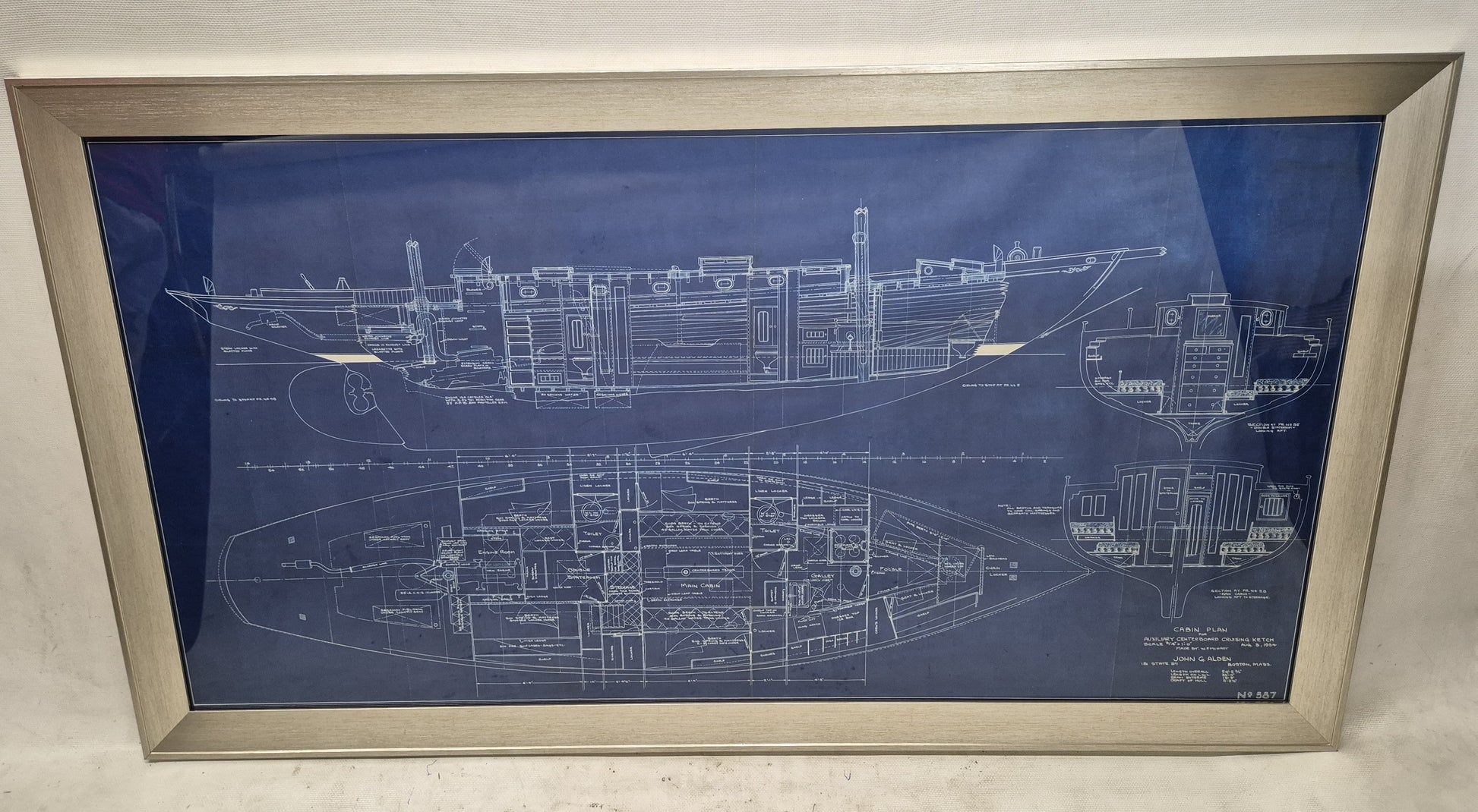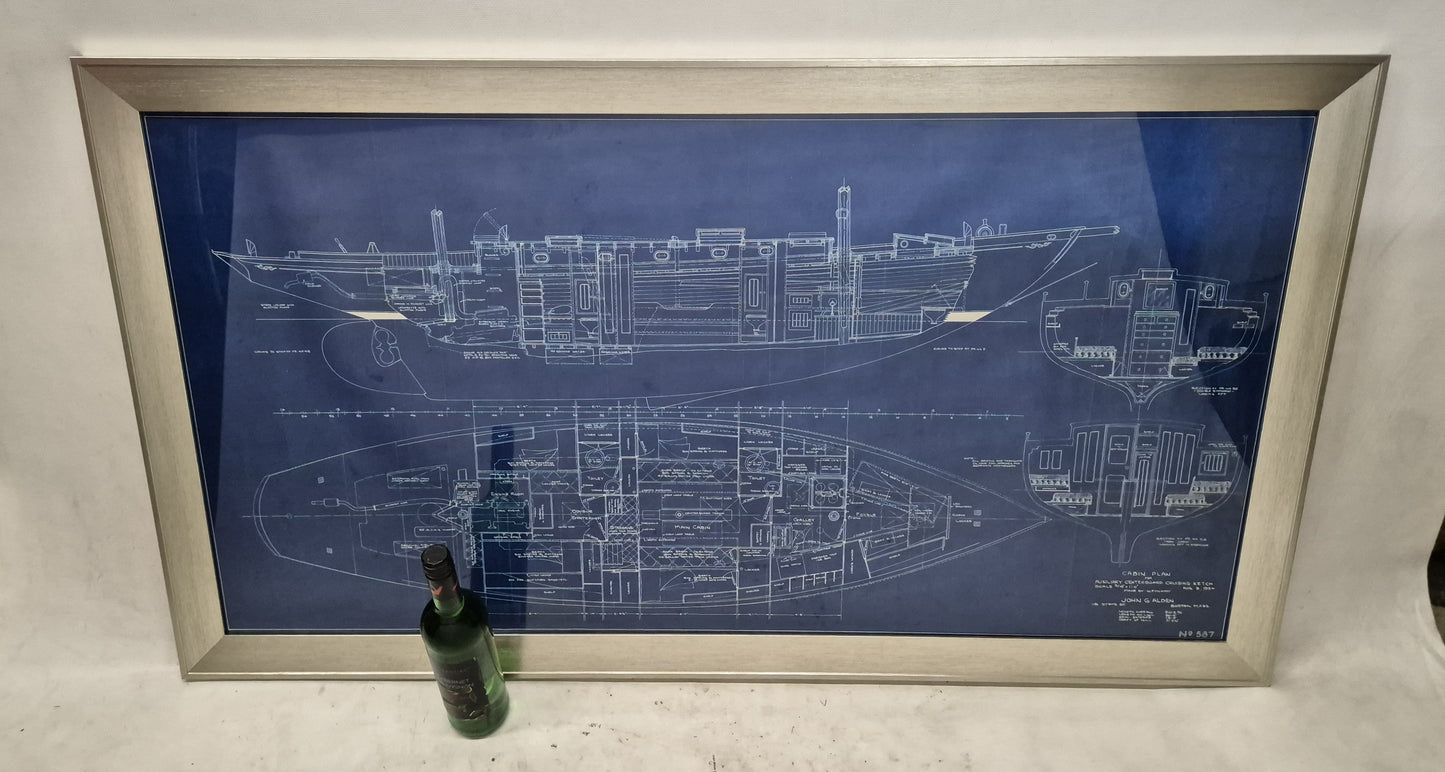 First-class piece of maritime art is this original blueprint of a sailing yacht. The legend panel reads "Cabin plan for Auxiliary" centerboard cruising ketch, scale 3/4 inch equals one foot. August 3, 1934. Made by W.F. McNary. LOA 50'5 3/4", LWL 36'4", Beam Extreme 13'3", Draft of hull 5'2 1/2". This is one of the absolute best blueprints in our spectacular offerings. It has cabins, bunks, stateroom, galley, shelves, linen closets, so many details in a big scale. So much to study and admire.