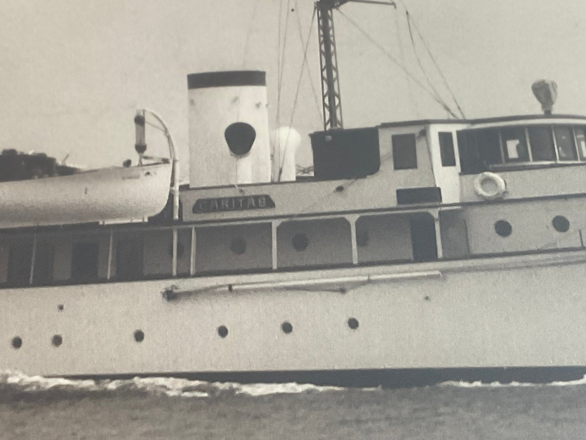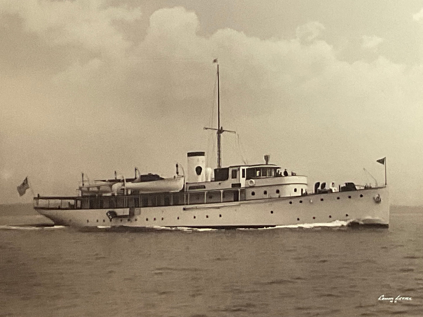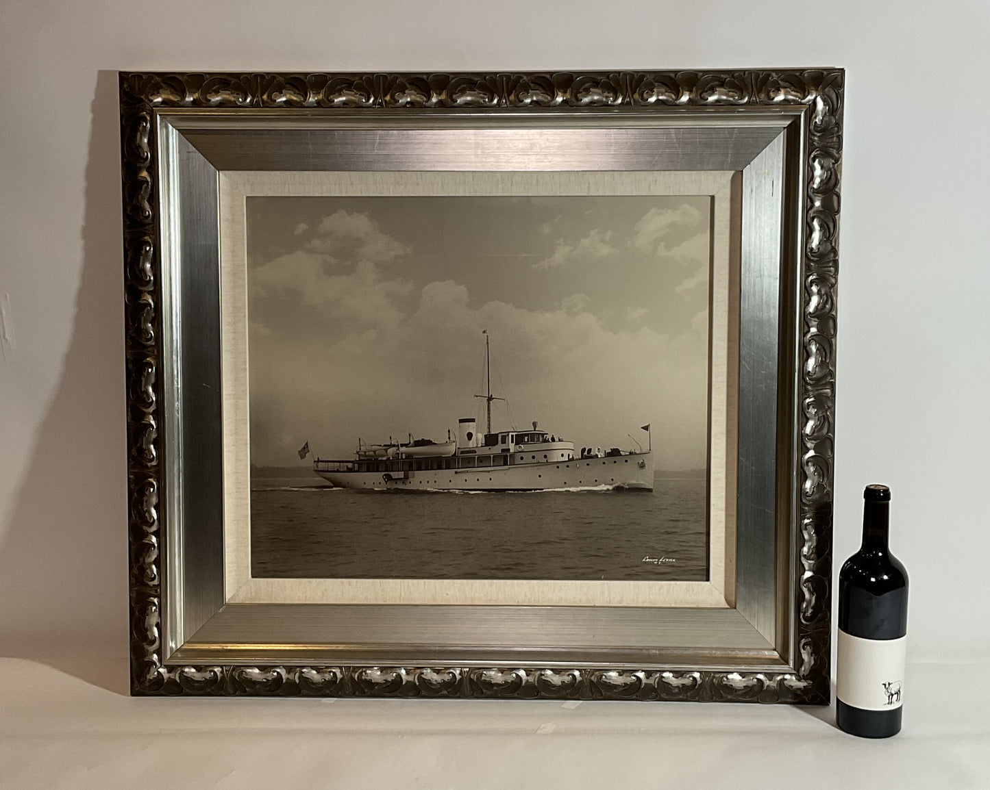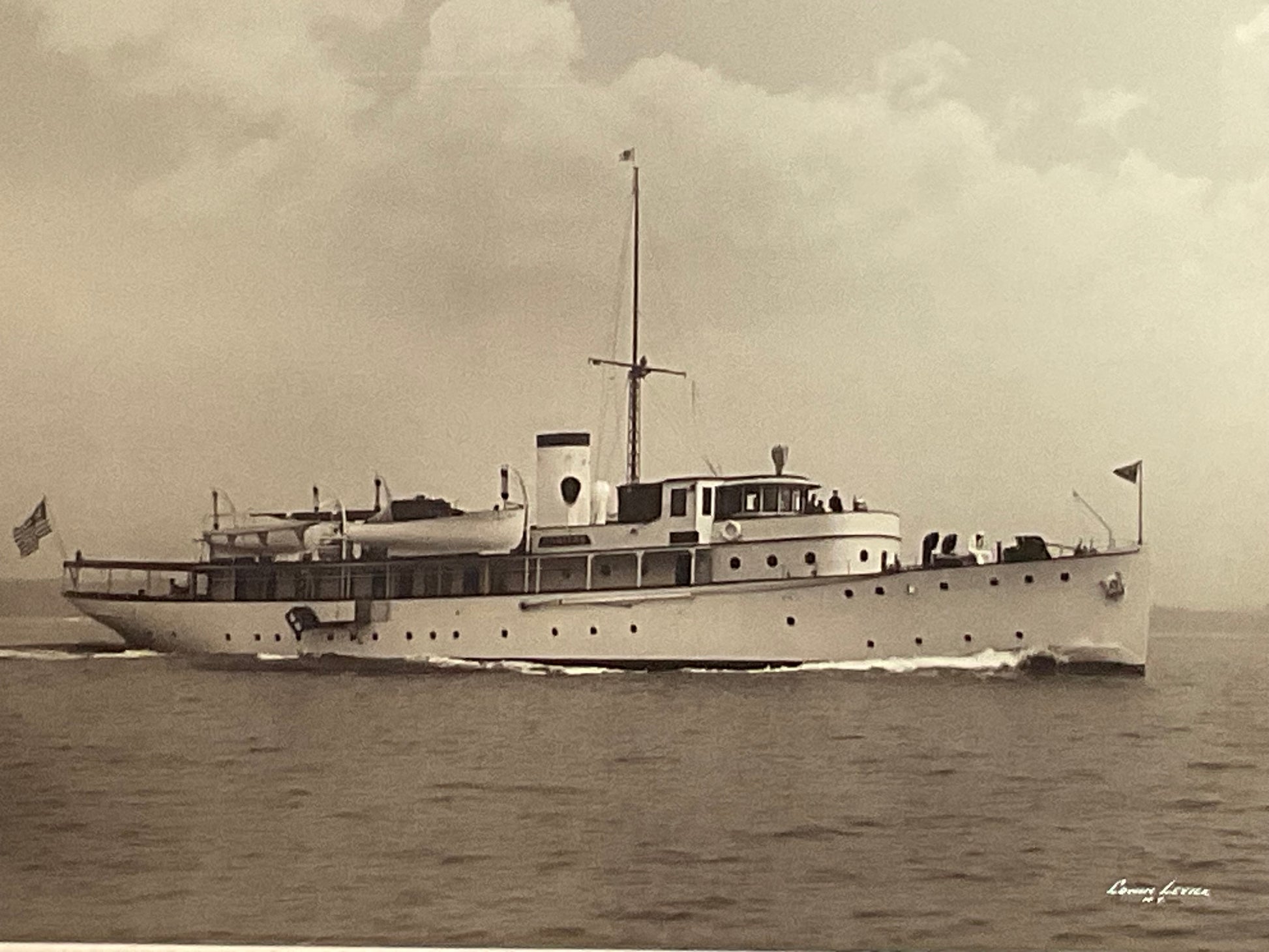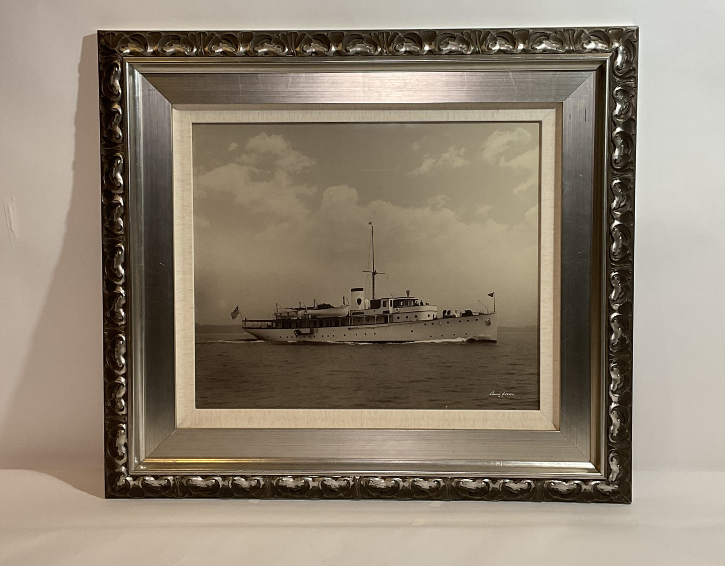 Photo of the New York Yacht Club flagship "Caritas". Caritas was built in 1922 for sugar magnate J. Percy Bartram. She was built by George Lawley and Sons in Neponset, Mass., after being designed by the naval architecture firm Cox & Stevens of New York. Her owner was once Commodore of the New York Yacht Club. The image shows Caritas cruising through calm waters. Matted and framed. Caritas is still afloat, now sailing under the name Lynie Jane, homeported in Portland, Oregon.