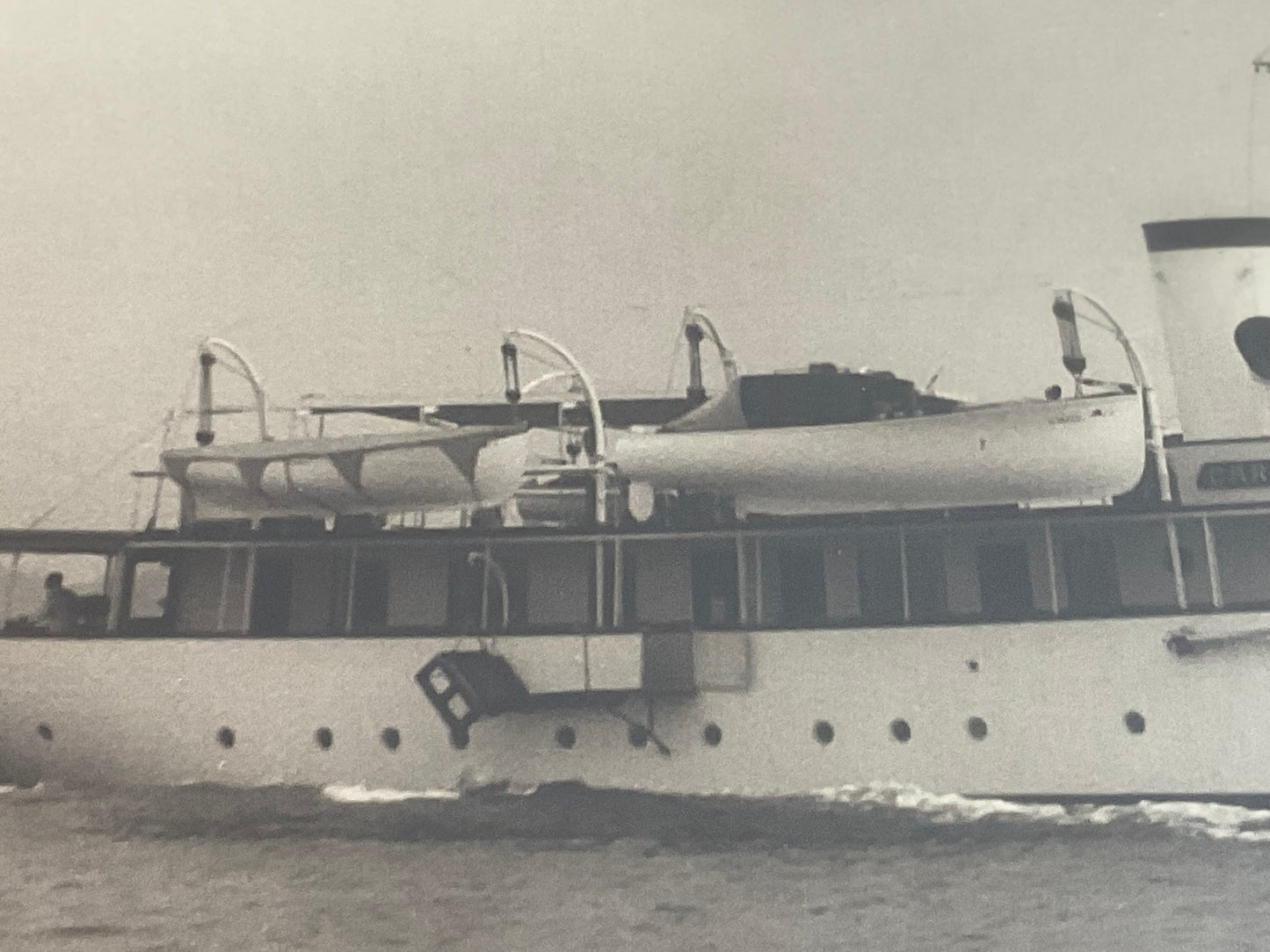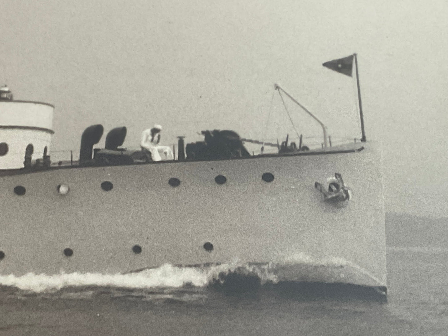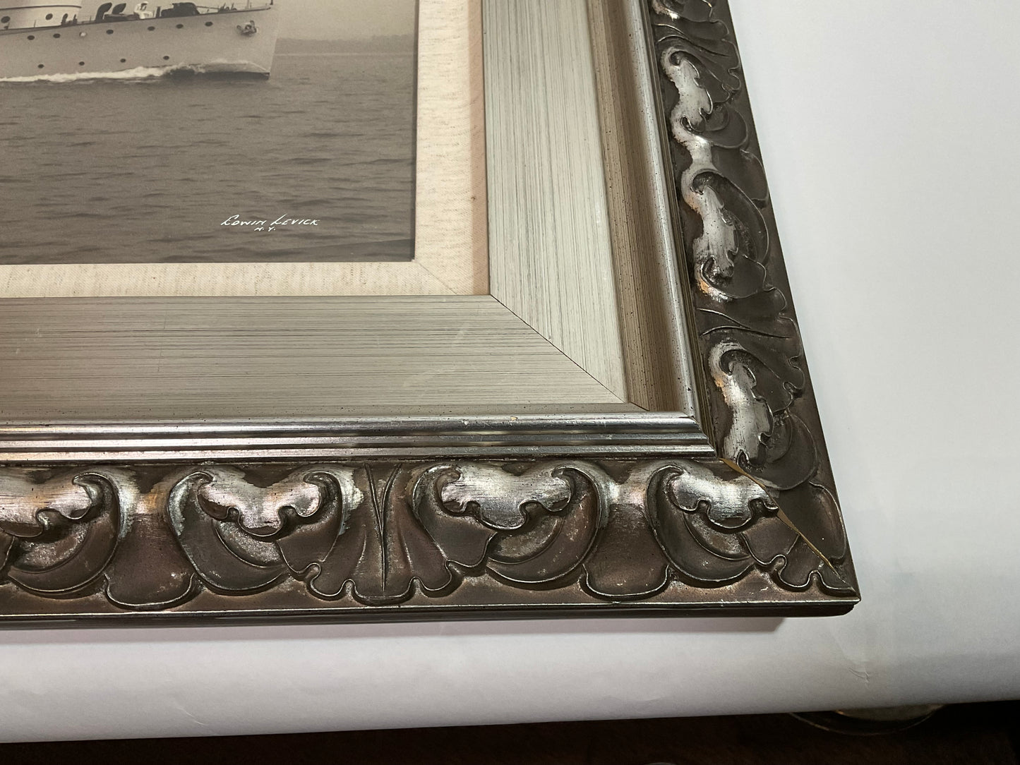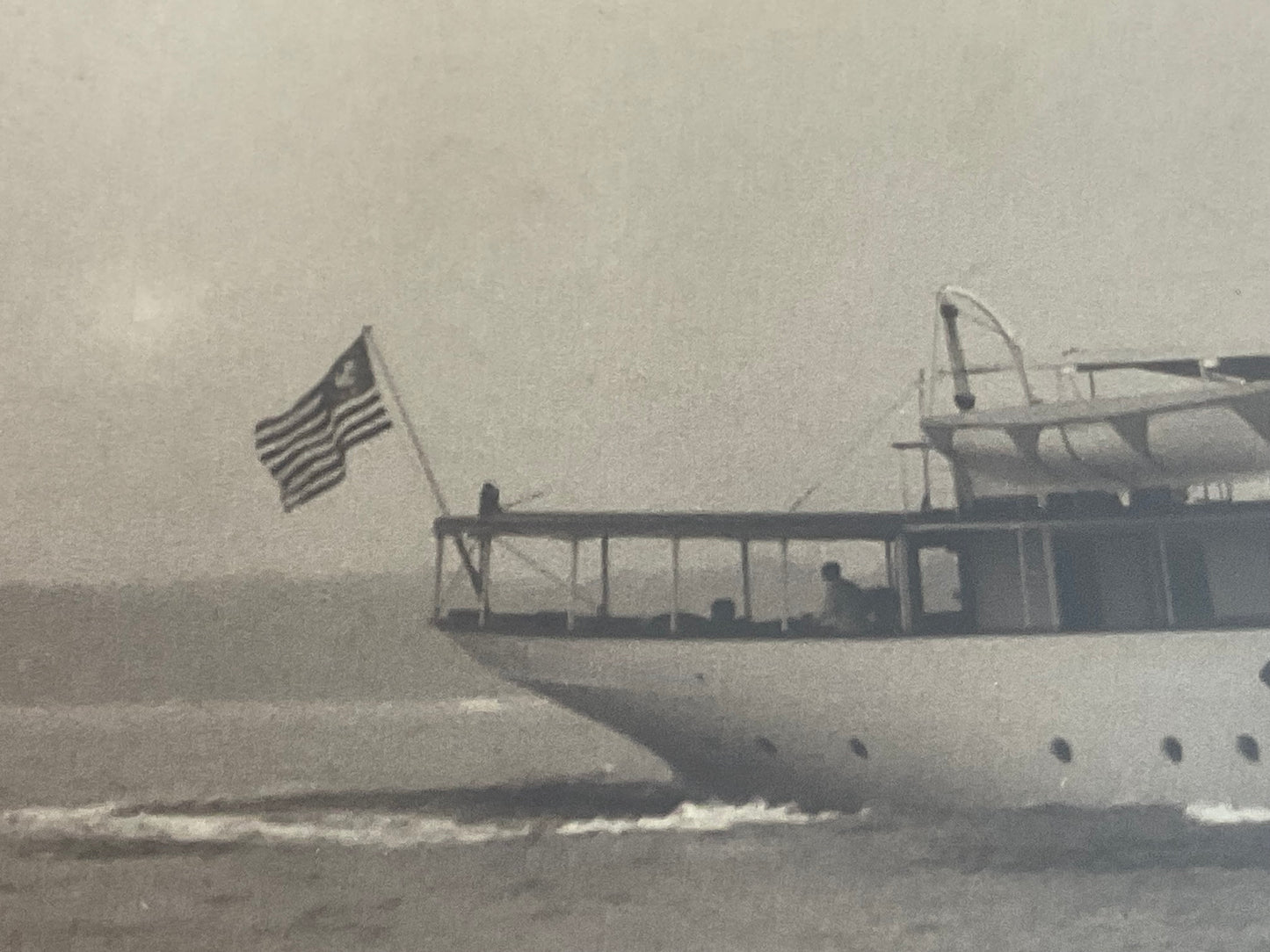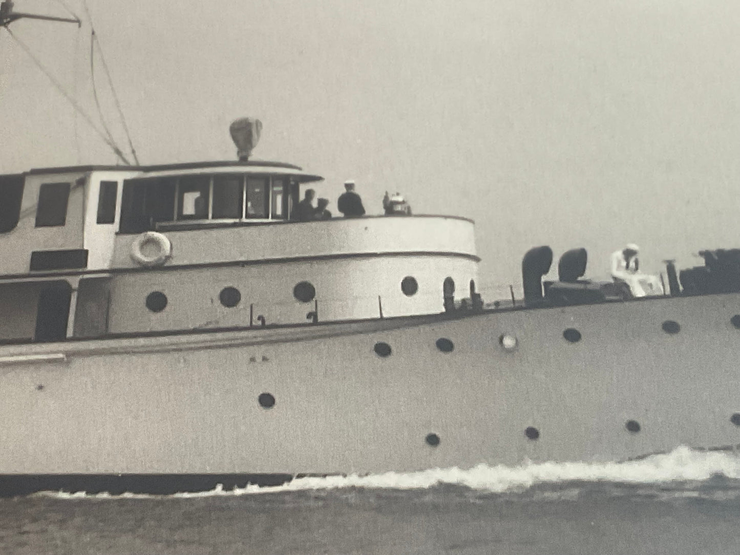 Photo of the New York Yacht Club flagship "Caritas". Caritas was built in 1922 for sugar magnate J. Percy Bartram. She was built by George Lawley and Sons in Neponset, Mass., after being designed by the naval architecture firm Cox & Stevens of New York. Her owner was once Commodore of the New York Yacht Club. The image shows Caritas cruising through calm waters. Matted and framed. Caritas is still afloat, now sailing under the name Lynie Jane, homeported in Portland, Oregon.