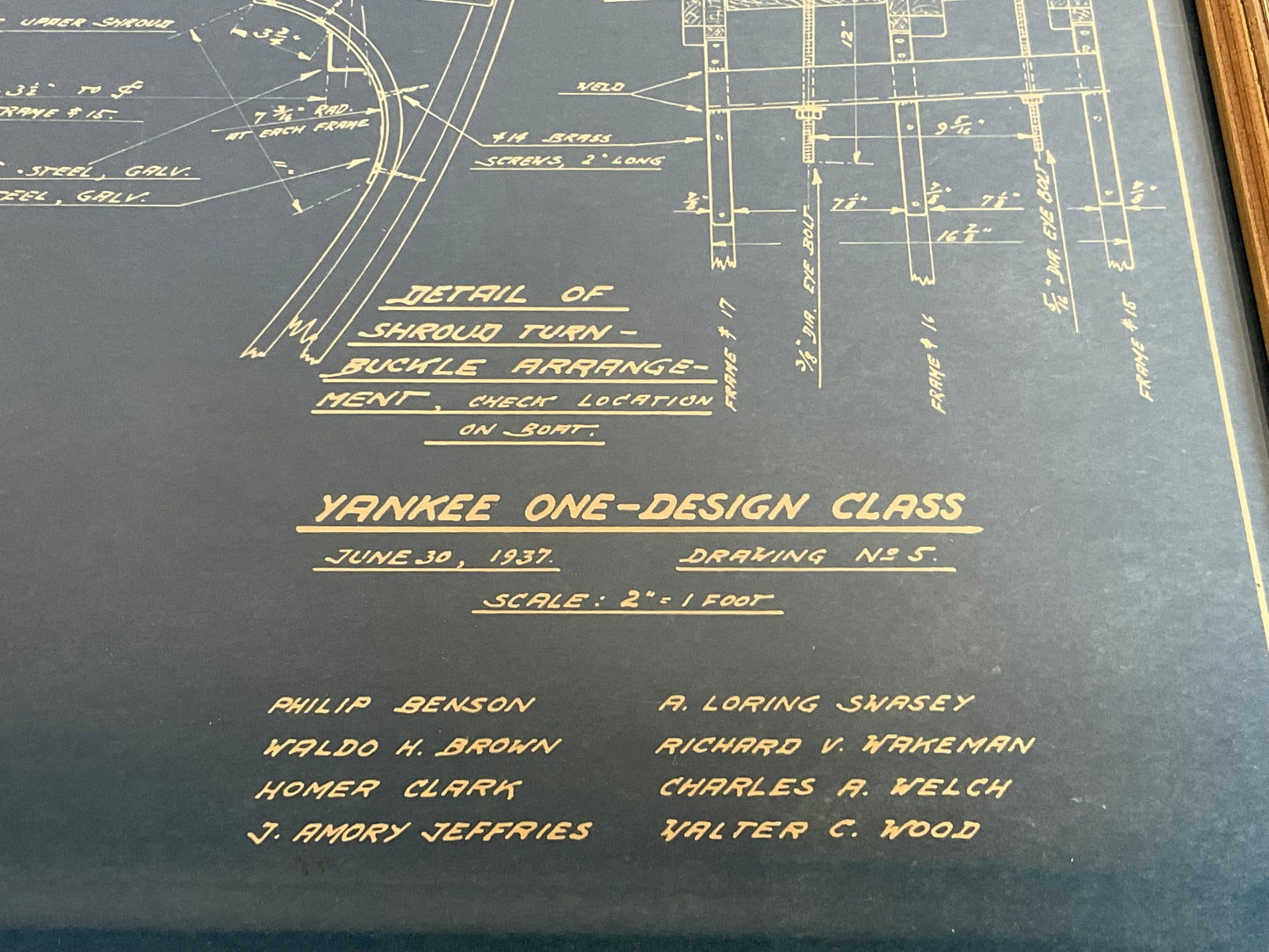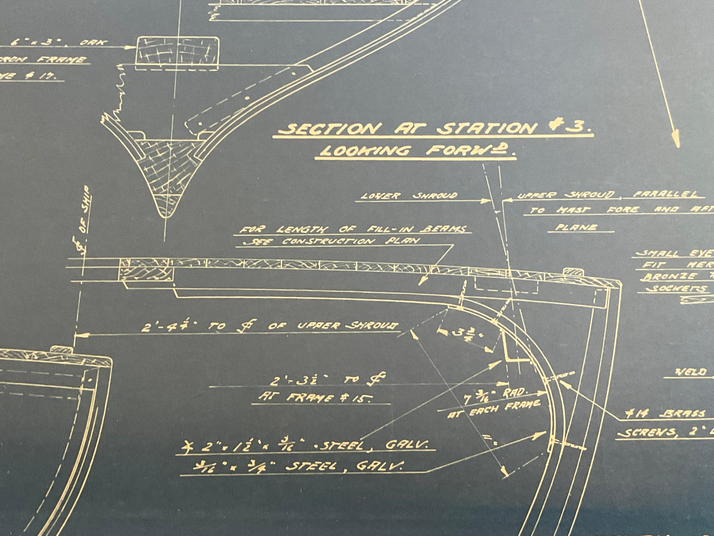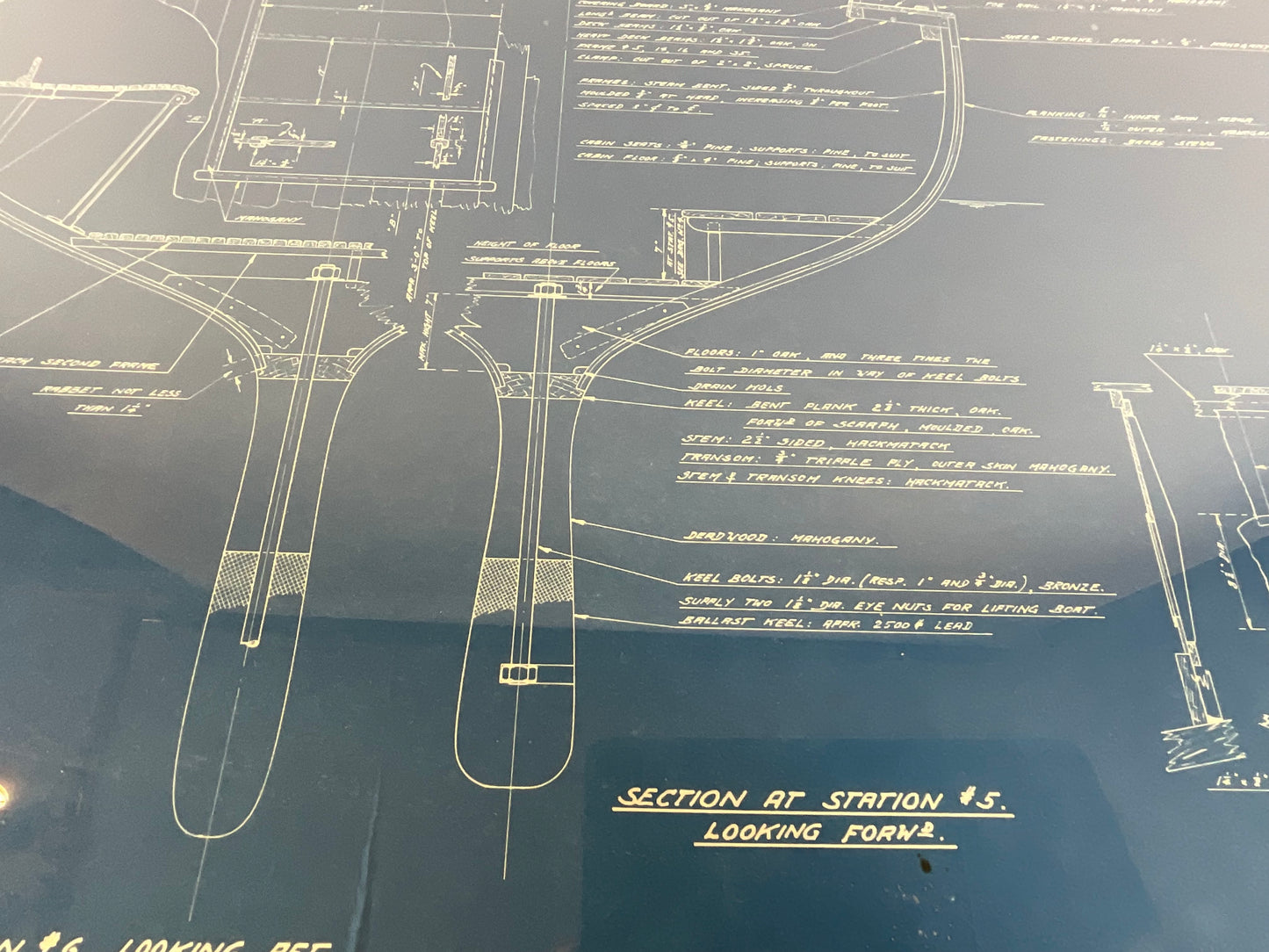 Hull section blueprint for the Yankee one design class. This is a very detailed blueprint with an incredible amount of information. It shows hull cross sections with materials, dimensions, thicknesses, etc.